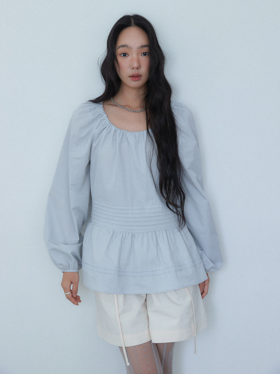 COTTON PINTUCK FLARE BLOUSE [ PALE BLUE ]