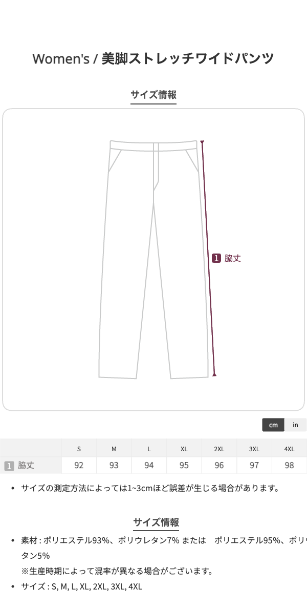 3L:ウエスト(ヌード寸)77~83、ヒップ(ヌード寸)103~109、総丈96