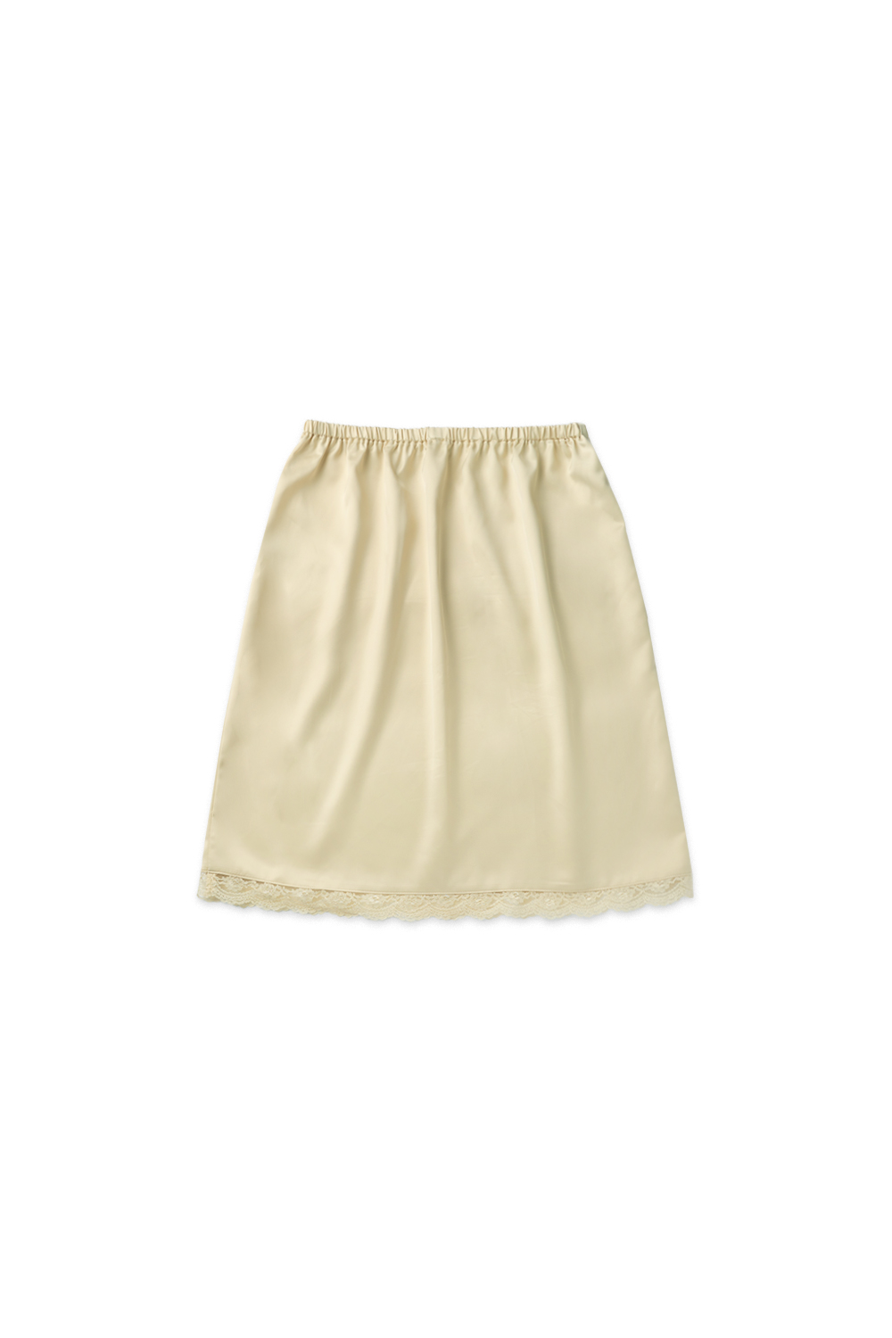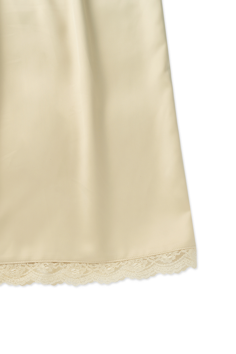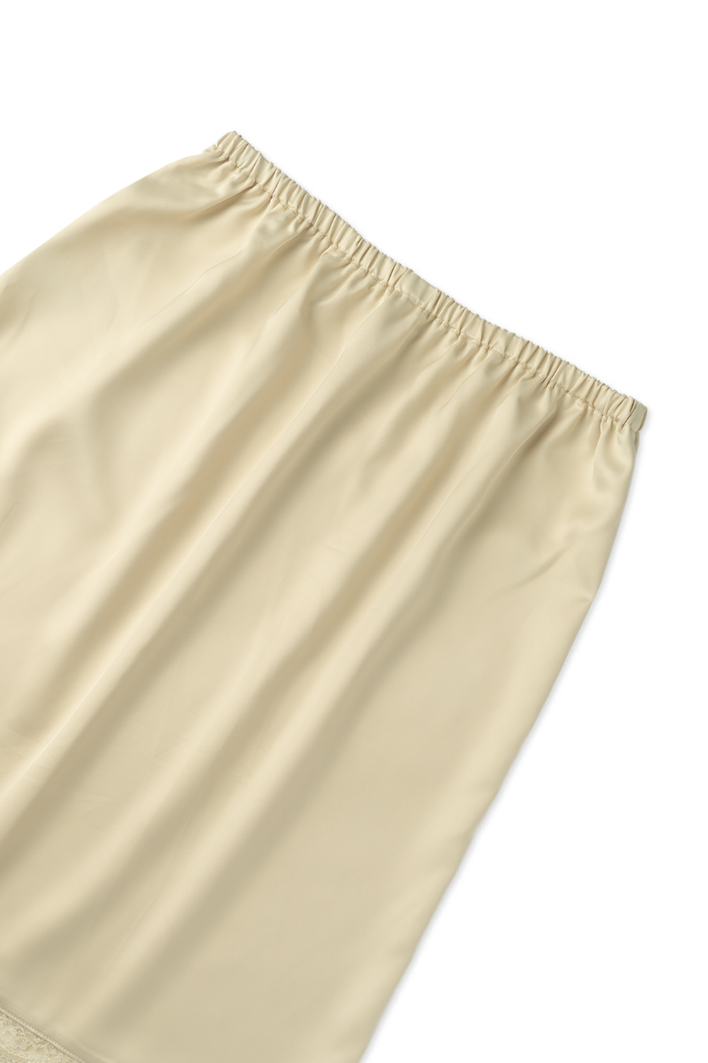 ミニマルなサテンシルエットに、裾のレースディテールをプラスした「Satin Midi Skirt」です。