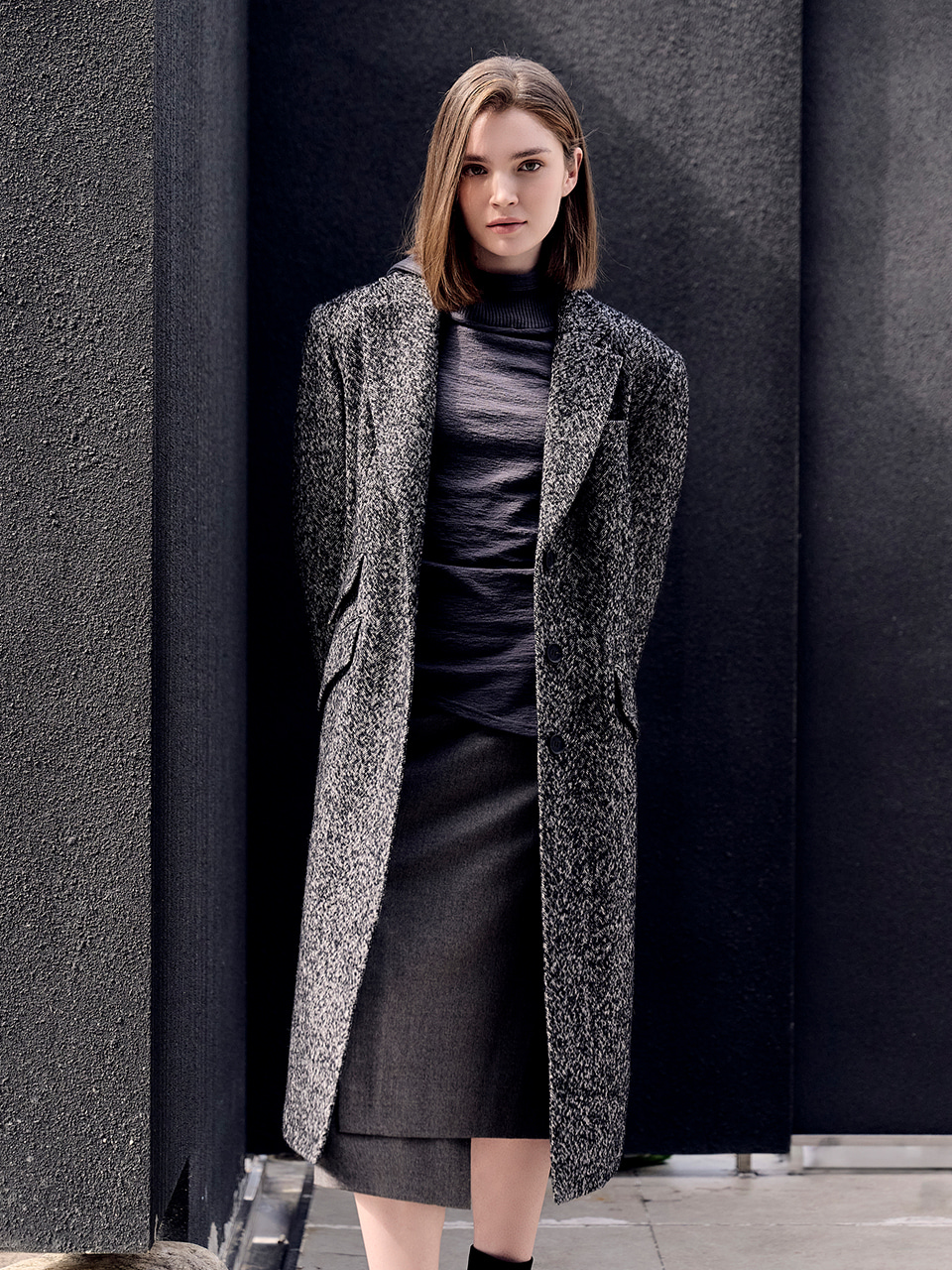 재생 울에 섬세한 루프를 넣어 제직된 헤링본 조직이 고급스러운 빈티지감을 표현했습니다.