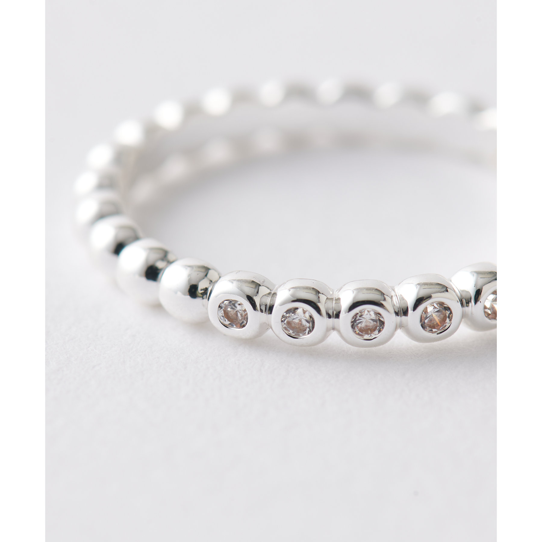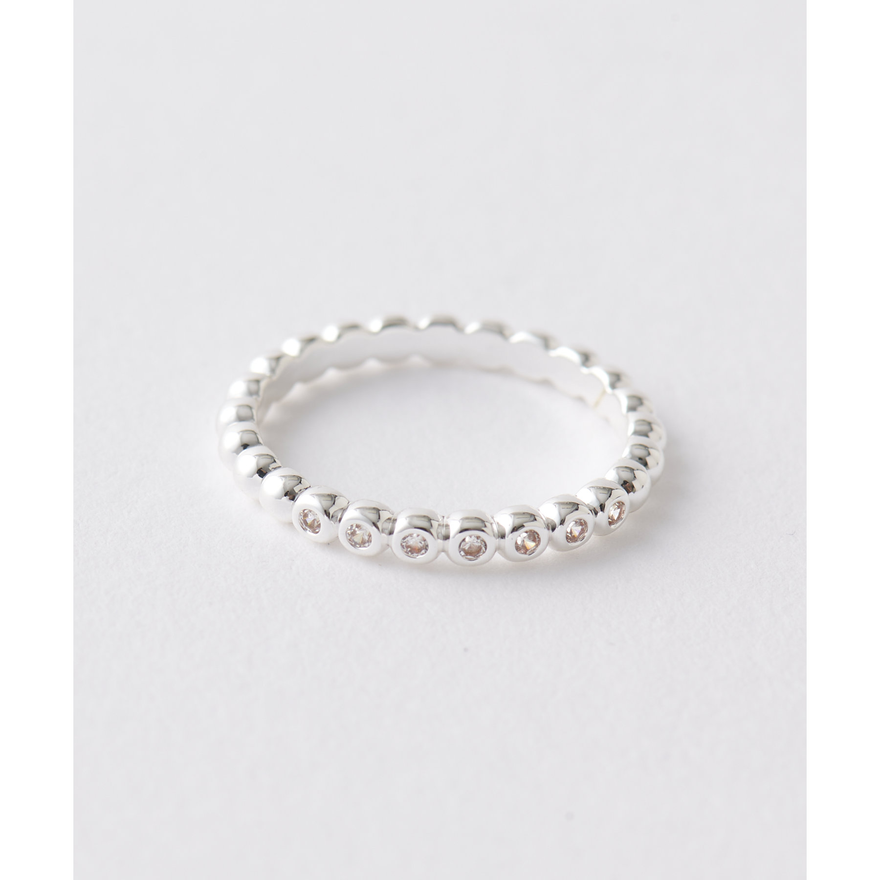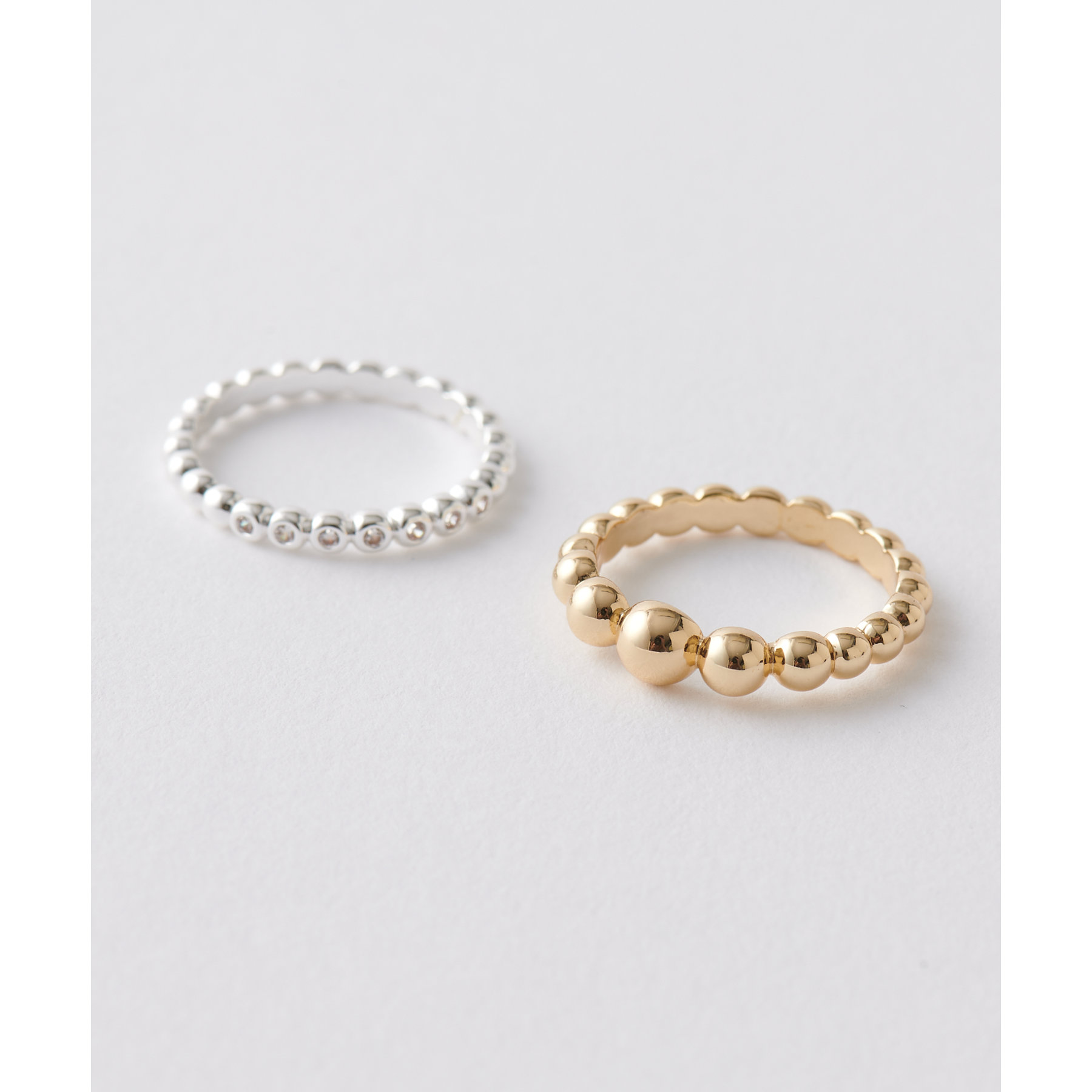 サイズの異なるメタルボールが連なったリングと、屈折率がダイヤモンドに近く、硬度もコランダムほどあるキュービックジルコニアをあしらったリングのセットアイテム。単体でつけるのはもちろん、重ね付けしていただくのもおすすめです♩
