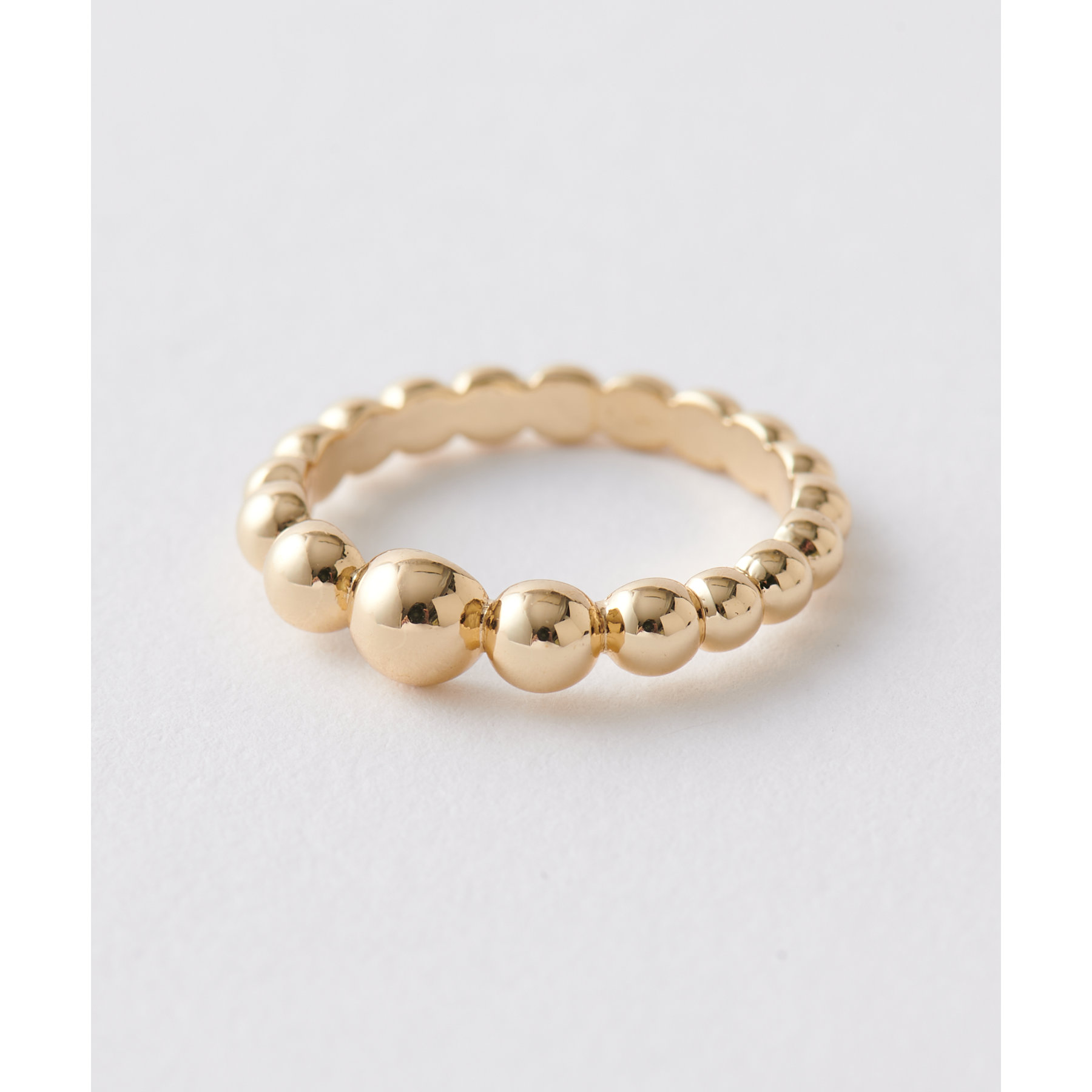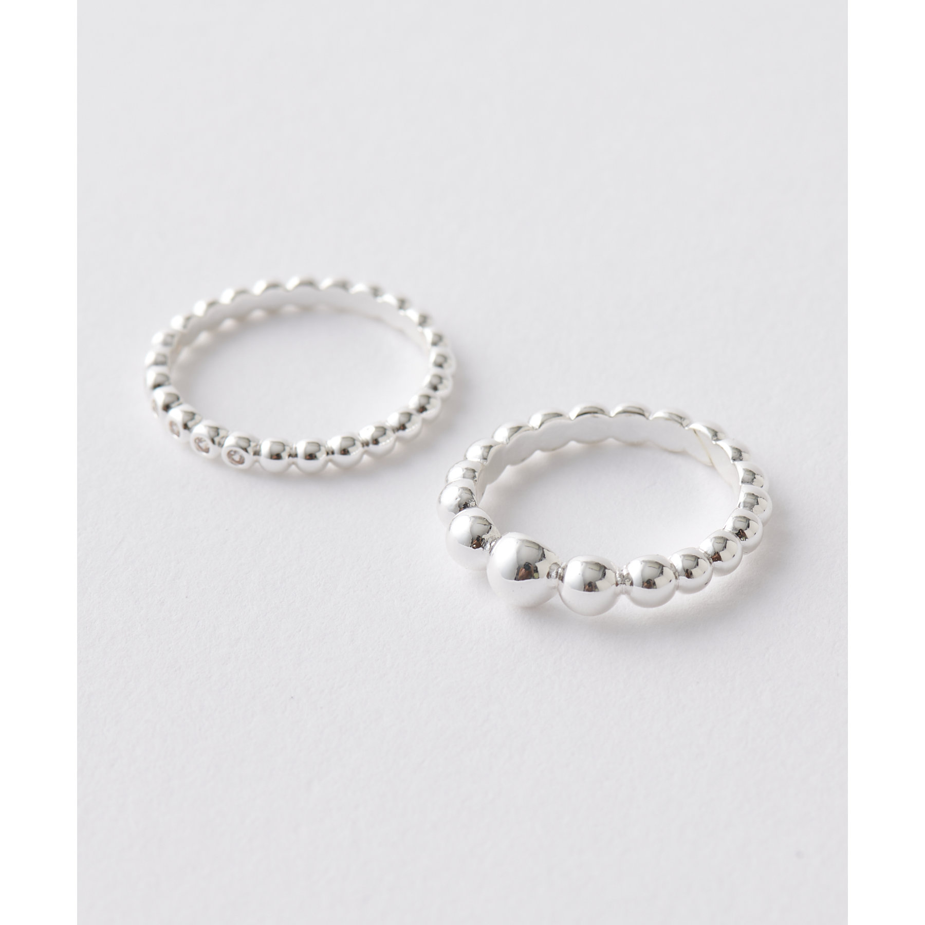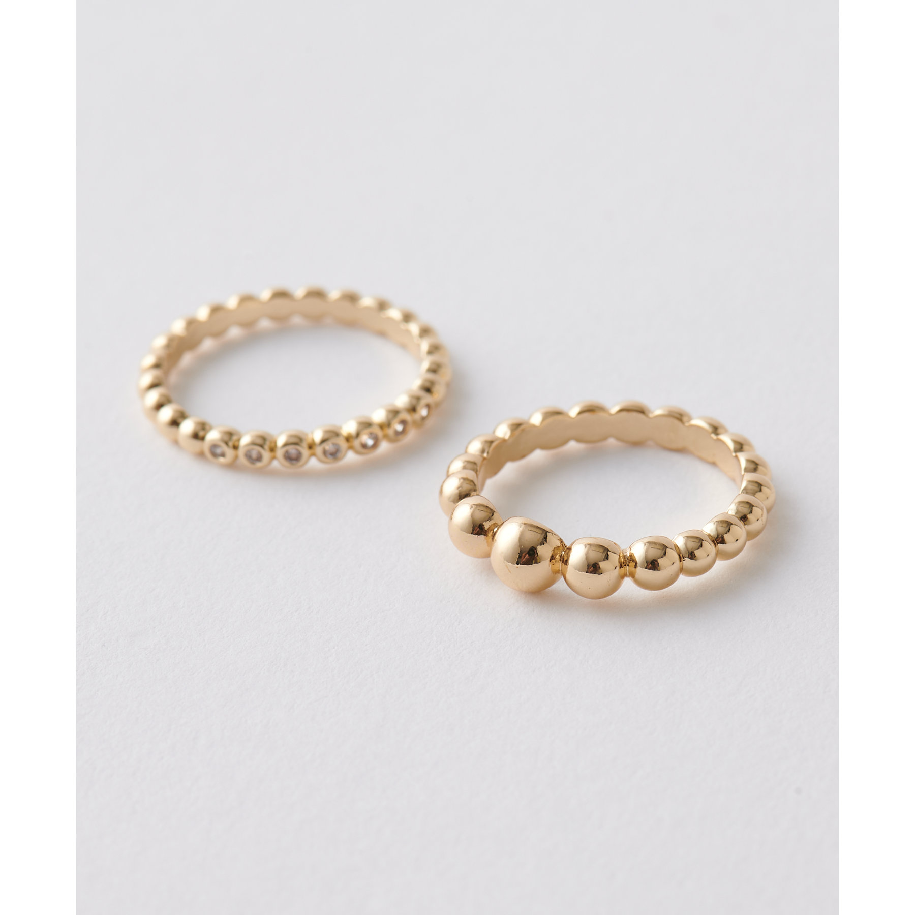 サイズの異なるメタルボールが連なったリングと、屈折率がダイヤモンドに近く、硬度もコランダムほどあるキュービックジルコニアをあしらったリングのセットアイテム。単体でつけるのはもちろん、重ね付けしていただくのもおすすめです♩