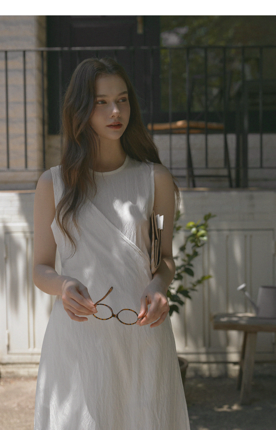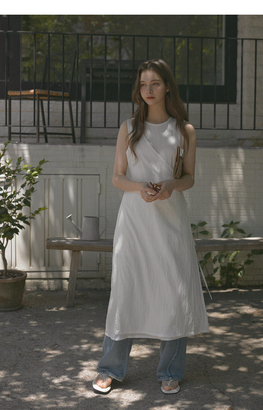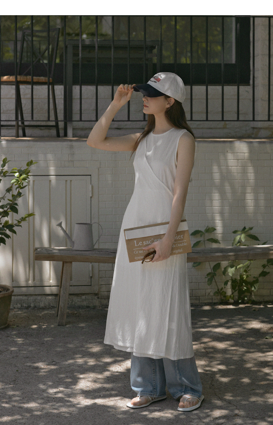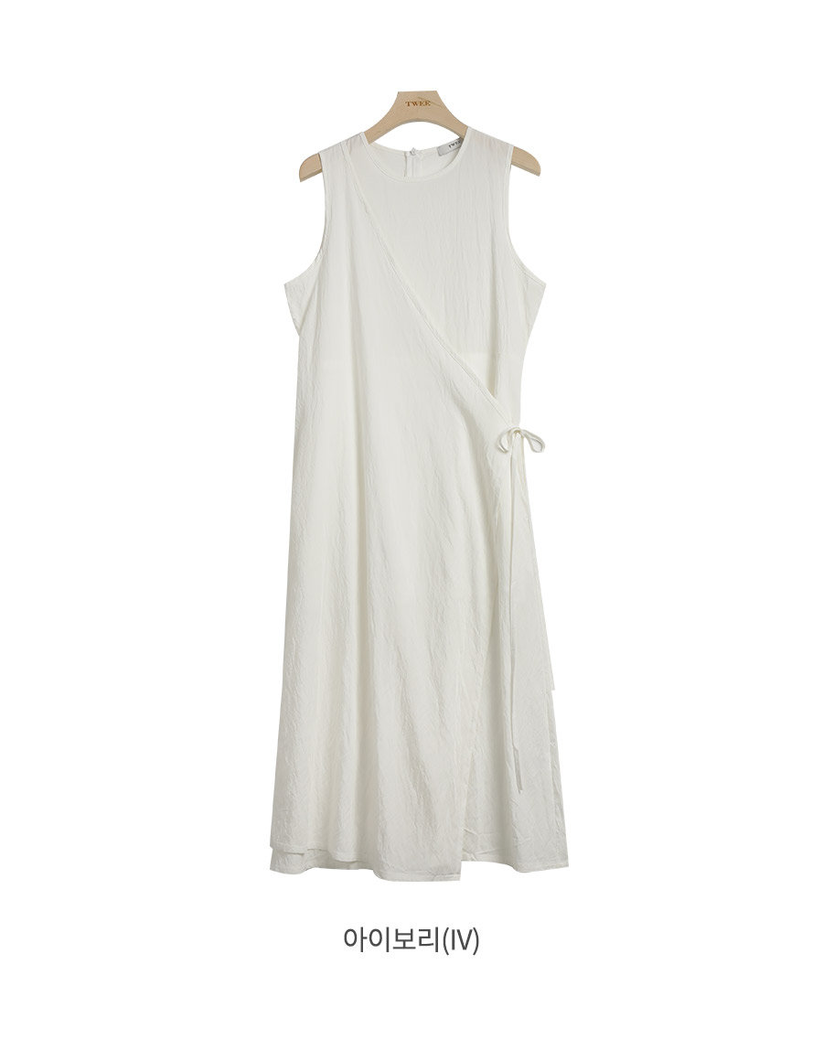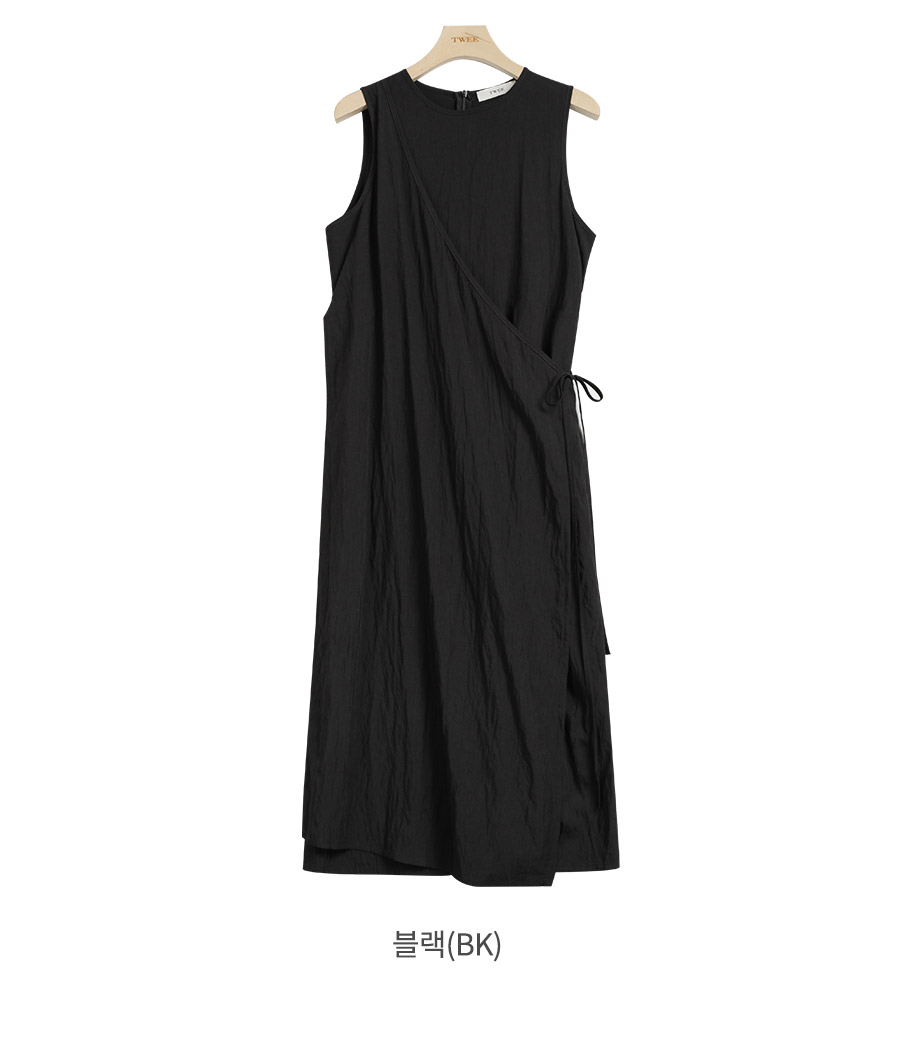 세련된 무드 연출 가능한 슬리브리스 랩 원피스입니다.