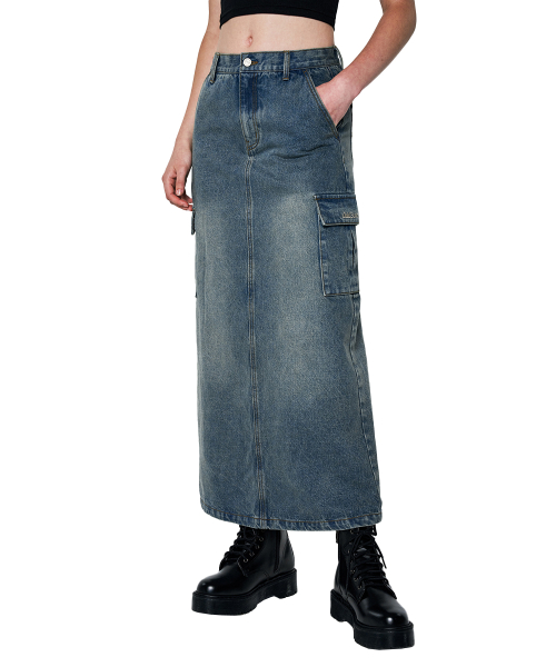 Sand Washing Cargo Denim Long Skirt - blue