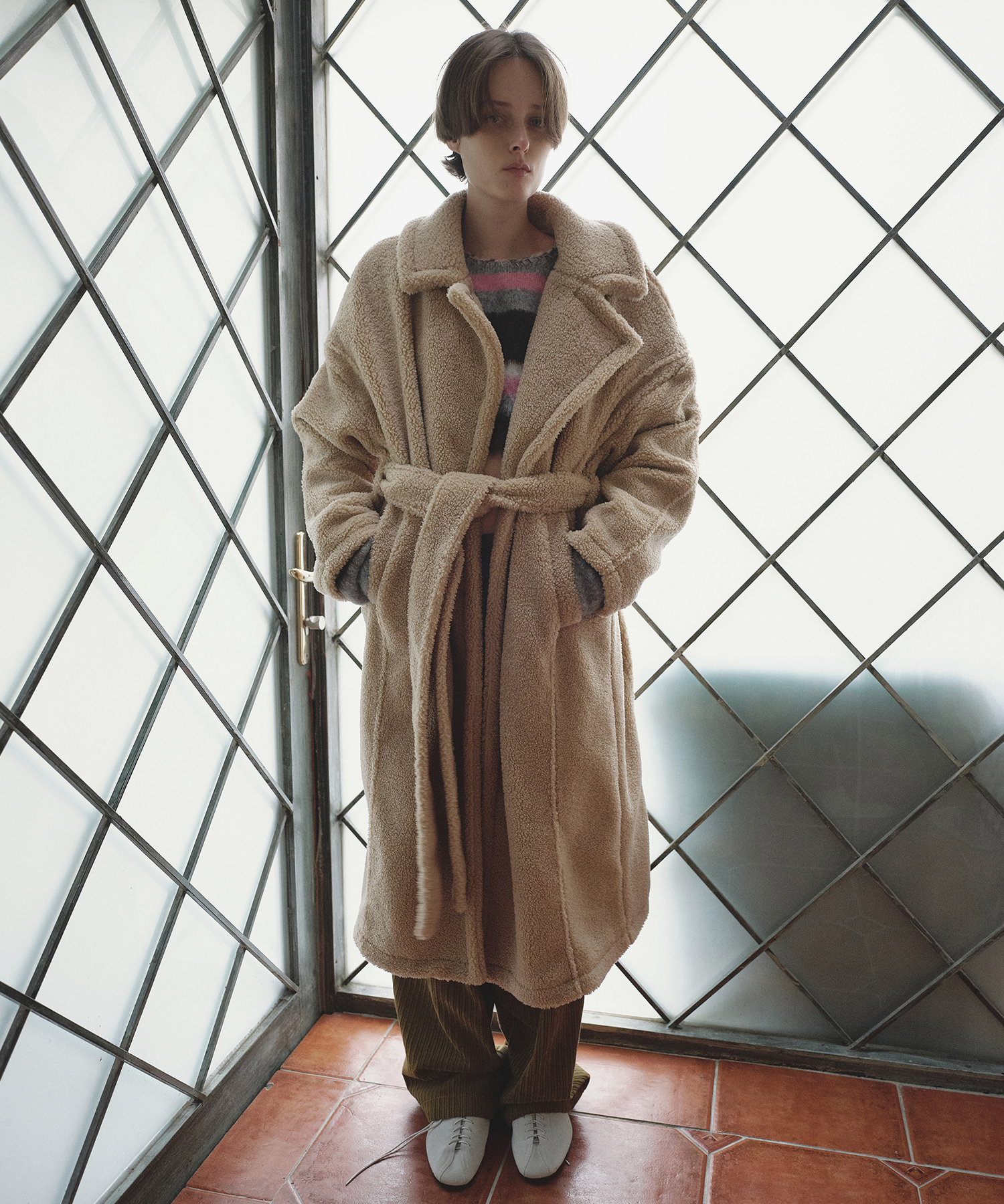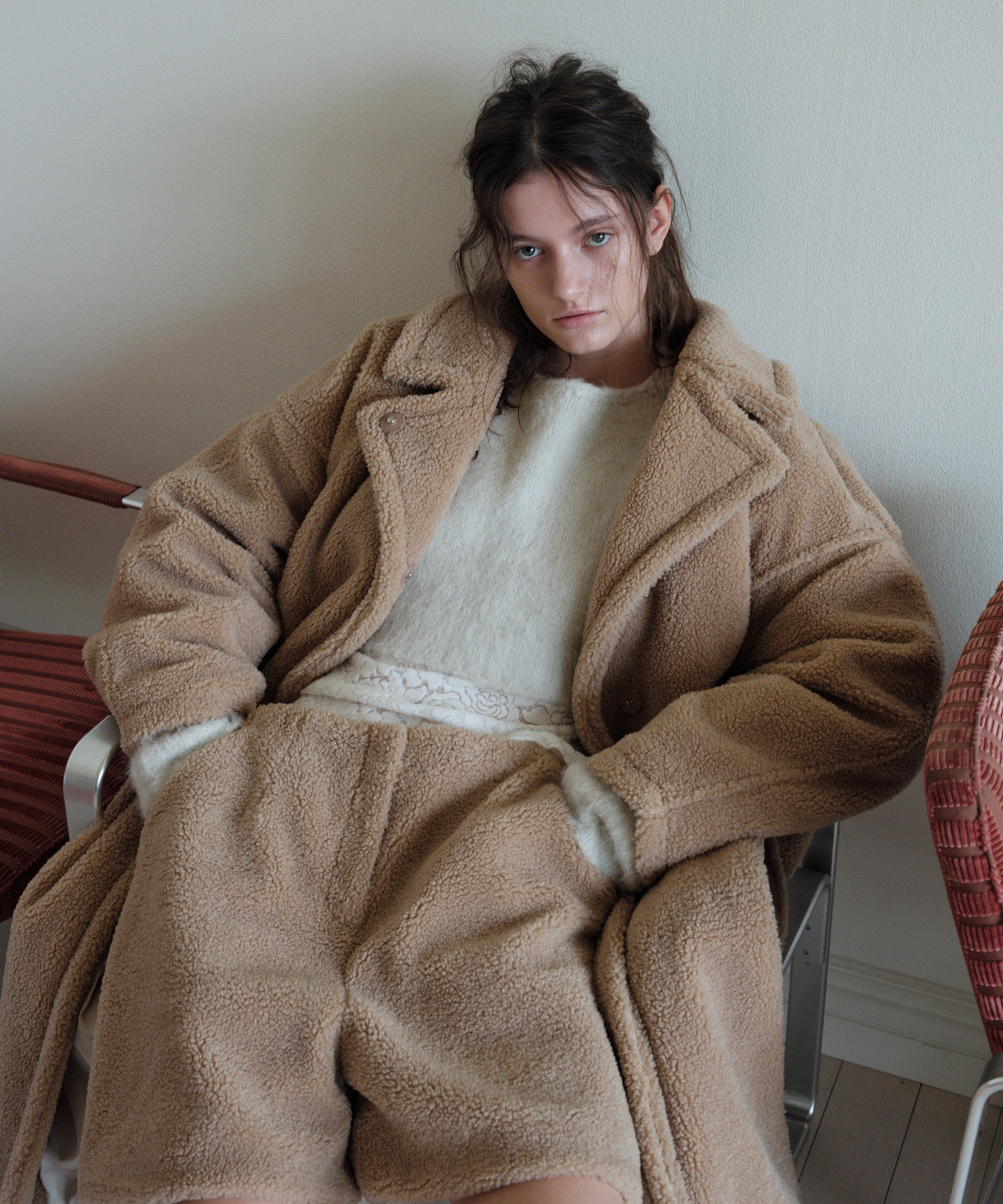 柔らかくふんわりとしたテクスチャーのシアリング素材で仕立てられたベルト付きロングコートです。
