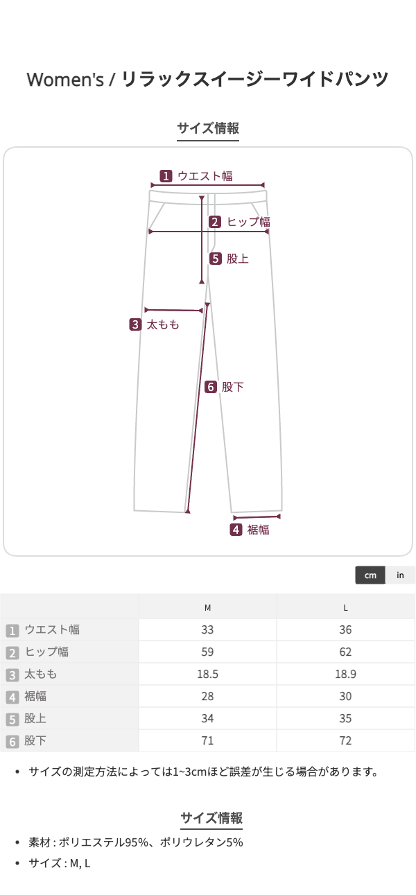M:ウエスト66、ヒップ118、股上34、わたり幅37、裾幅28