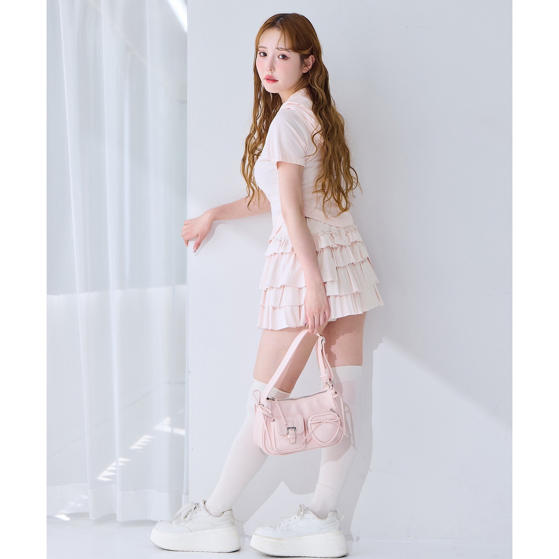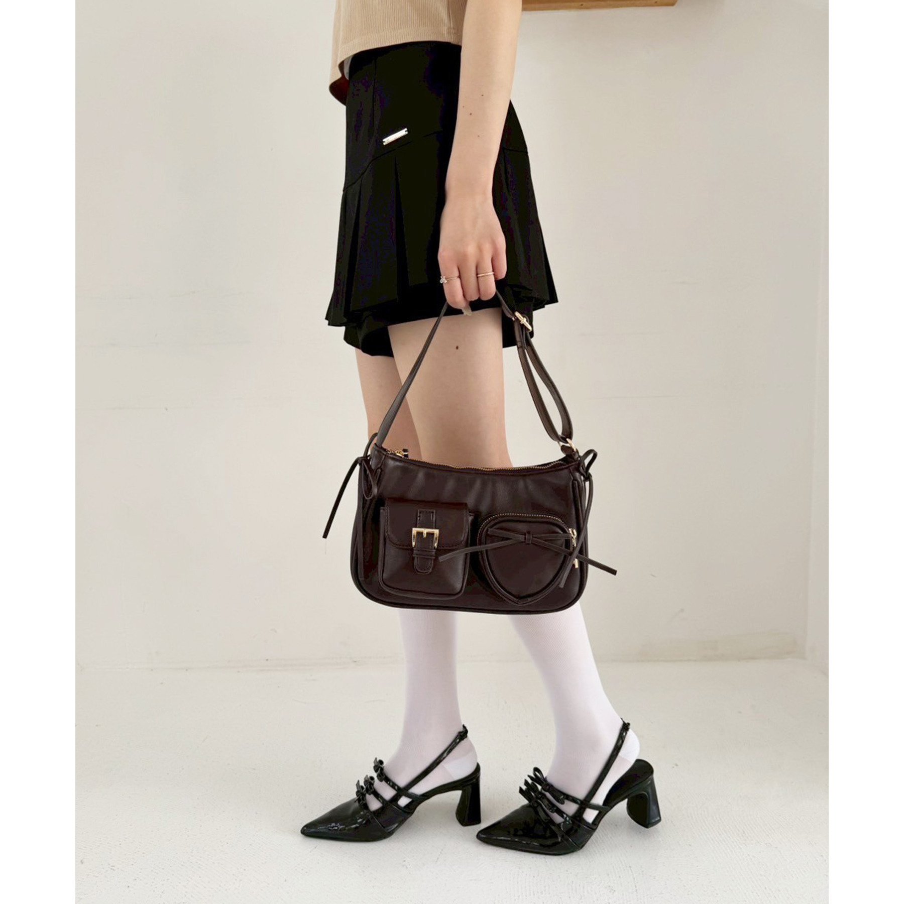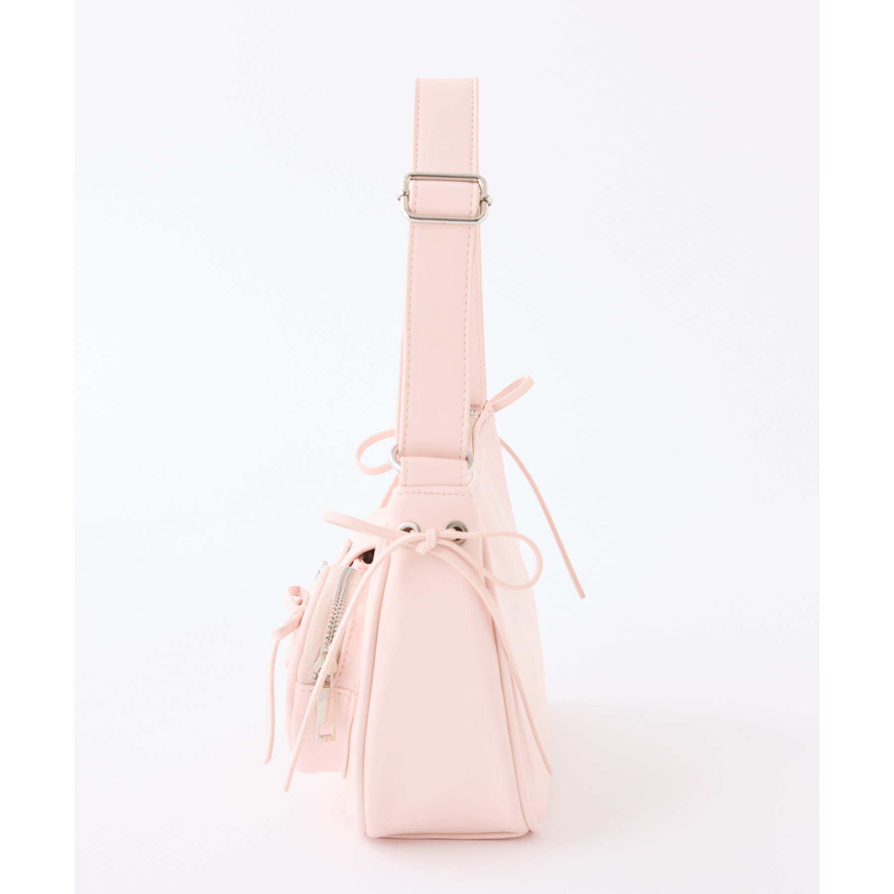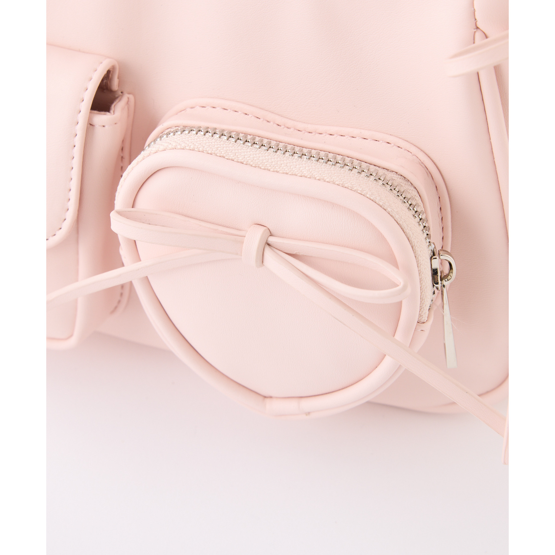 サイドのリボンとハートのポケットで可愛らしい印象に。