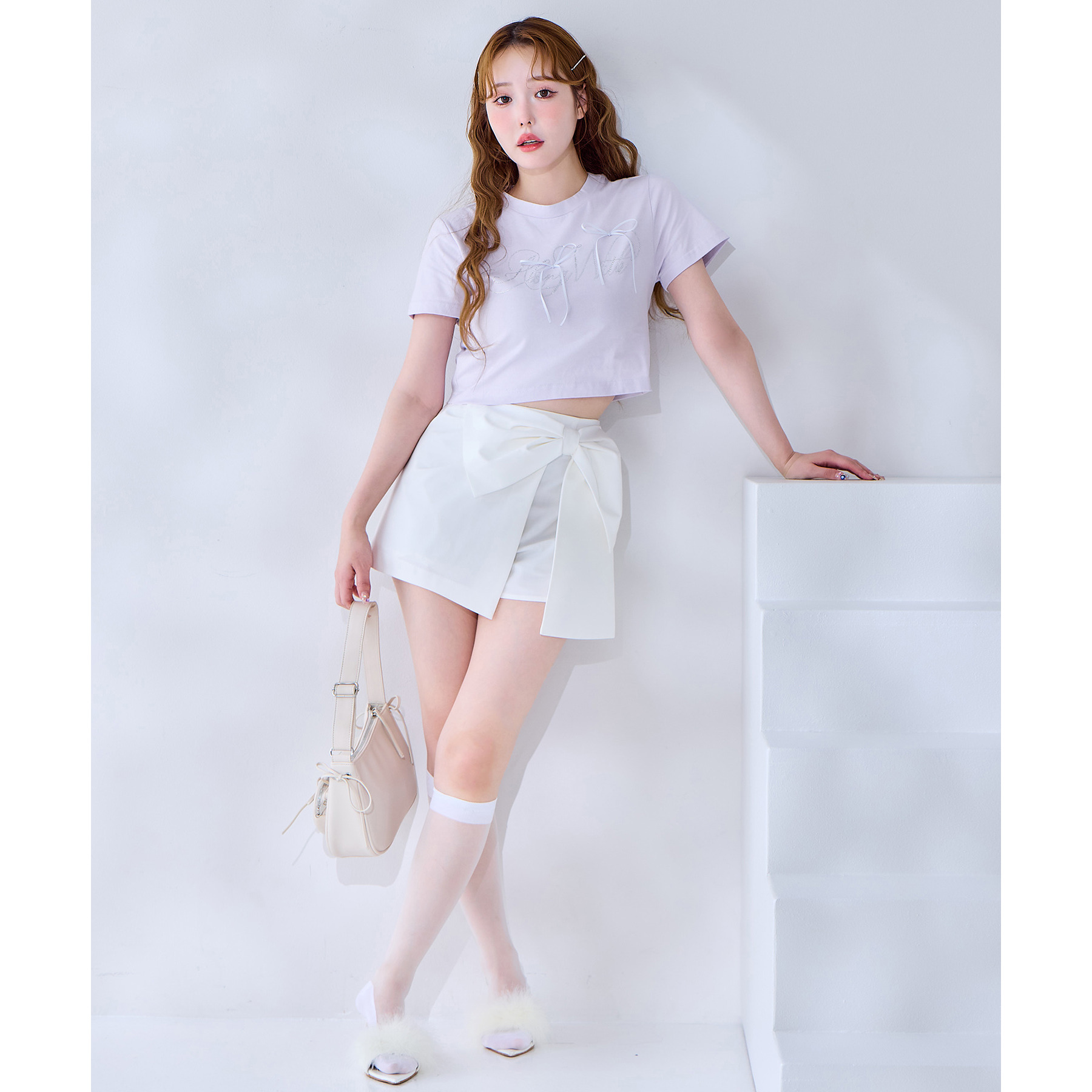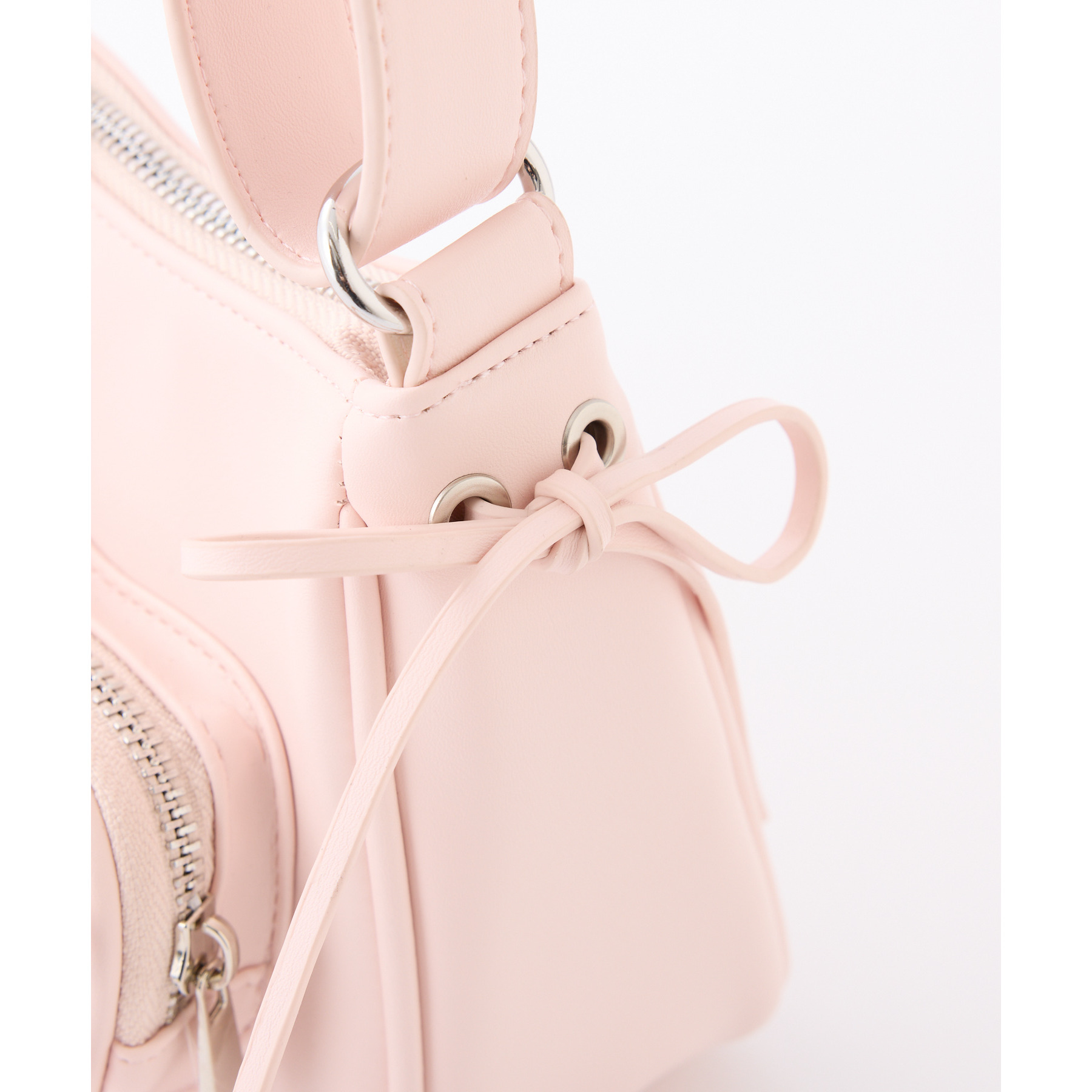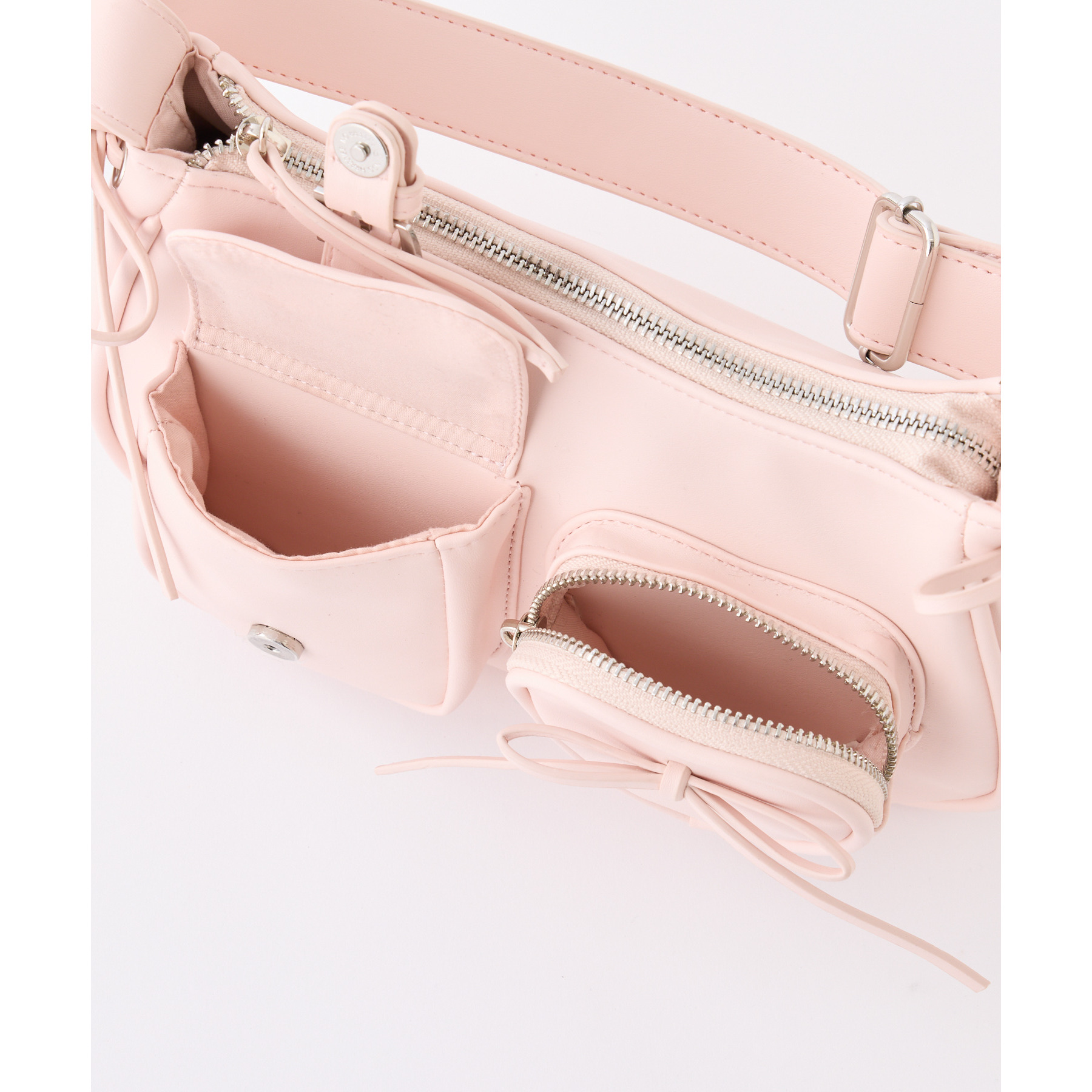 サイドのリボンとハートのポケットで可愛らしい印象に。