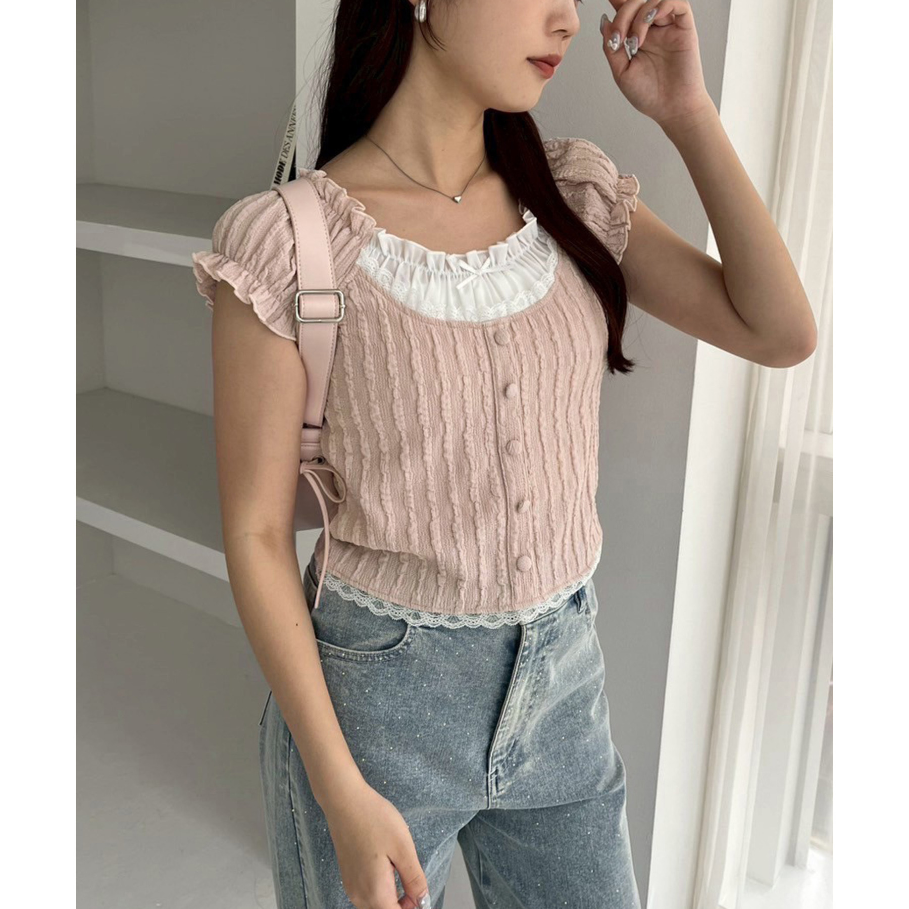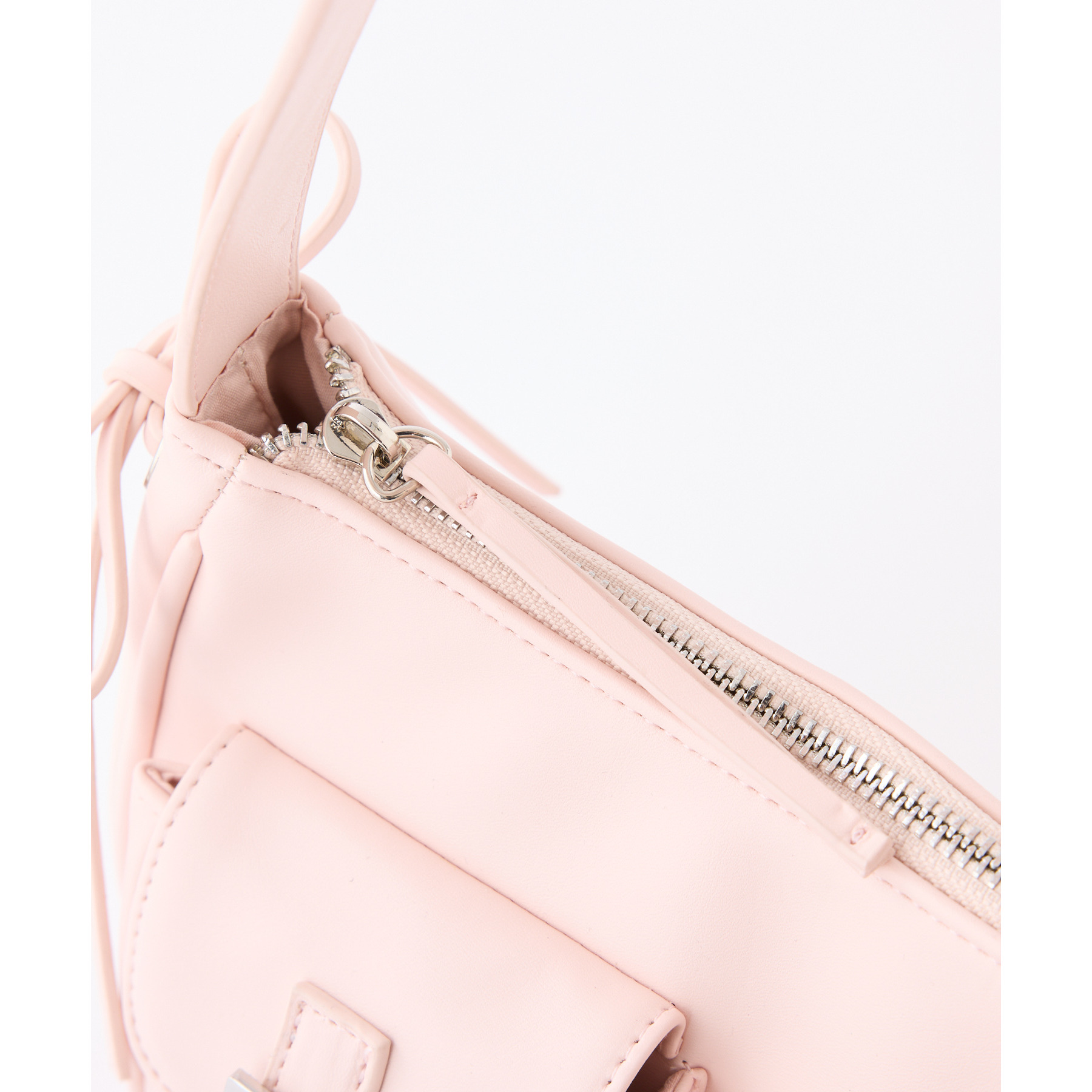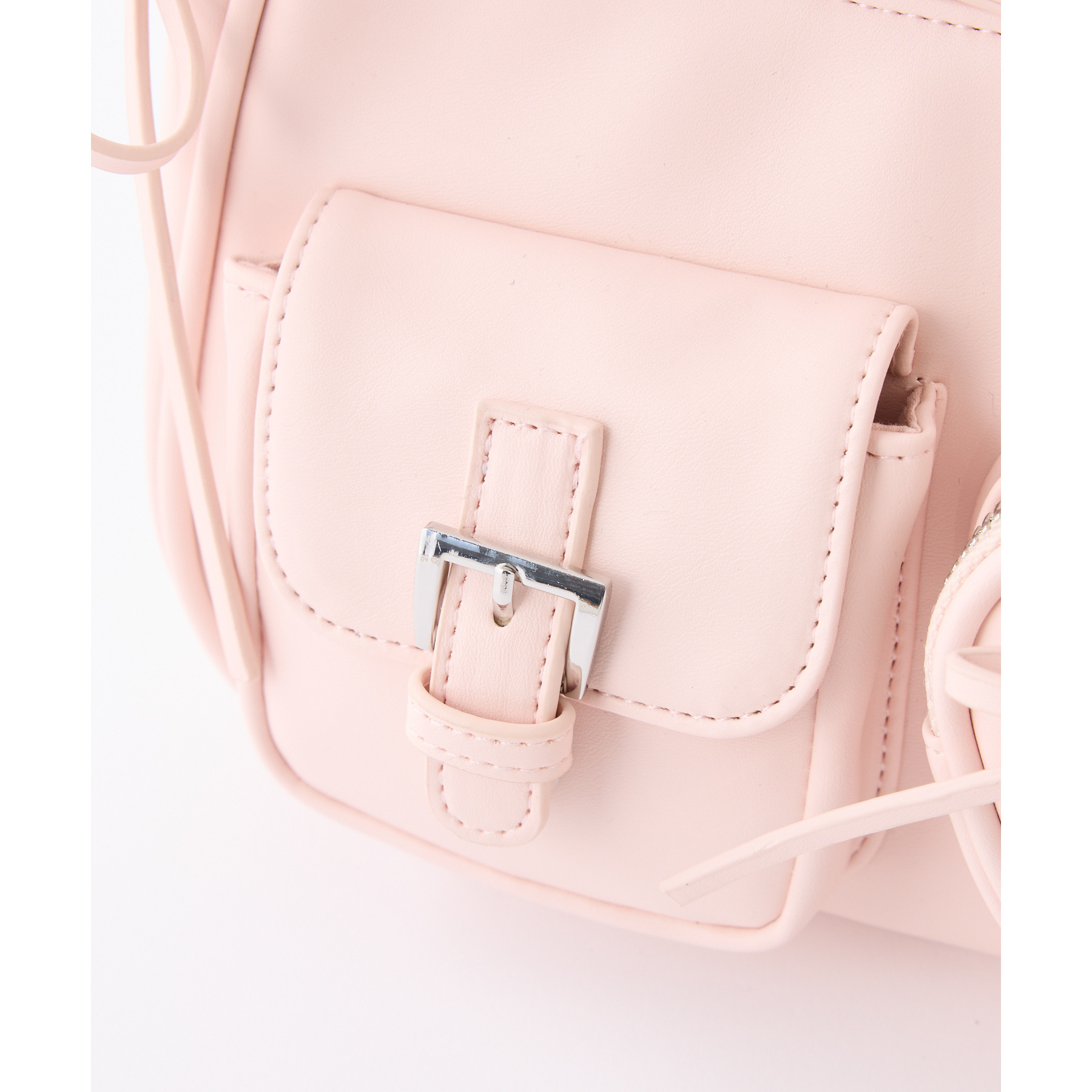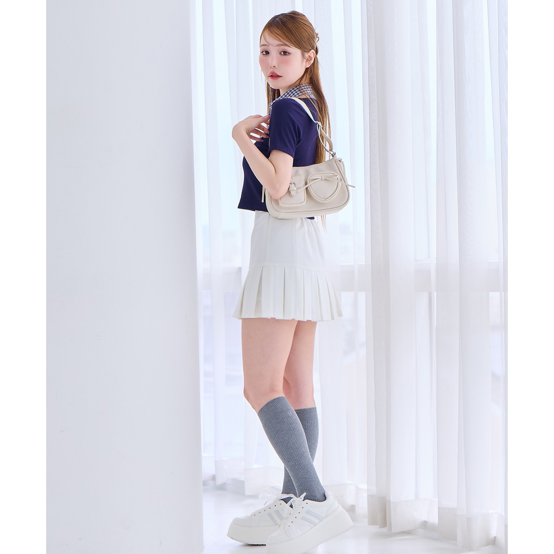 サイドのリボンとハートのポケットで可愛らしい印象に。