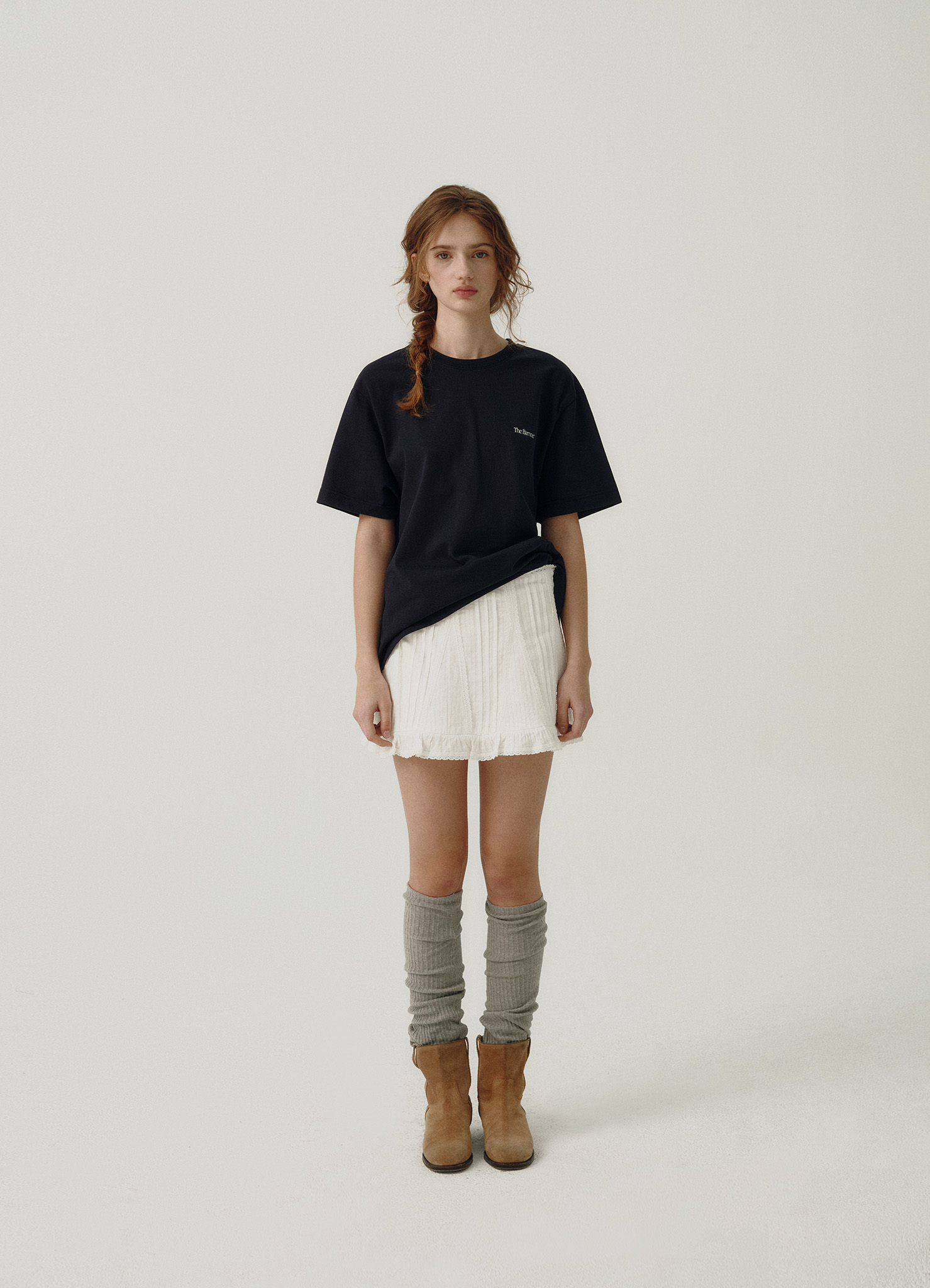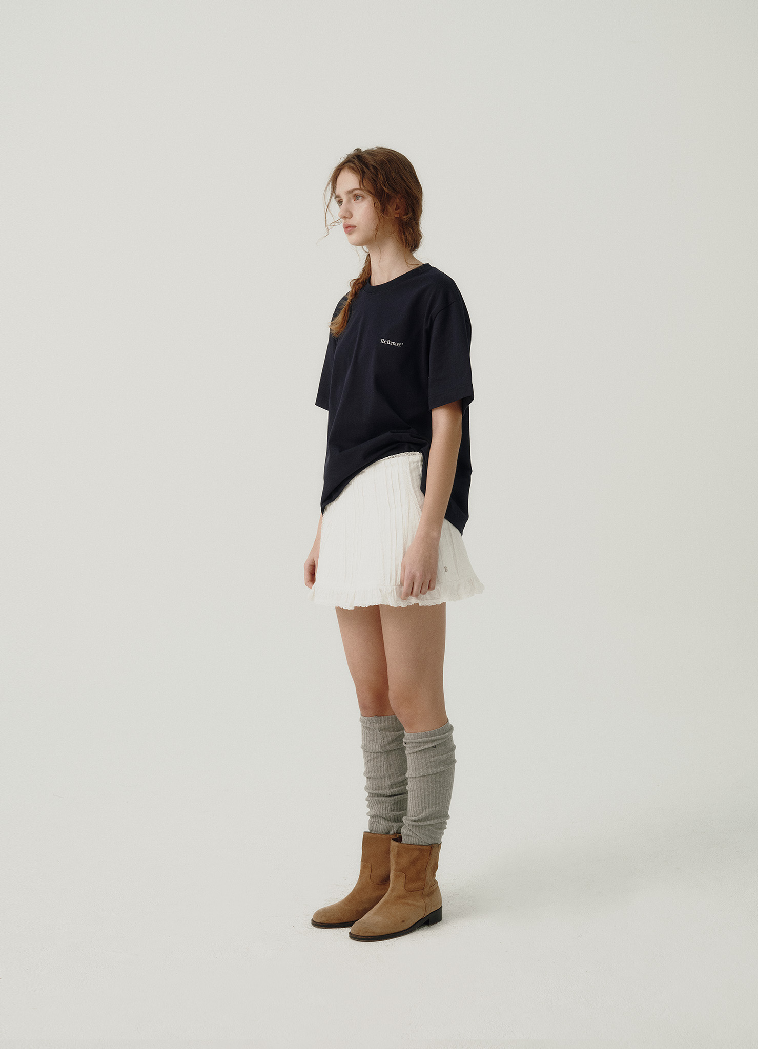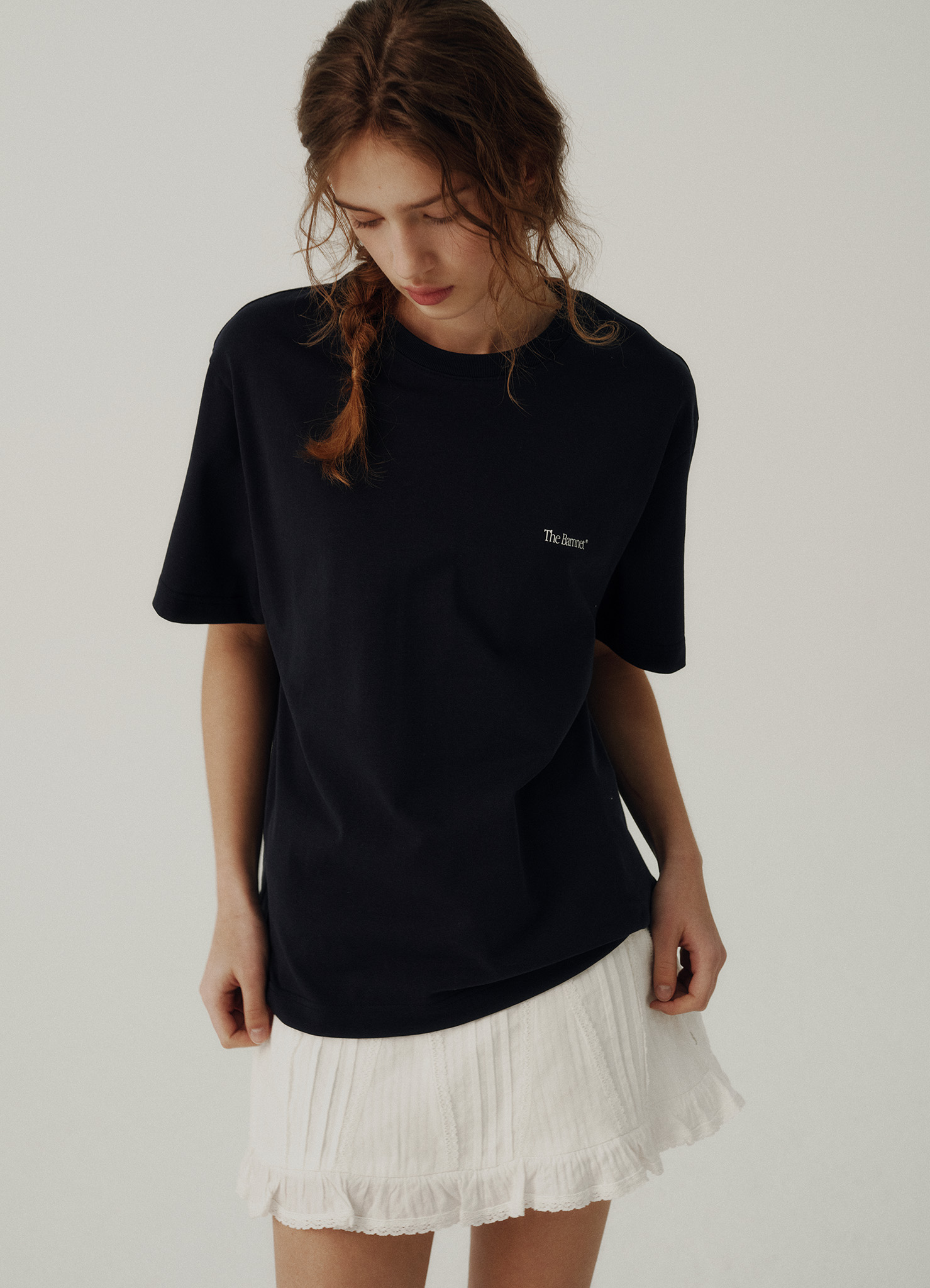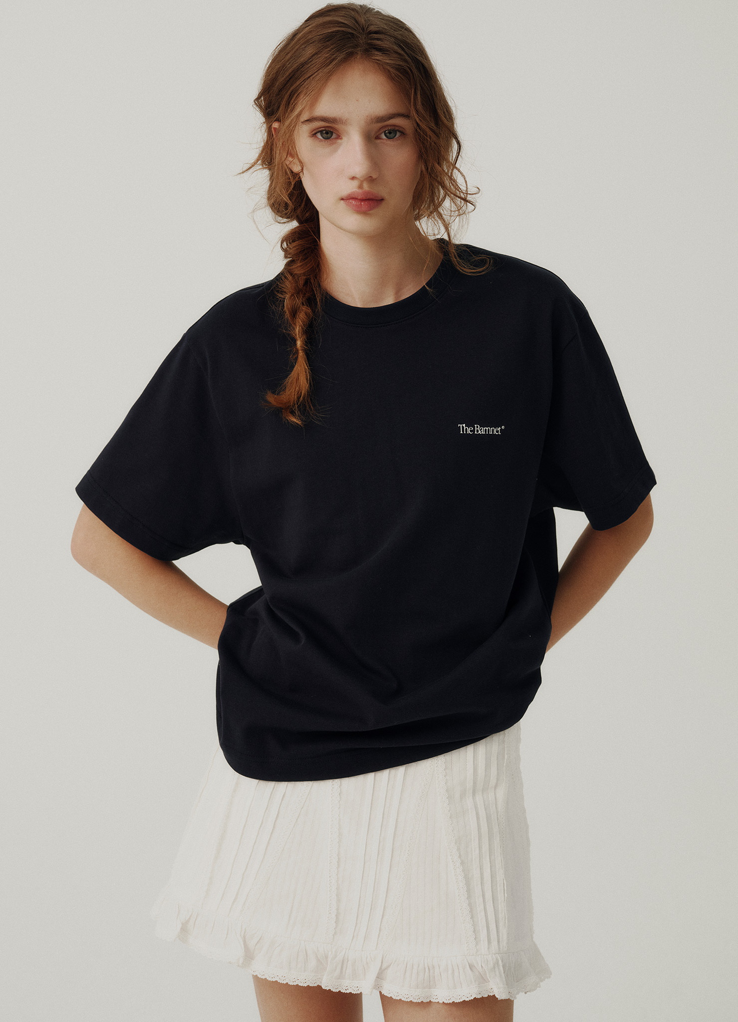 ラウンドネック、ドロップショルダー、ハーフスリーブ仕様のTシャツタイプ。