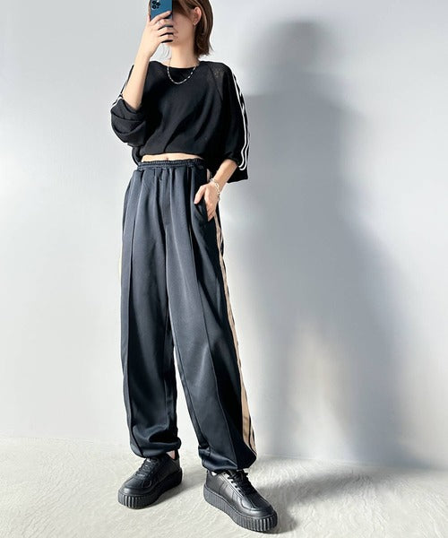 男性はワイドなカーゴパンツやトラックパンツと合わせたストリートスタイルがおすすめ。