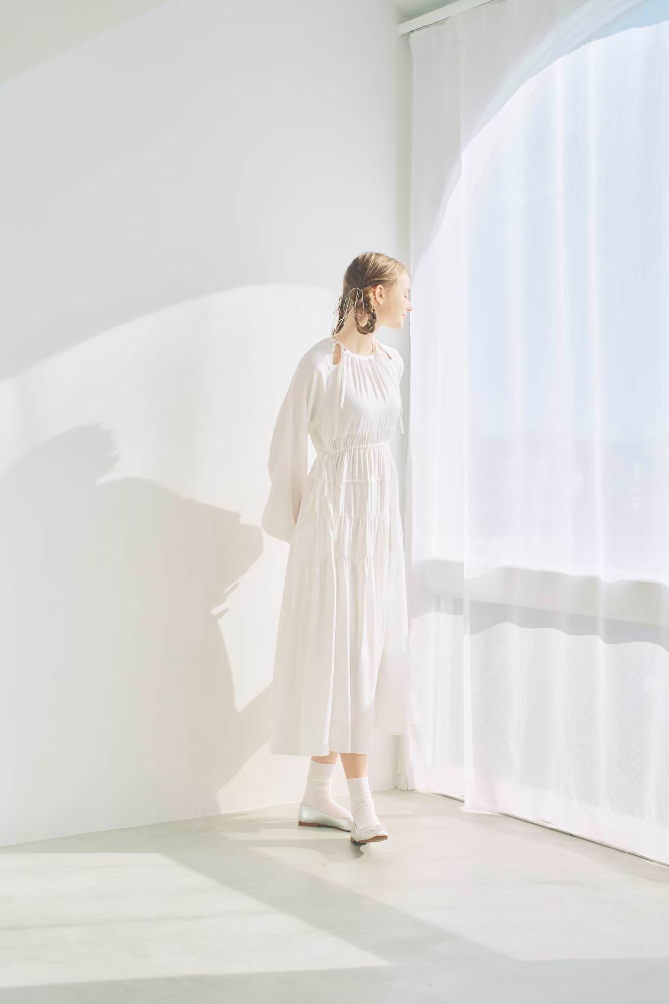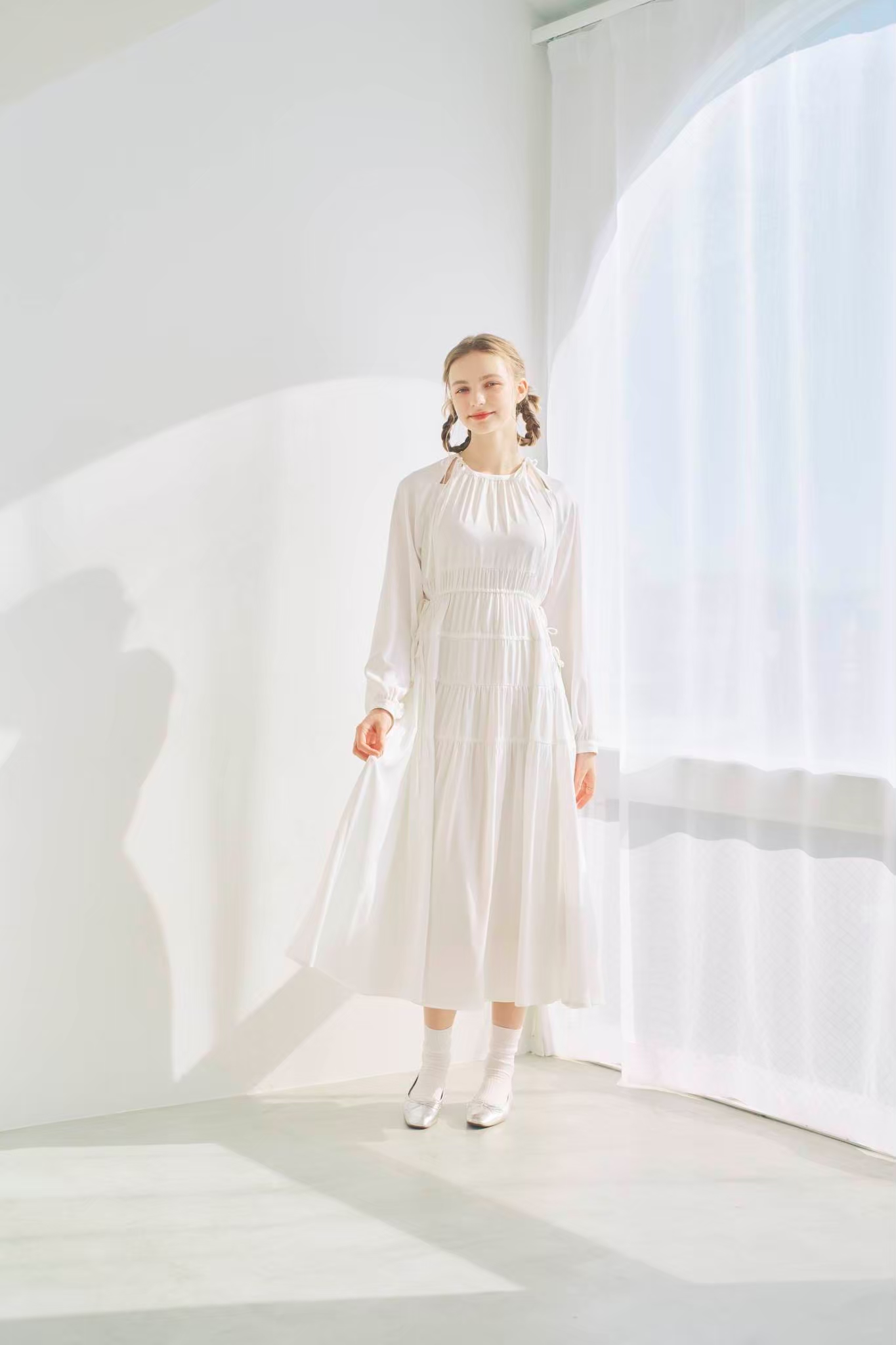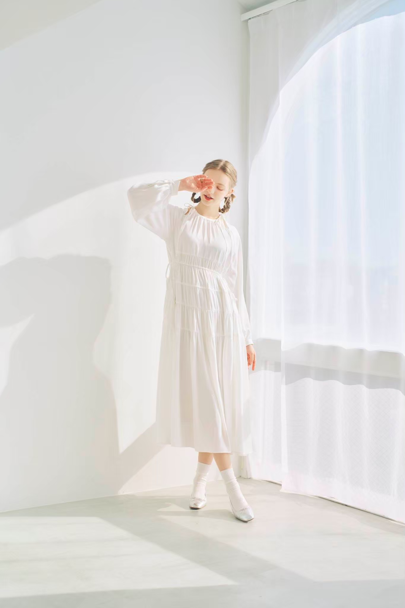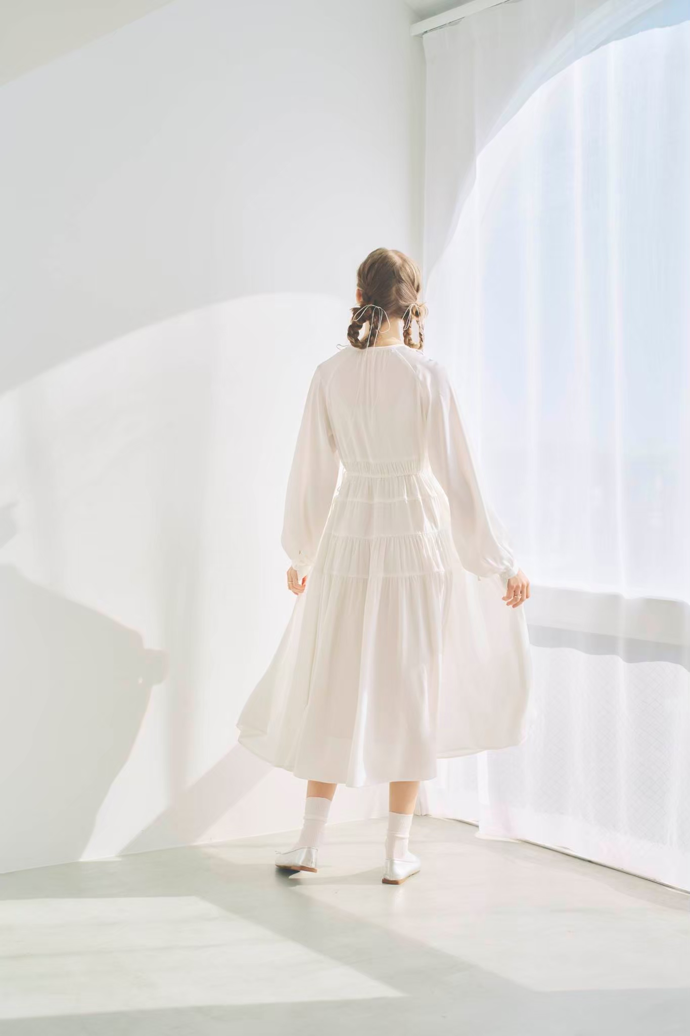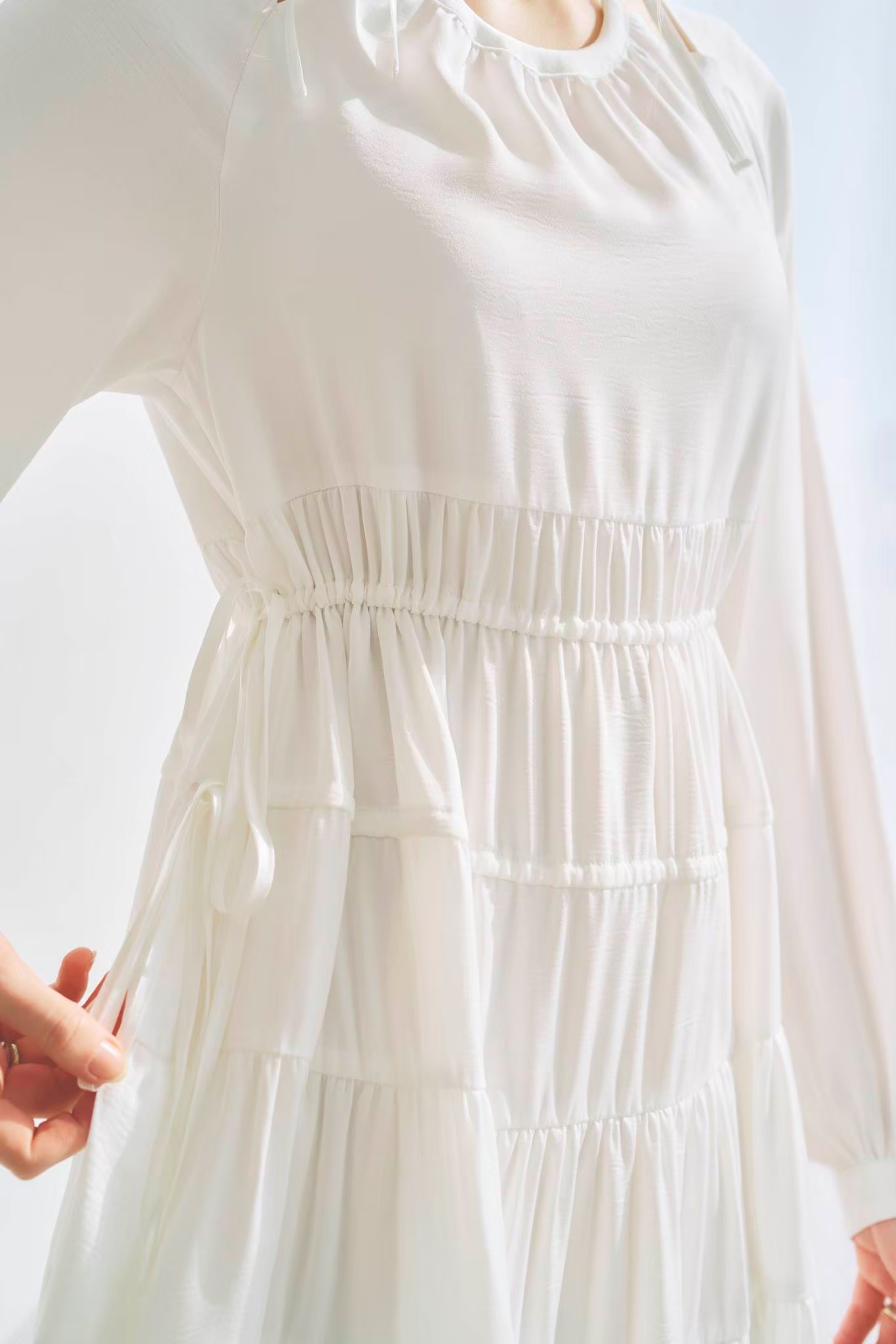 シンプルながらもウエストのギャザーや、 カフスなど細部に特徴的なデザインを施しました