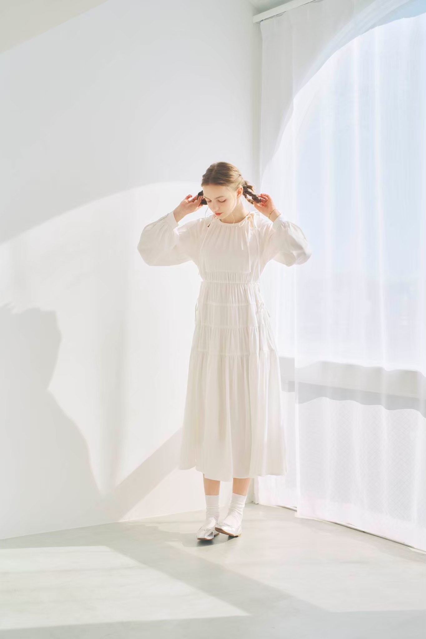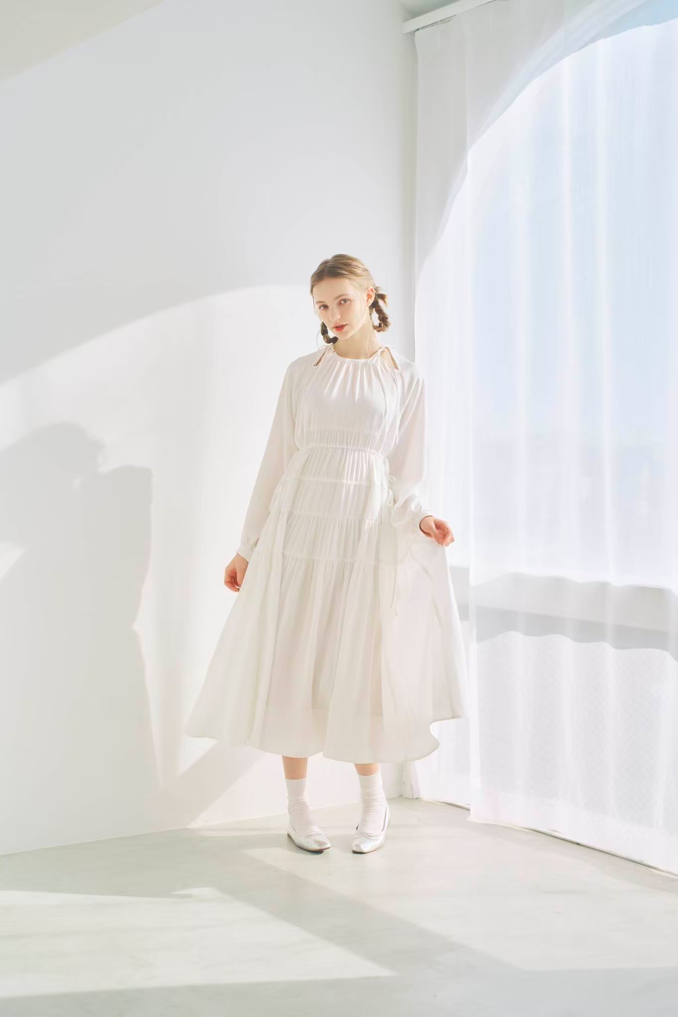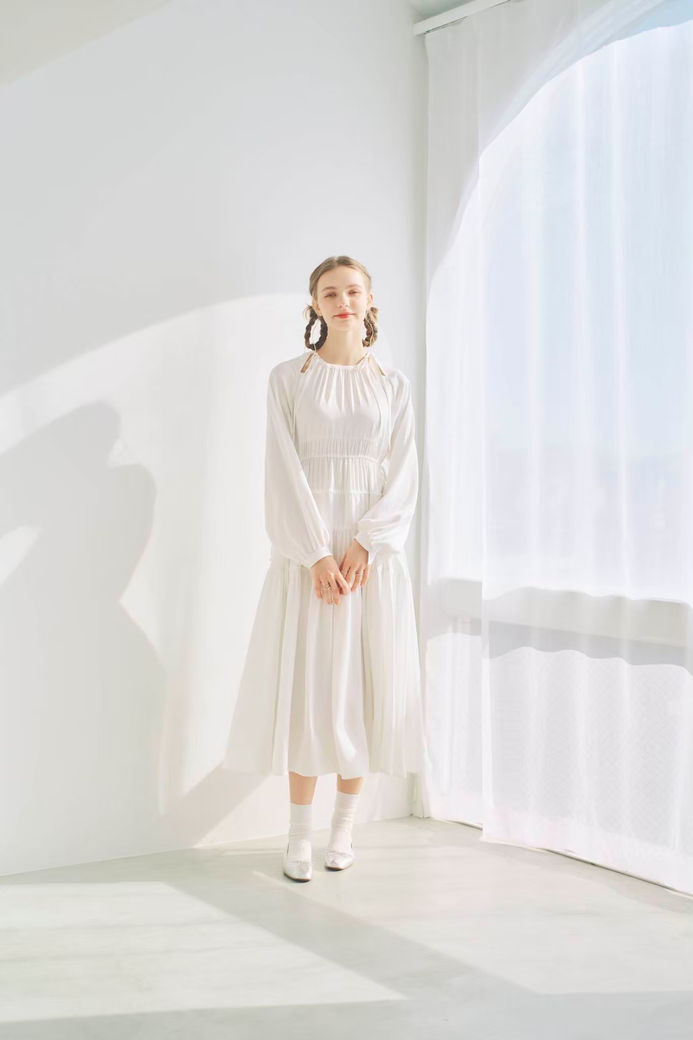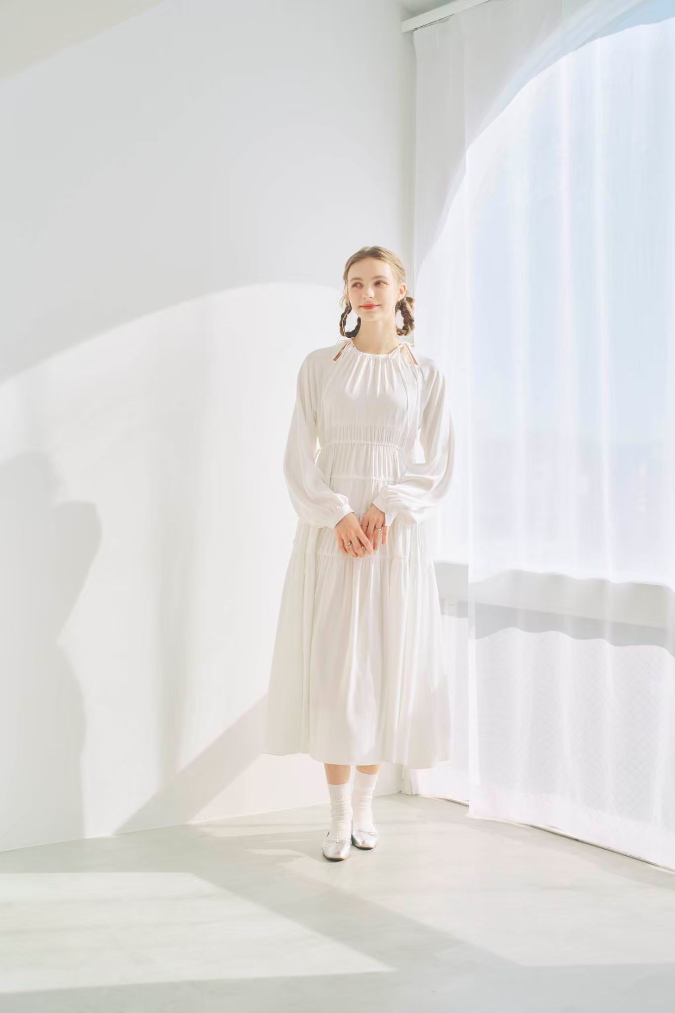シンプルながらもウエストのギャザーや、 カフスなど細部に特徴的なデザインを施しました