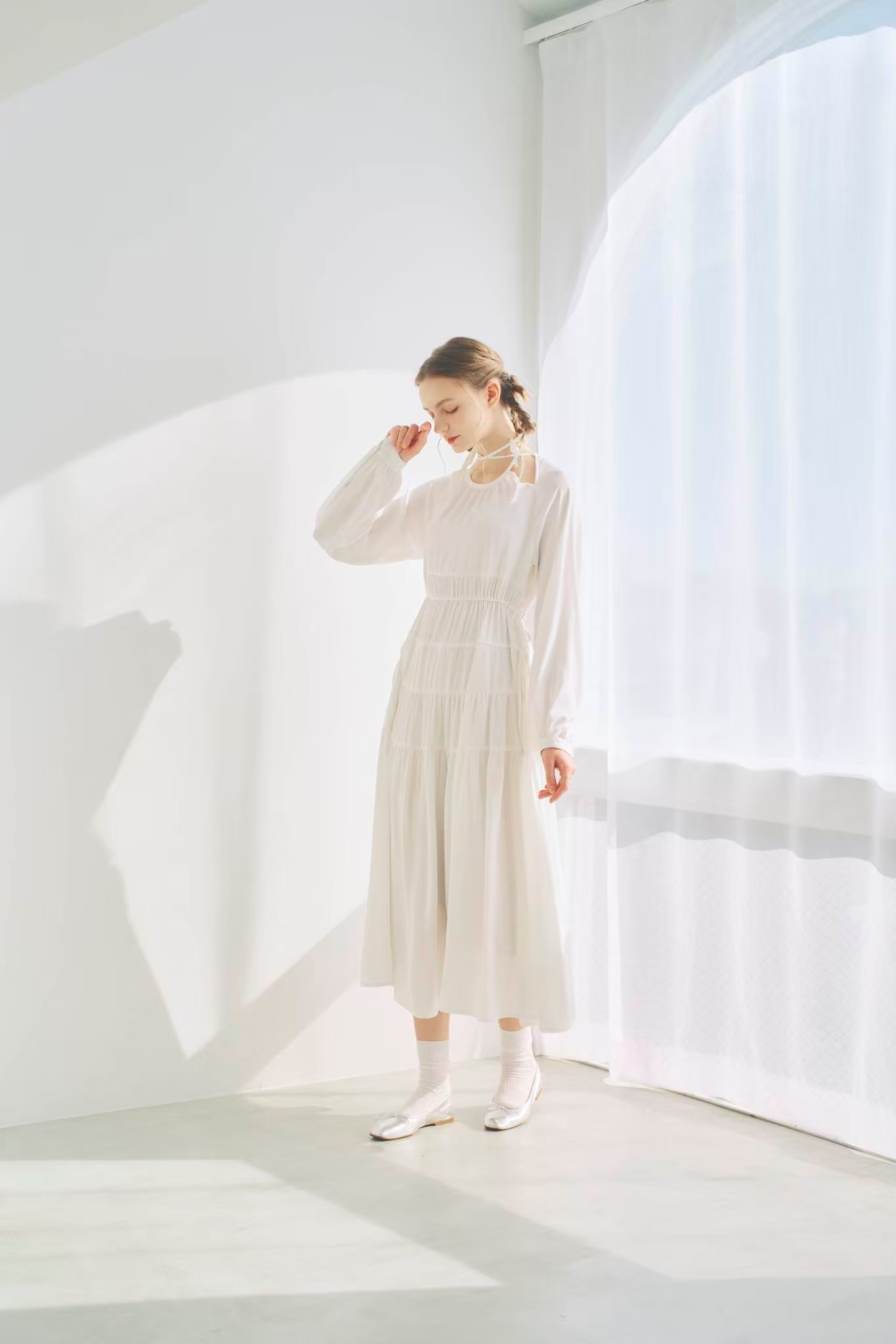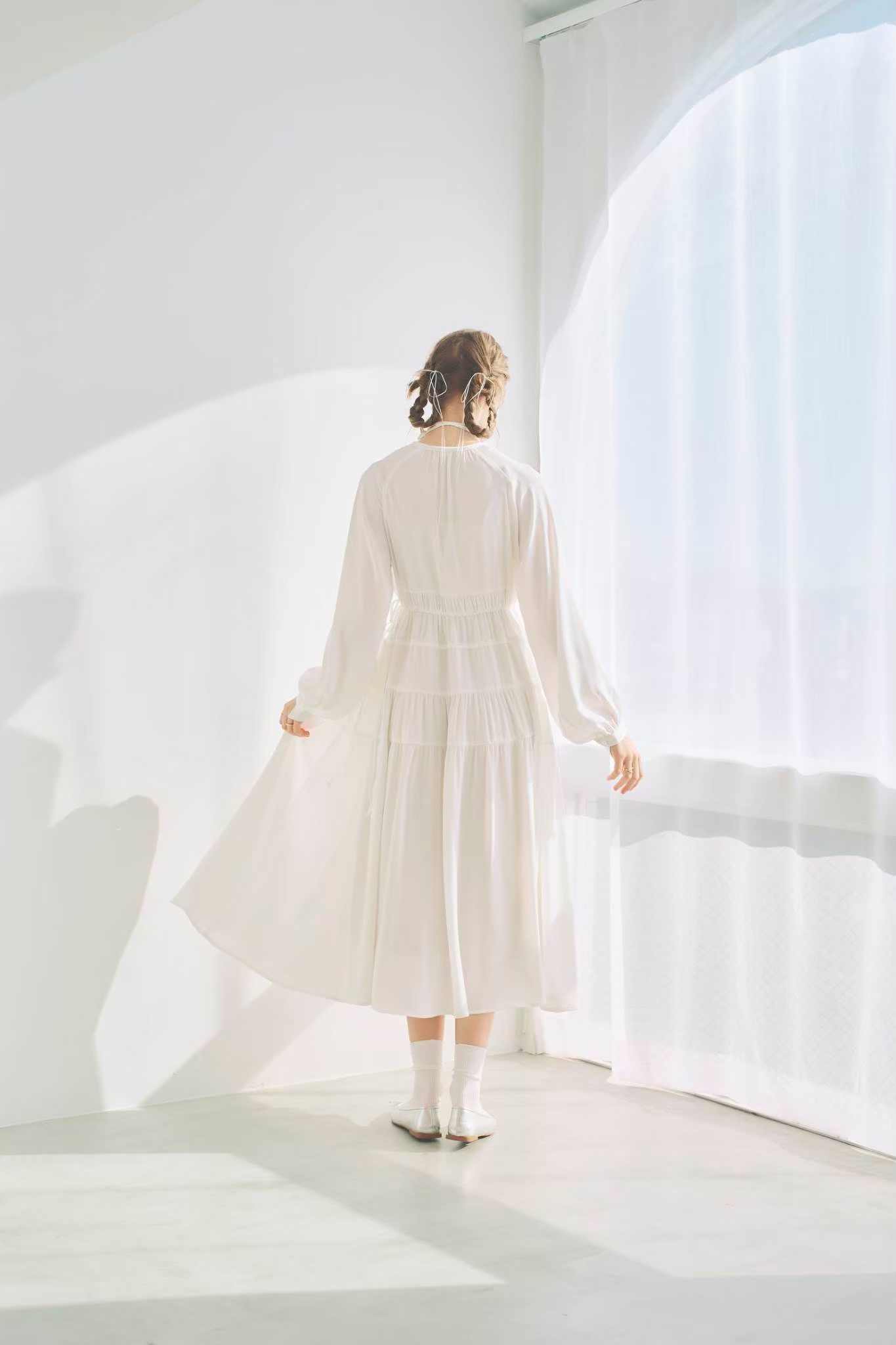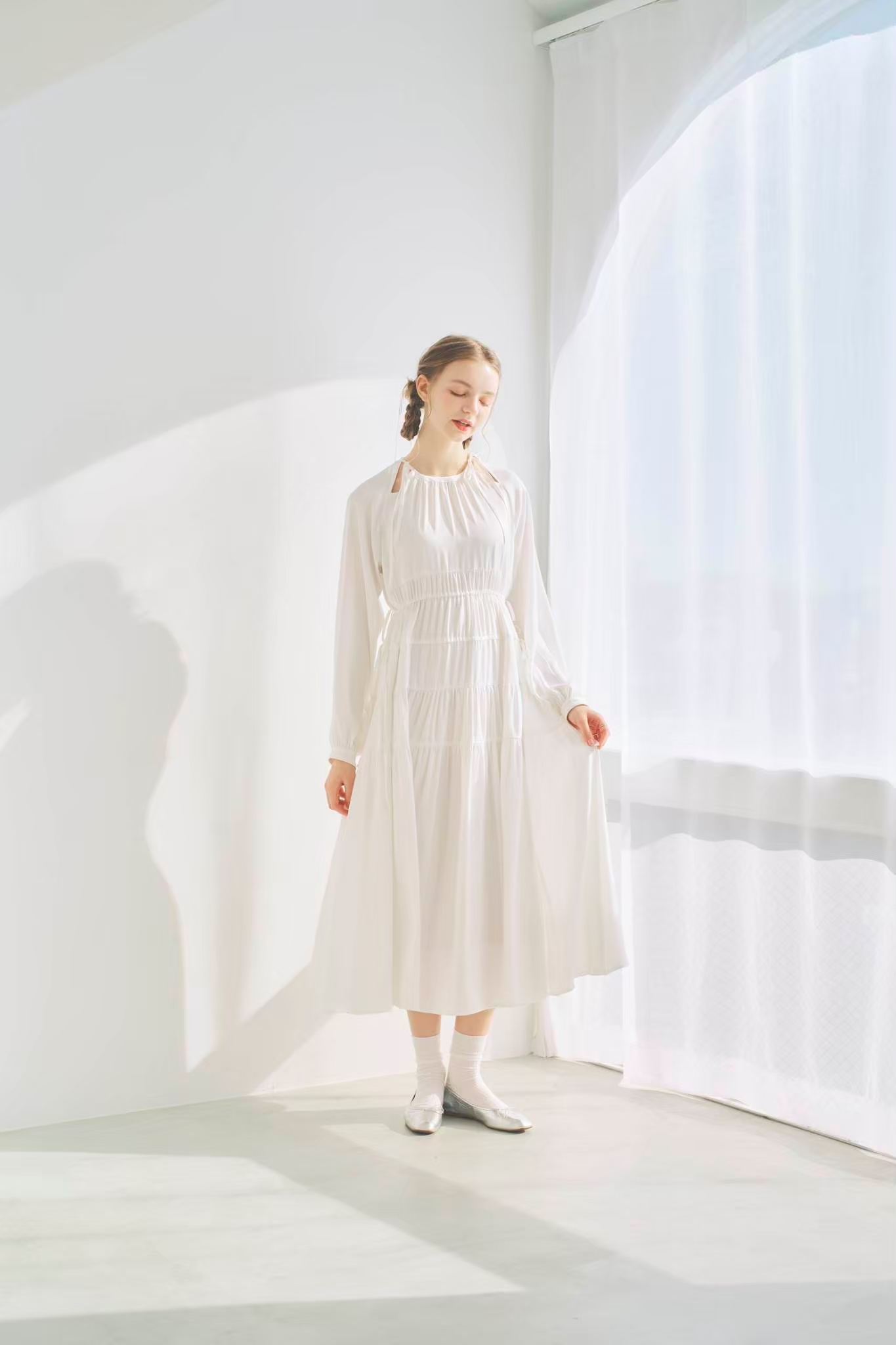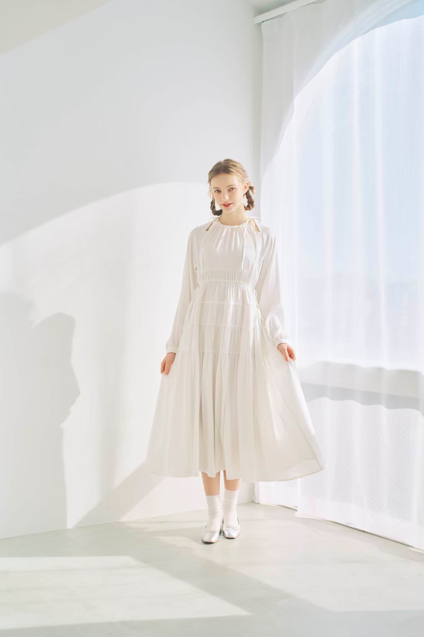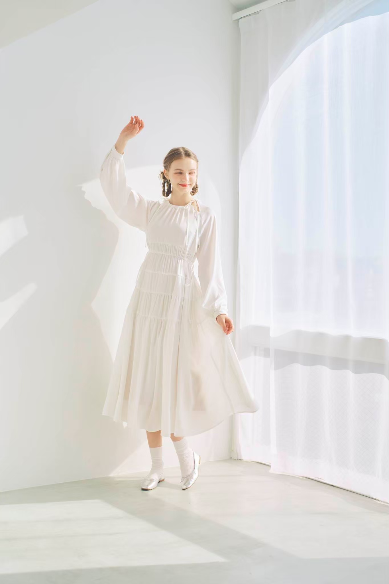 シンプルながらもウエストのギャザーや、 カフスなど細部に特徴的なデザインを施しました