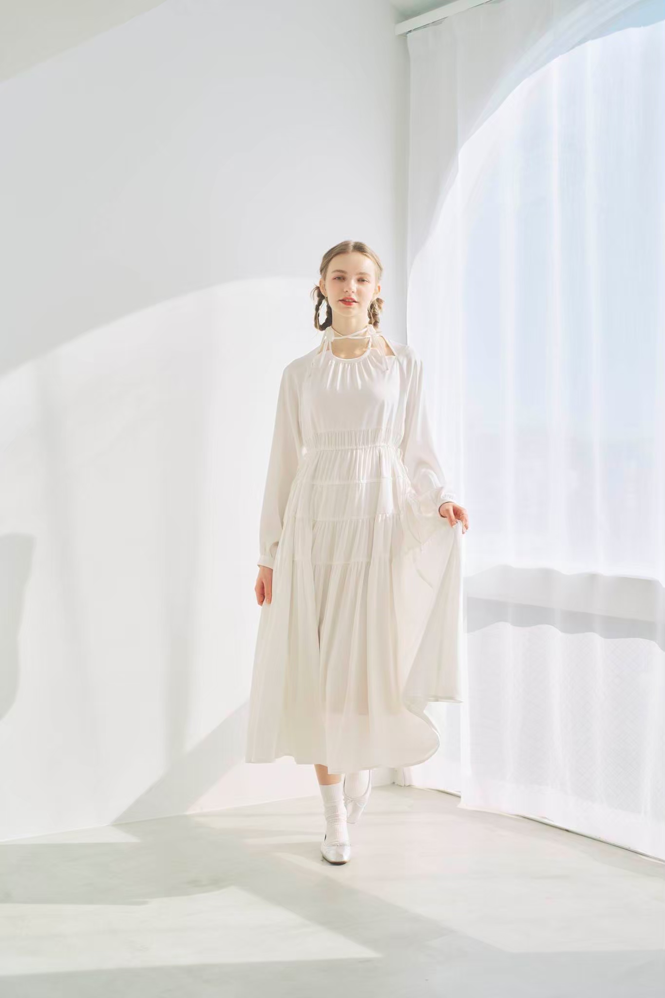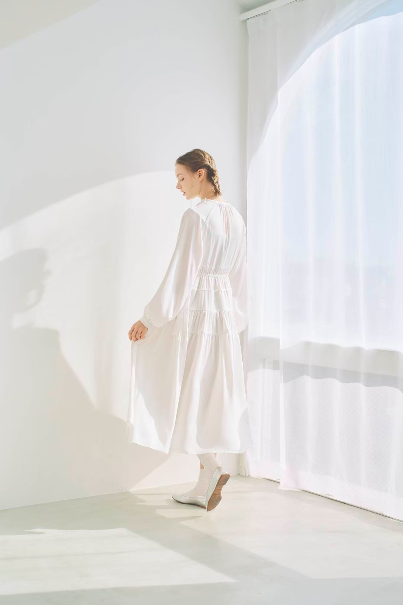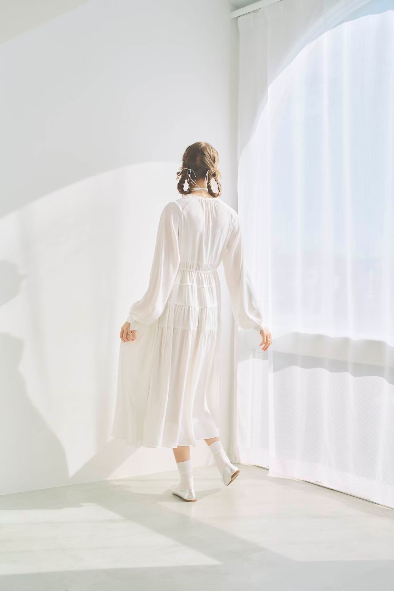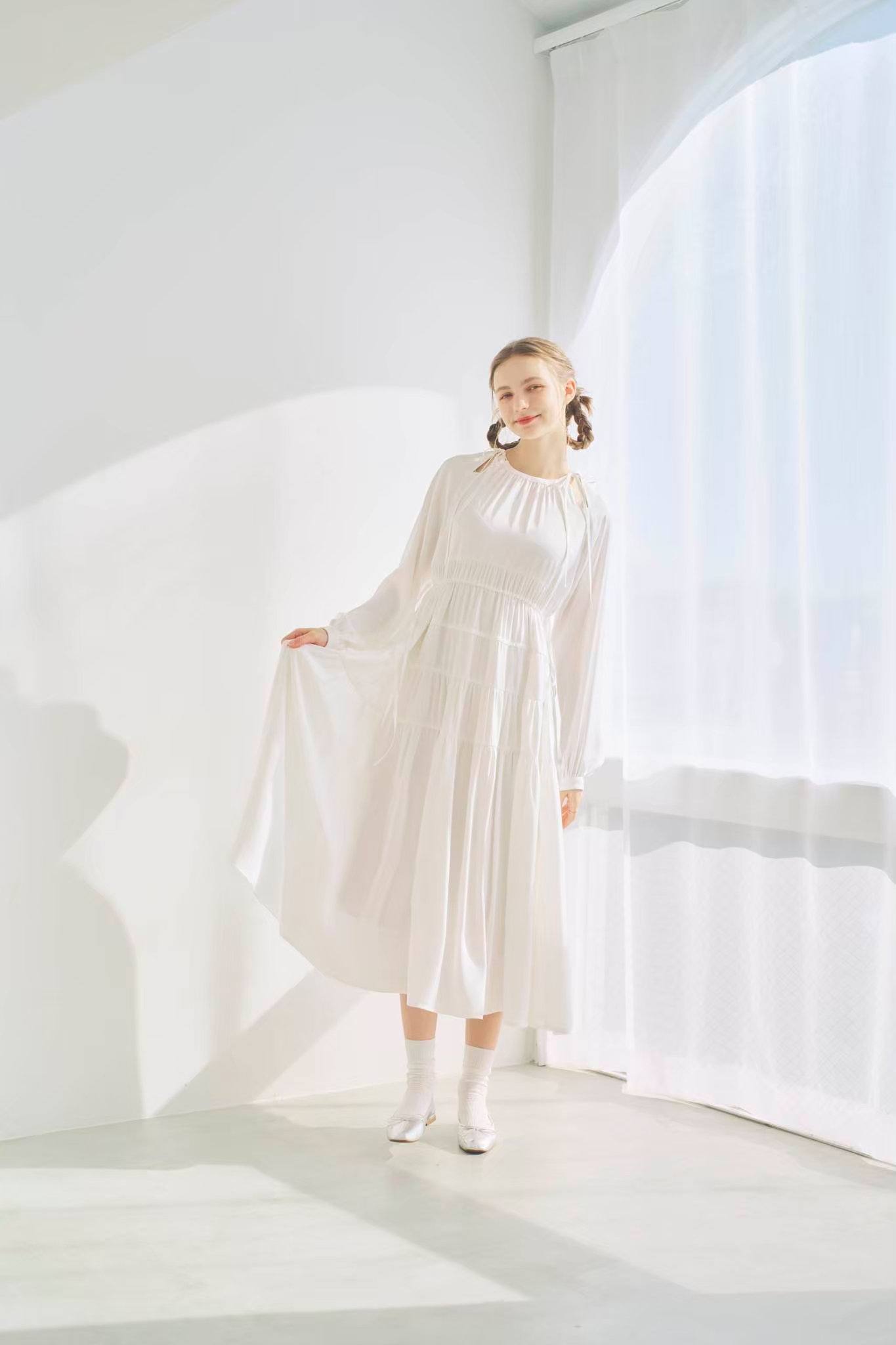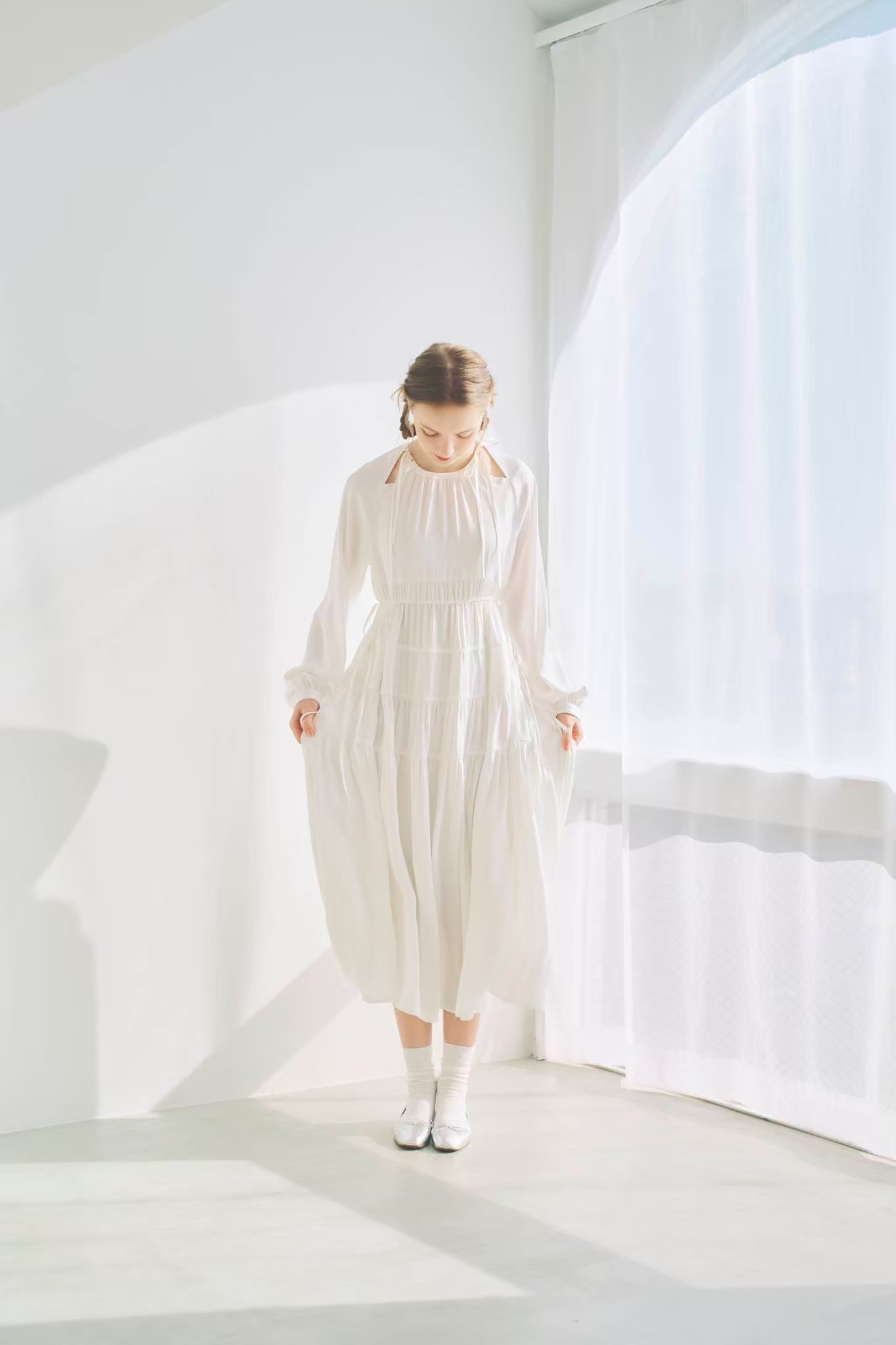 シンプルながらもウエストのギャザーや、 カフスなど細部に特徴的なデザインを施しました