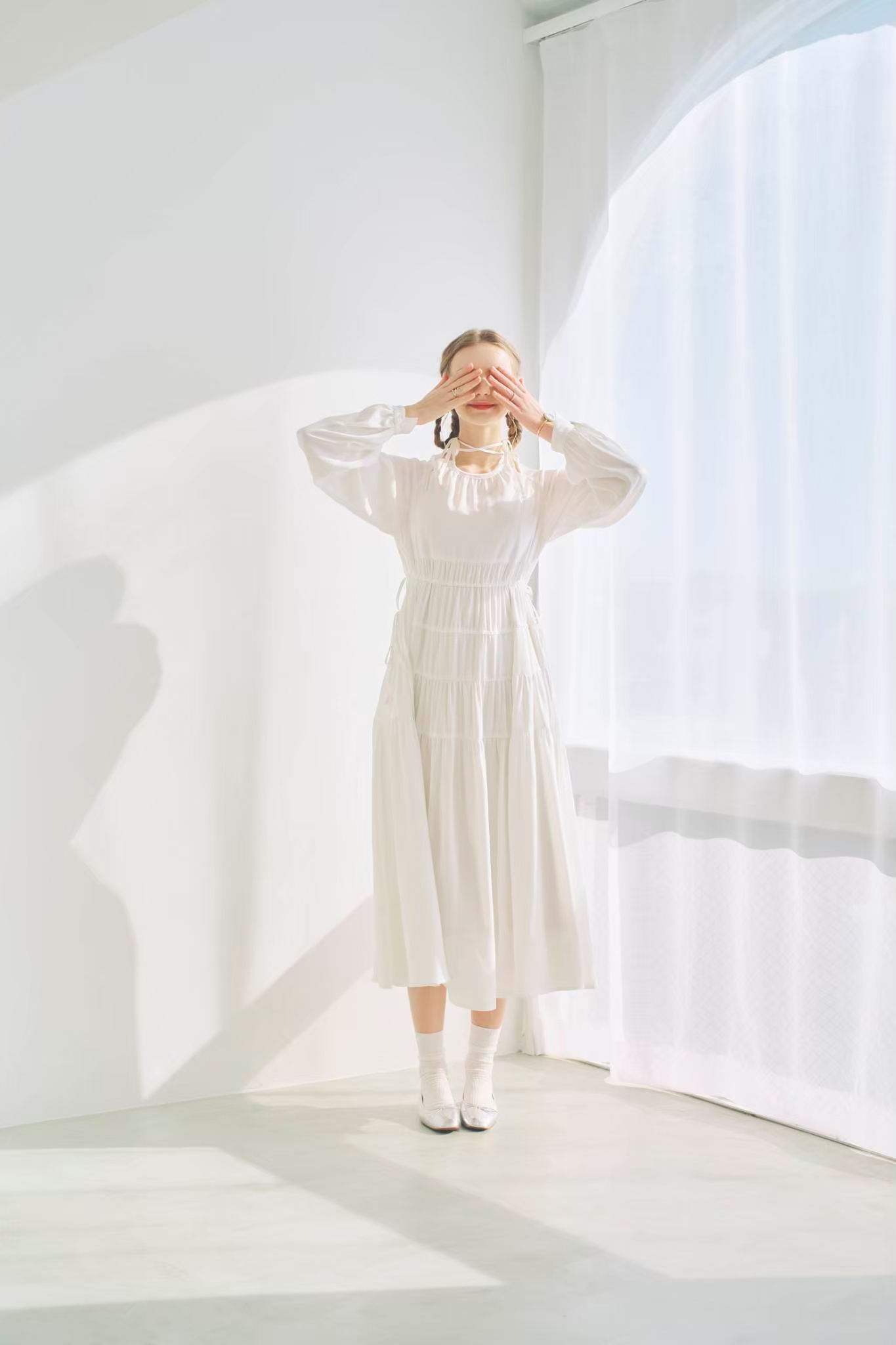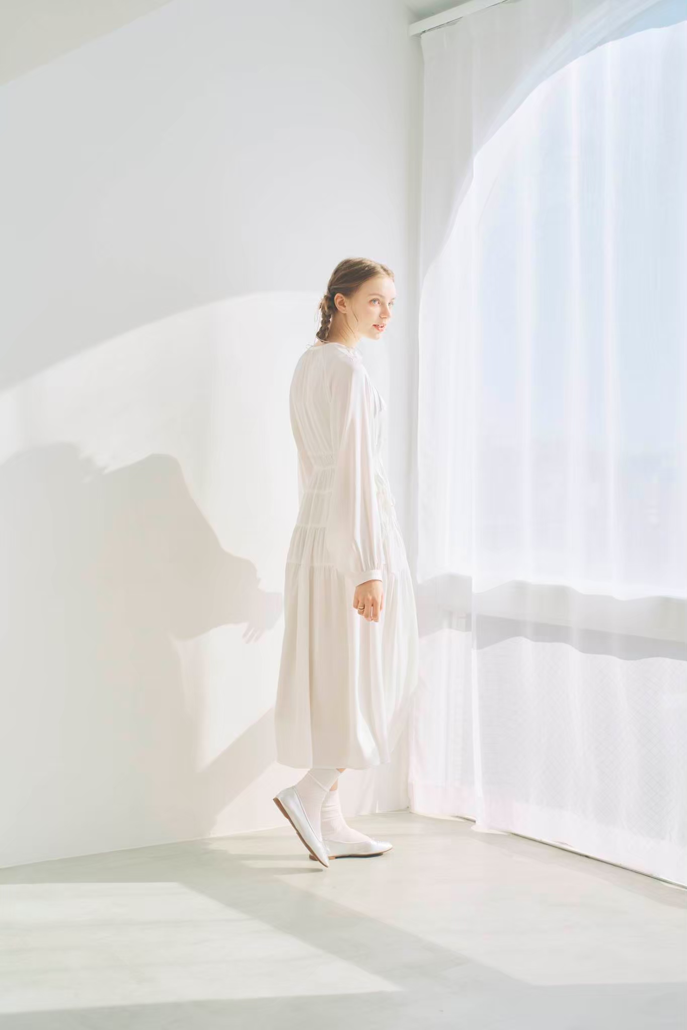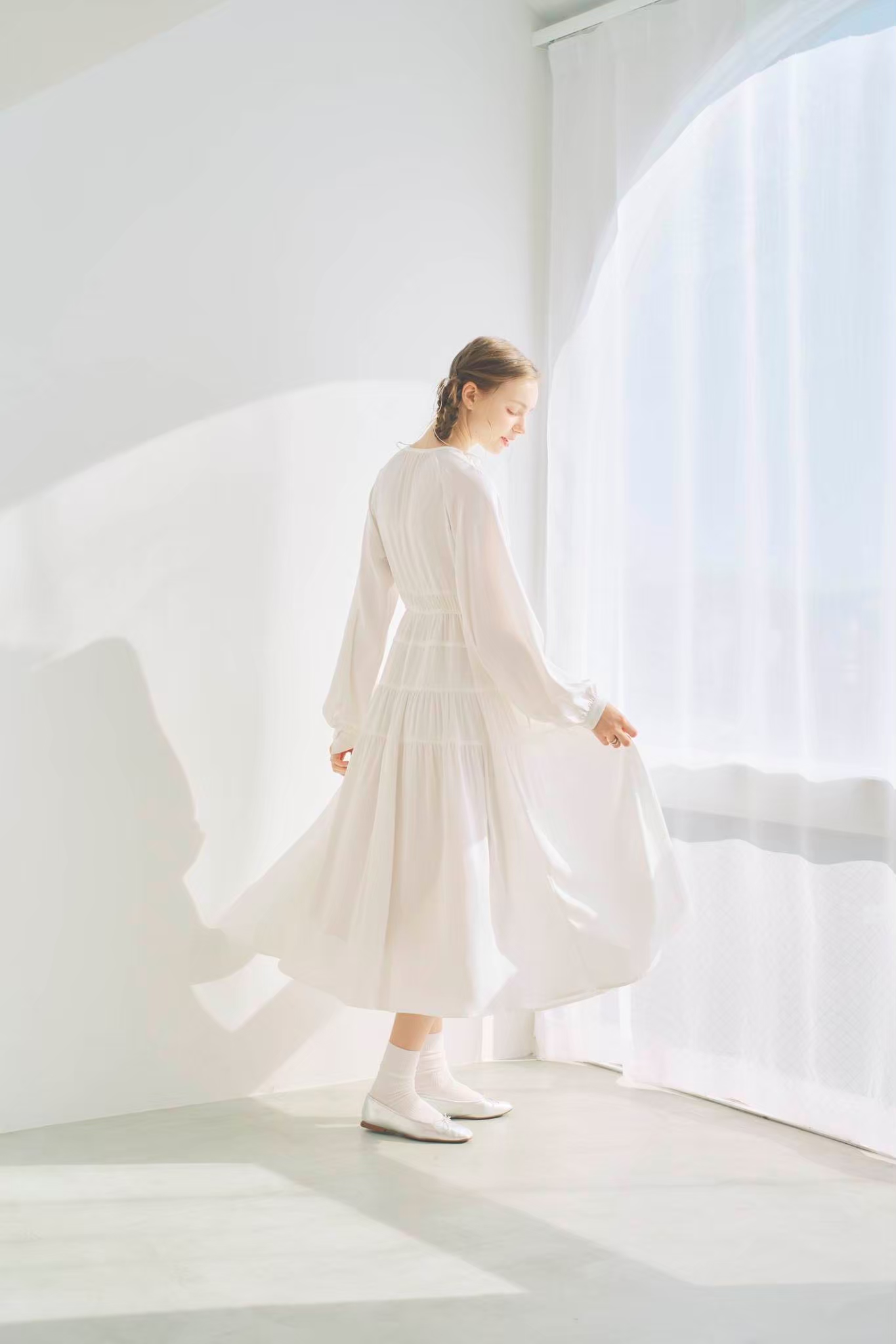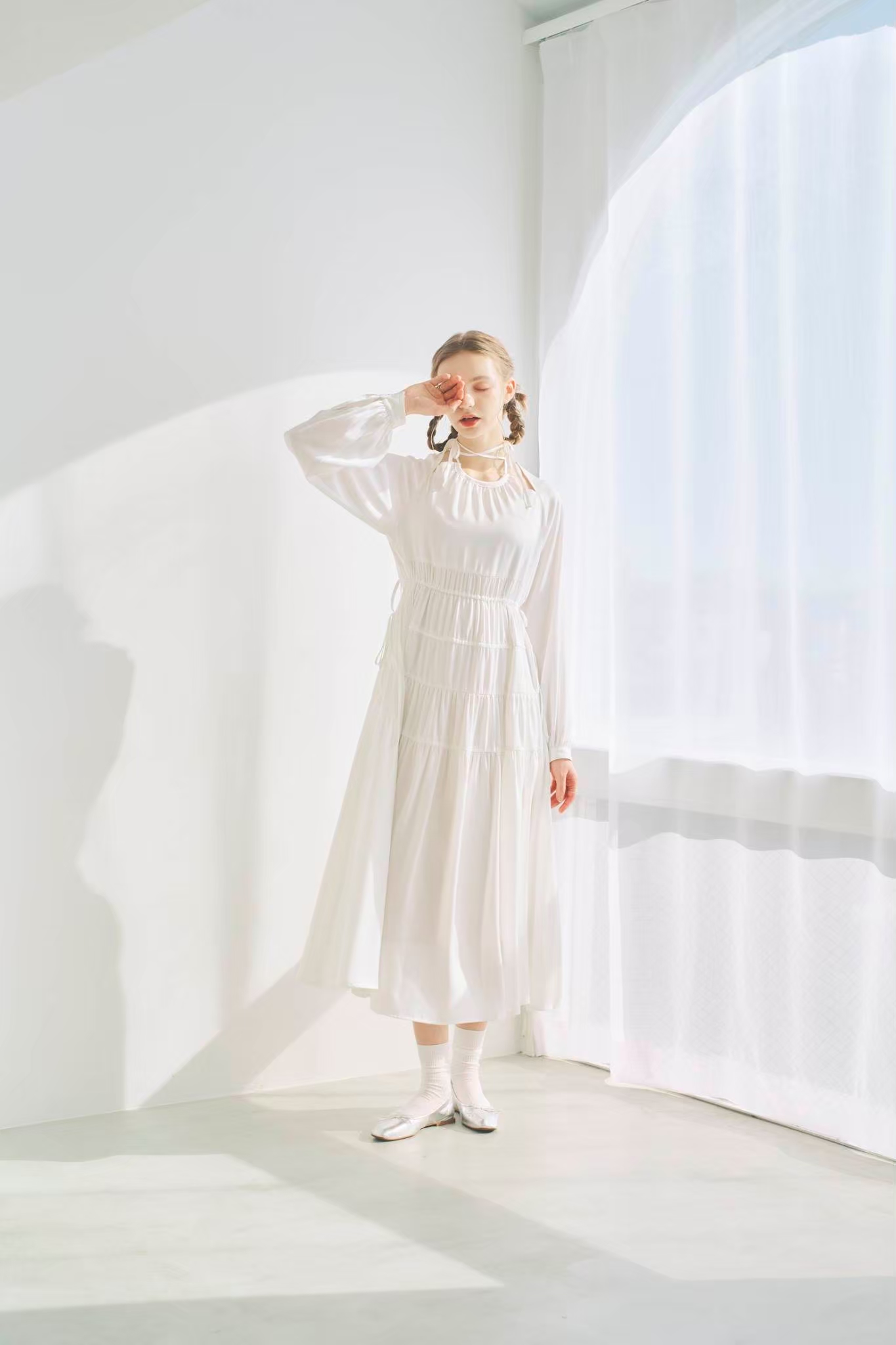 シンプルながらもウエストのギャザーや、 カフスなど細部に特徴的なデザインを施しました