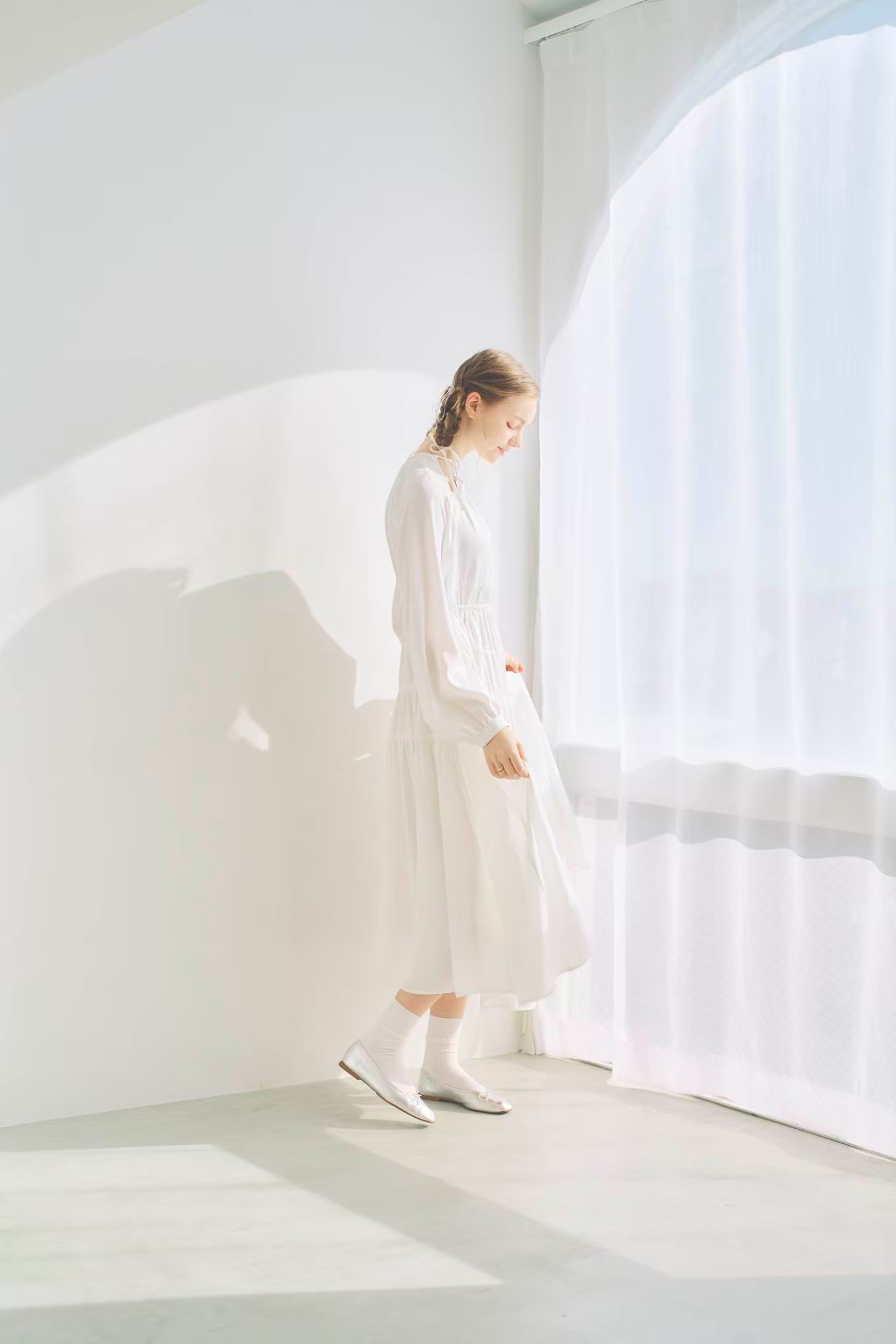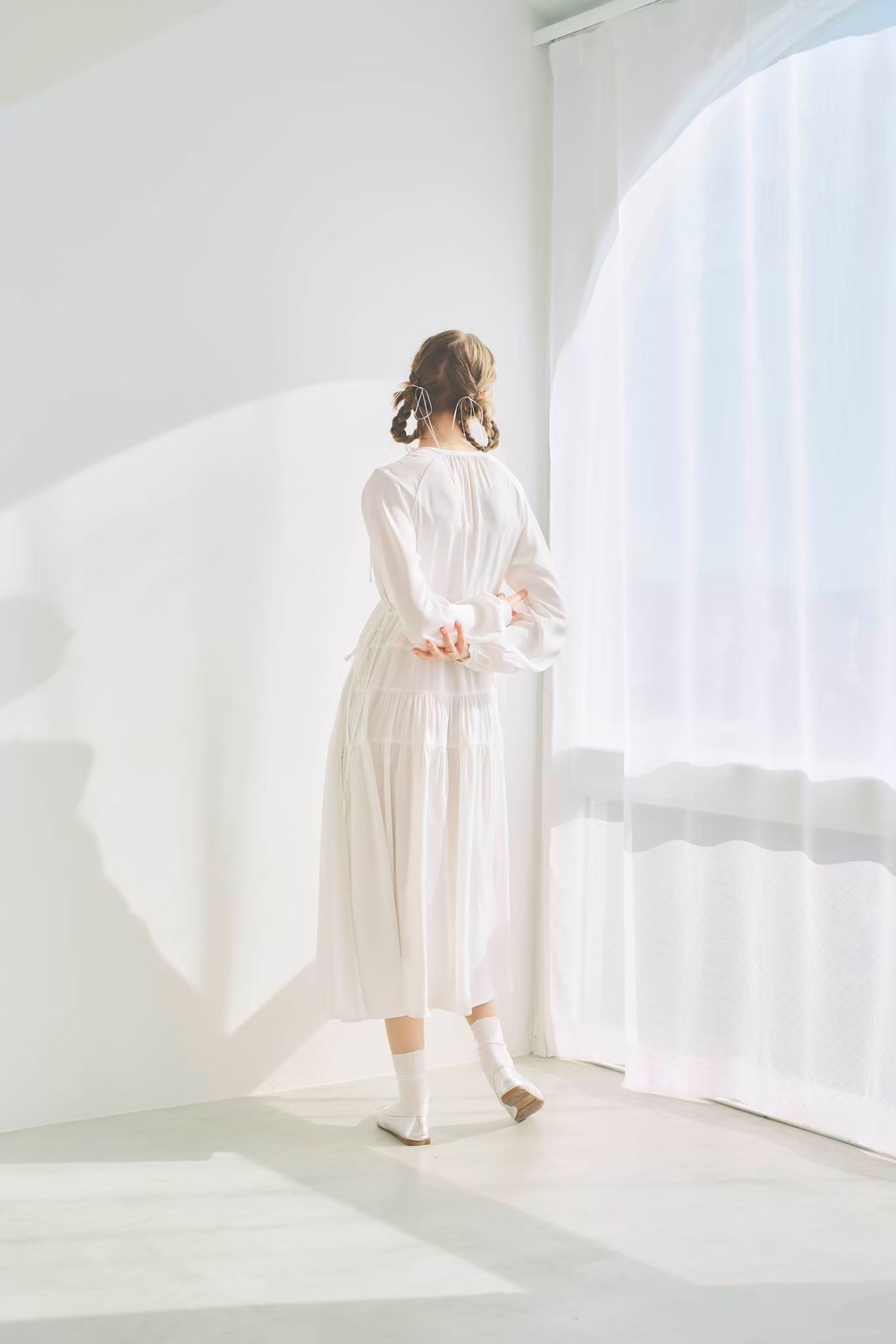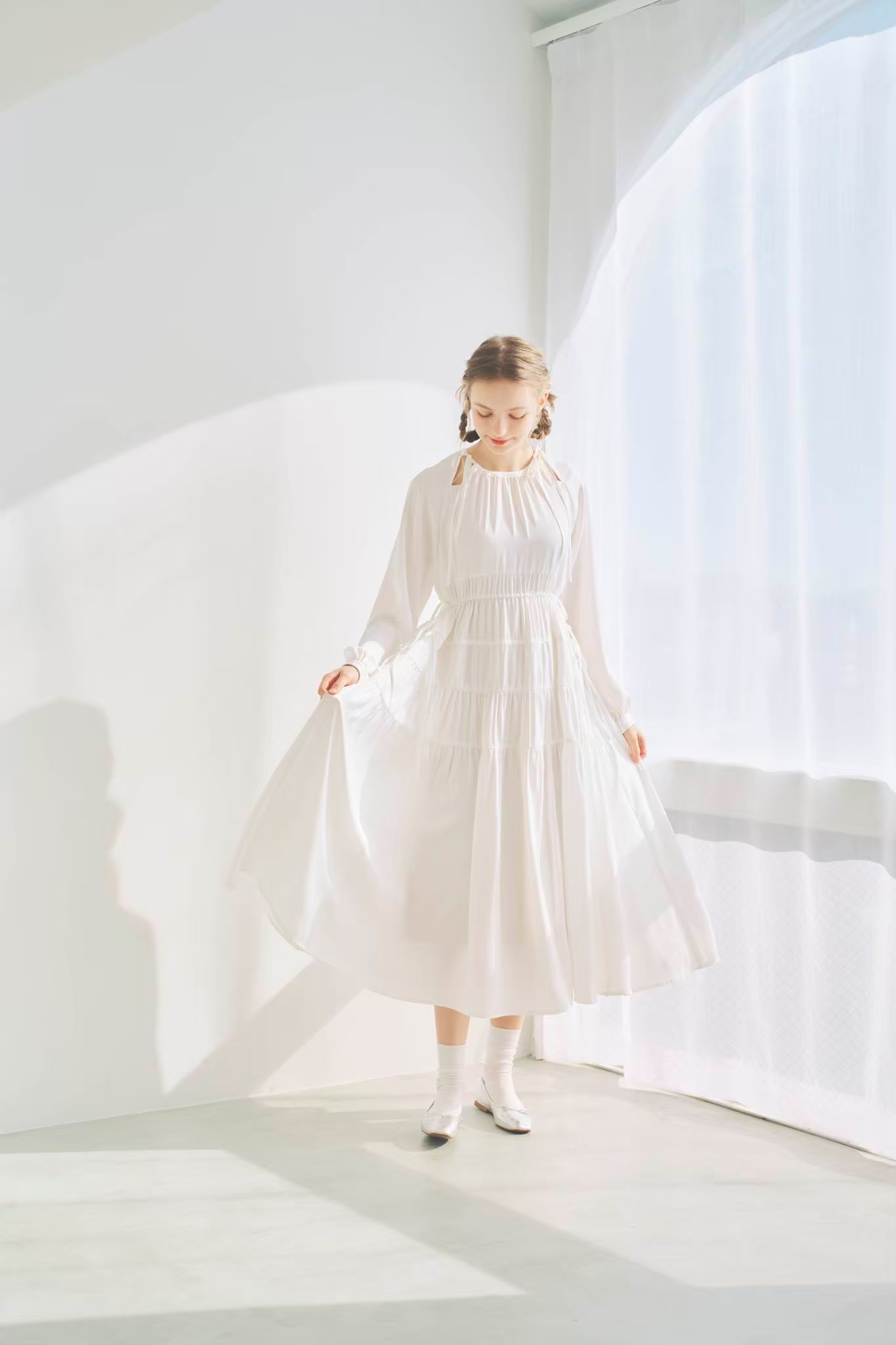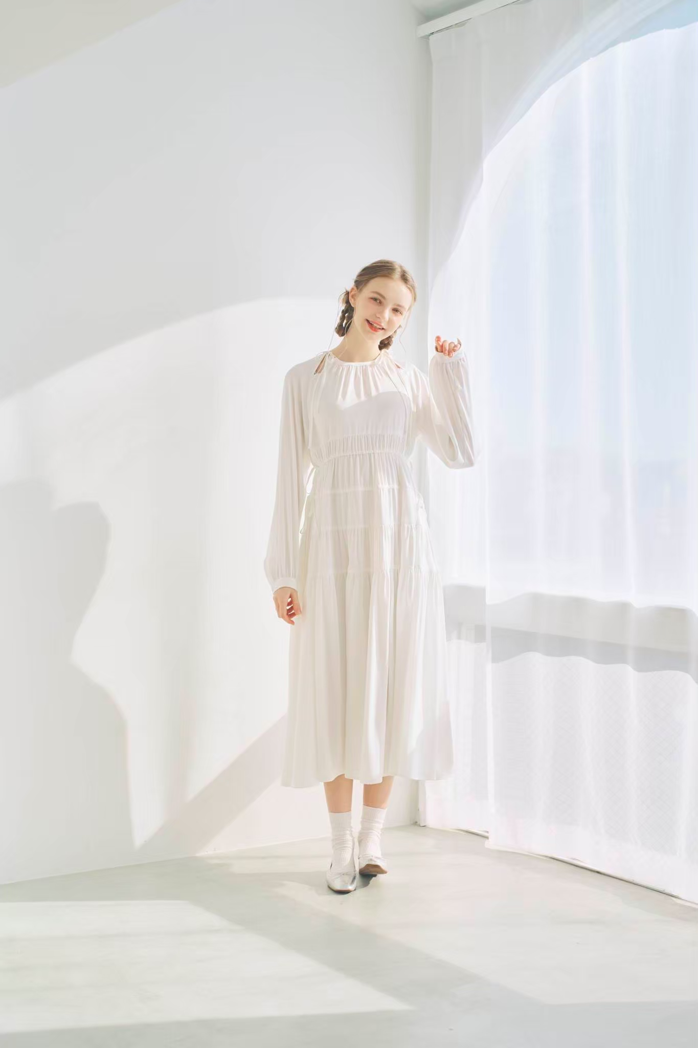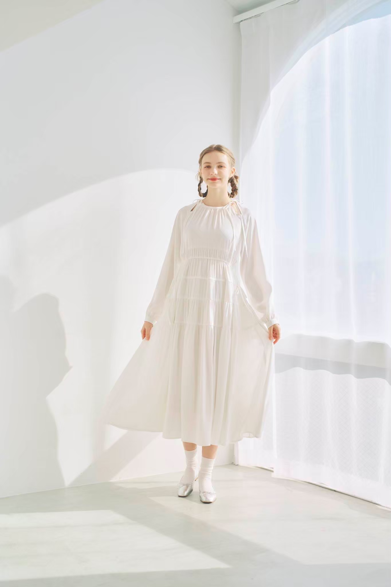 シンプルながらもウエストのギャザーや、 カフスなど細部に特徴的なデザインを施しました