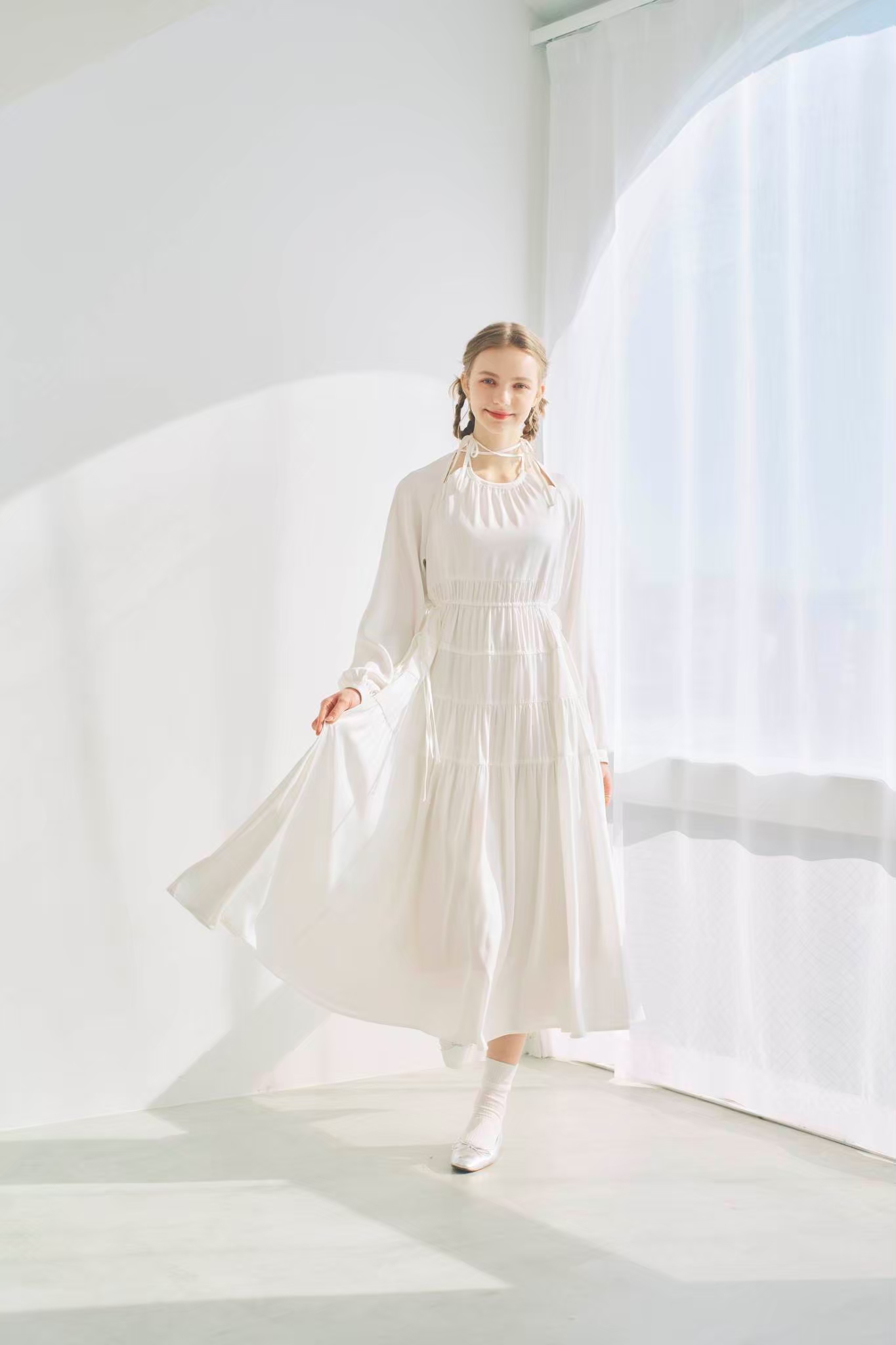 リボンデザインが特徴的なサテン素材のロングワンピース