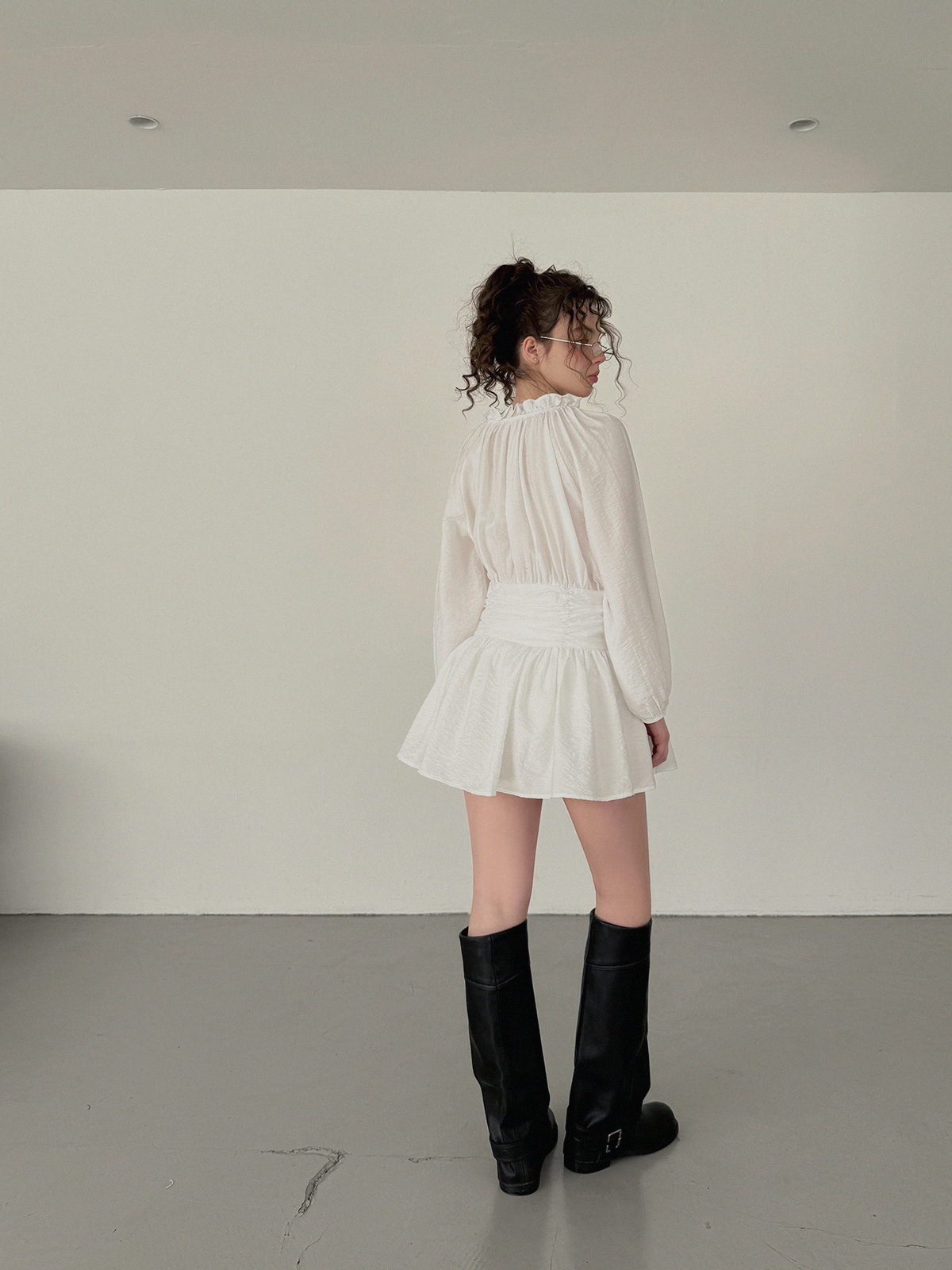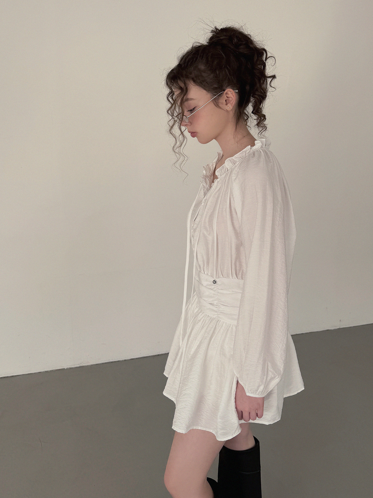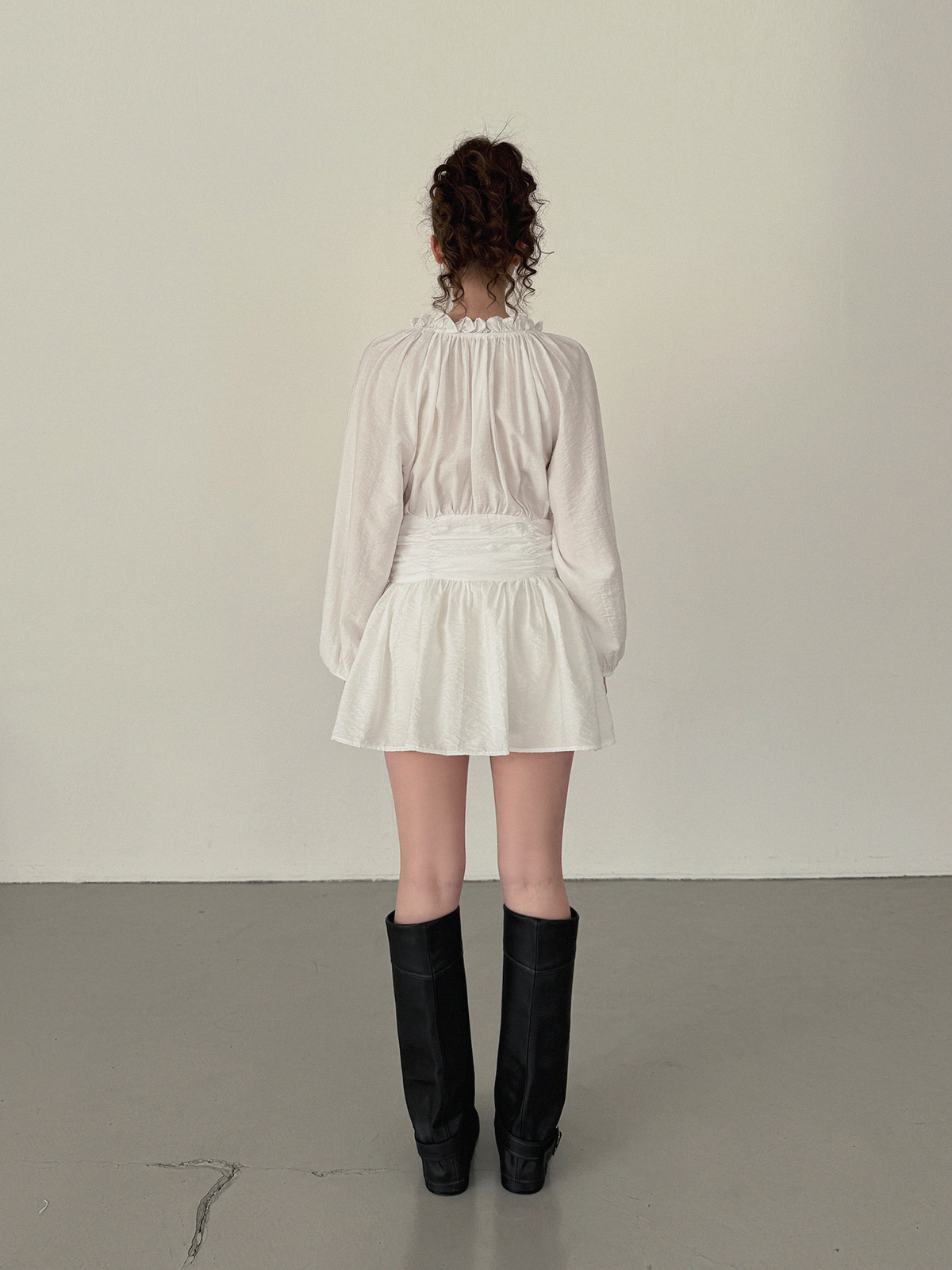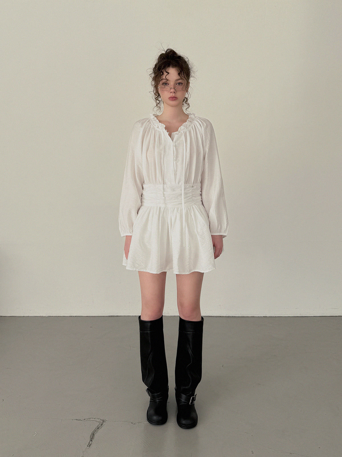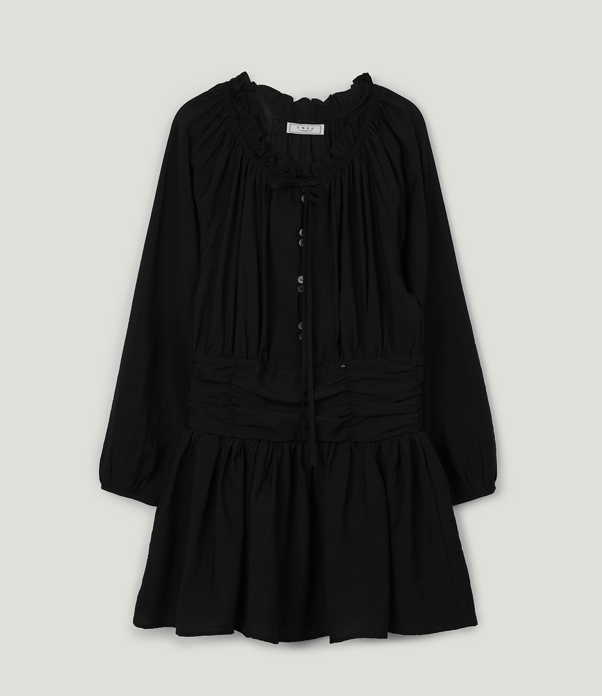 フリルシャーリング長袖ミニワンピース