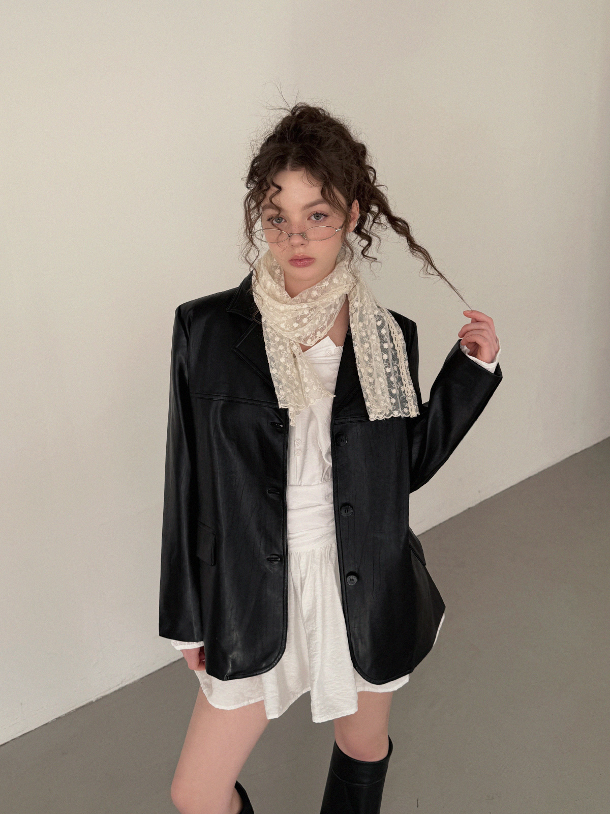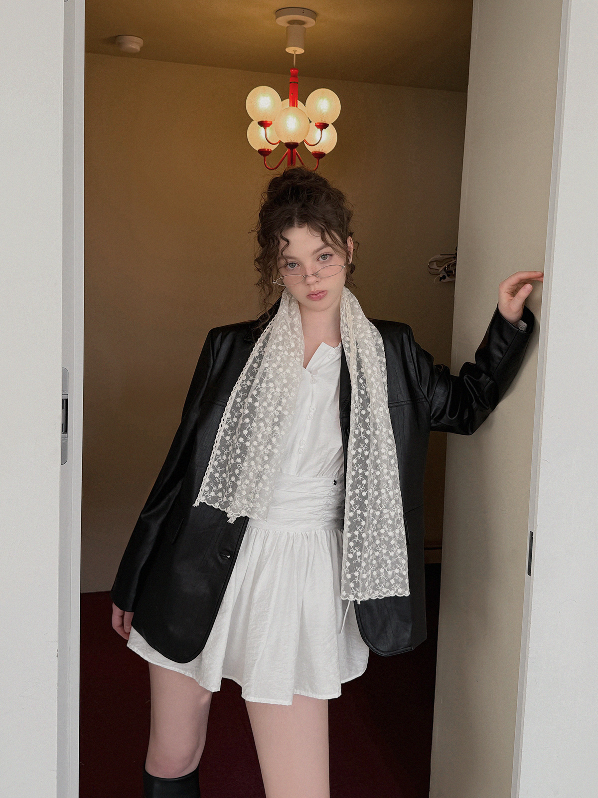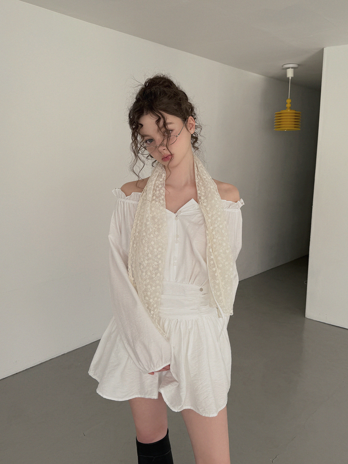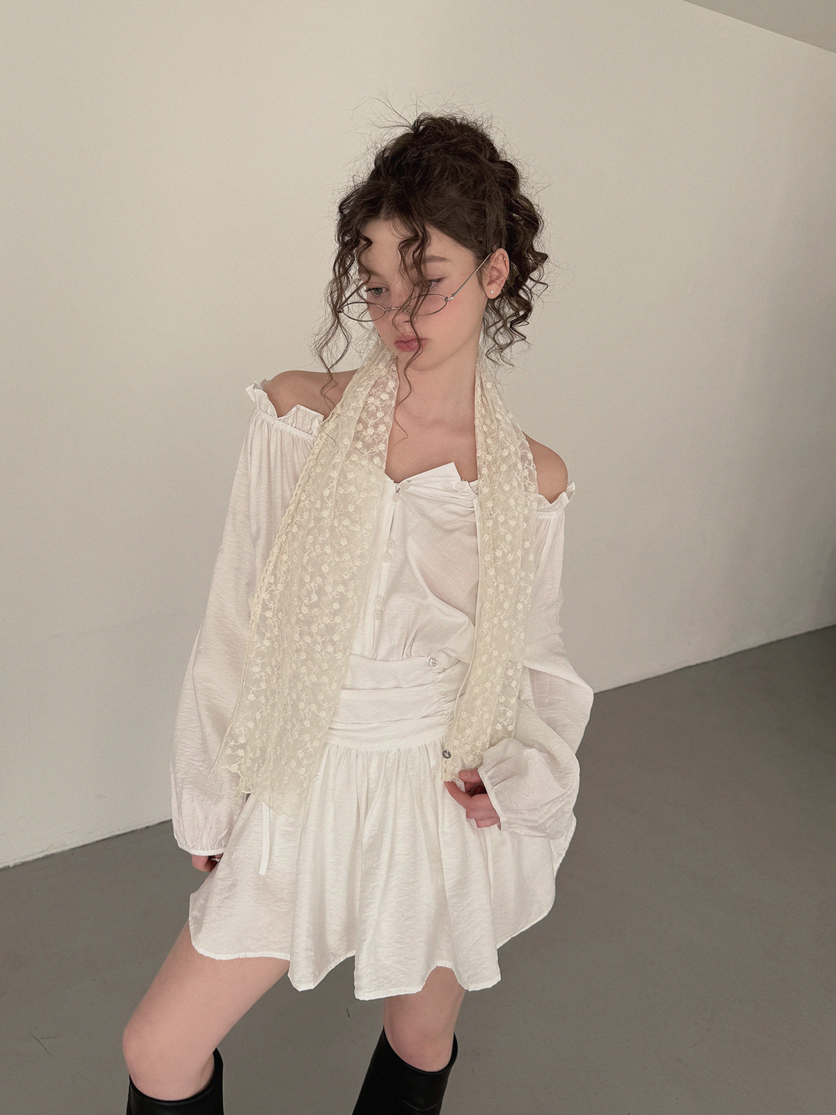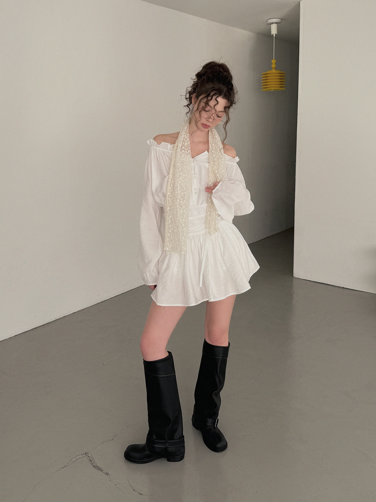 フリルシャーリング長袖ミニワンピース