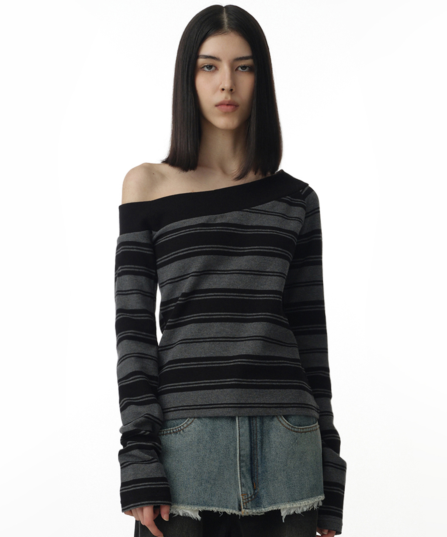 One Shoulder Striped T-shirt [Charcoal Gray]