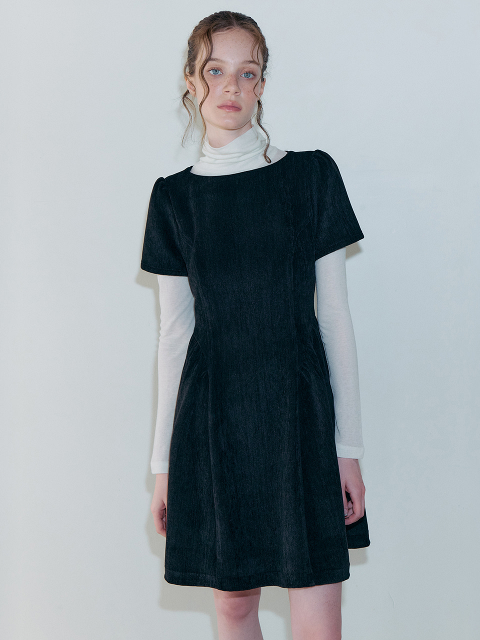 Shirring Flare Mini Dress, Black
