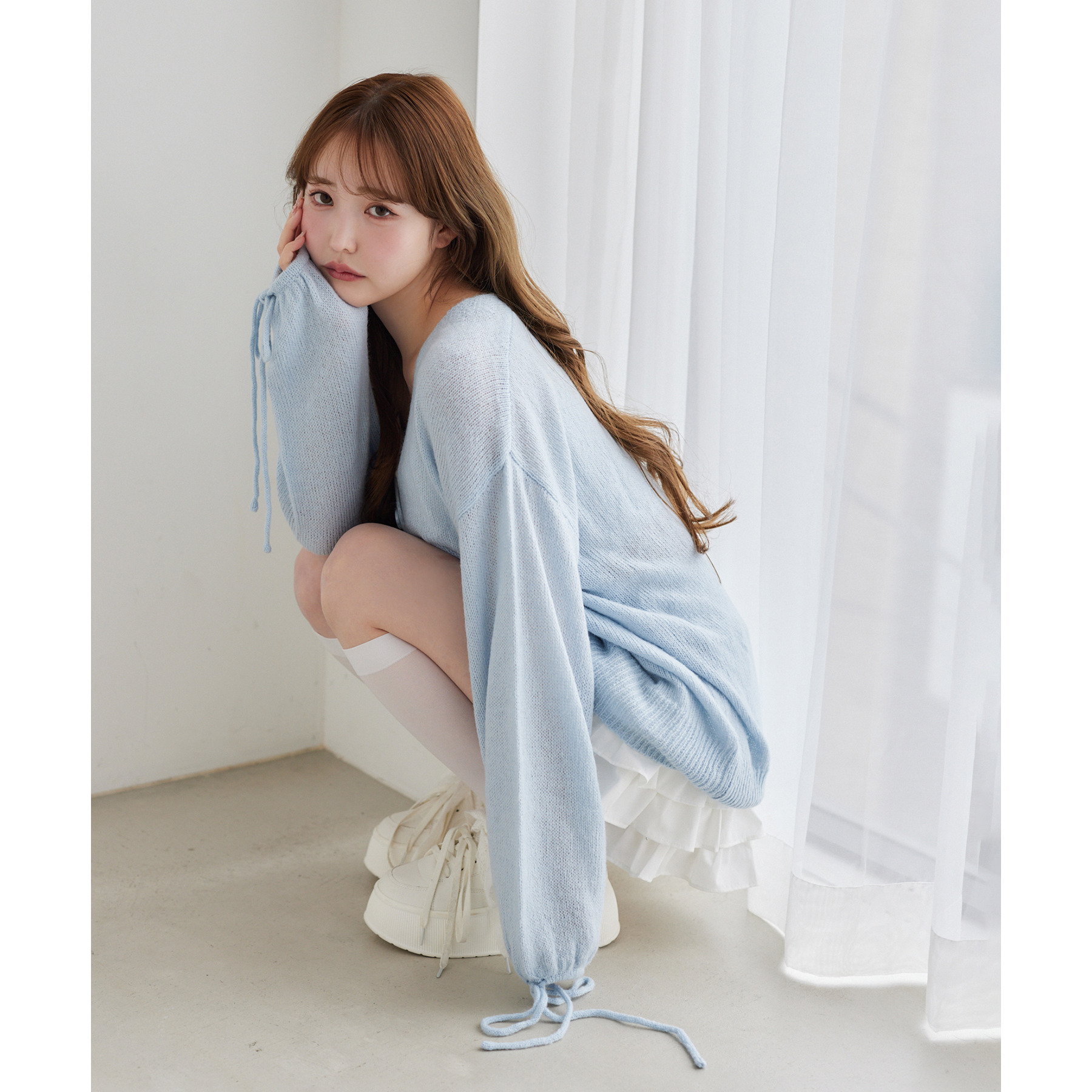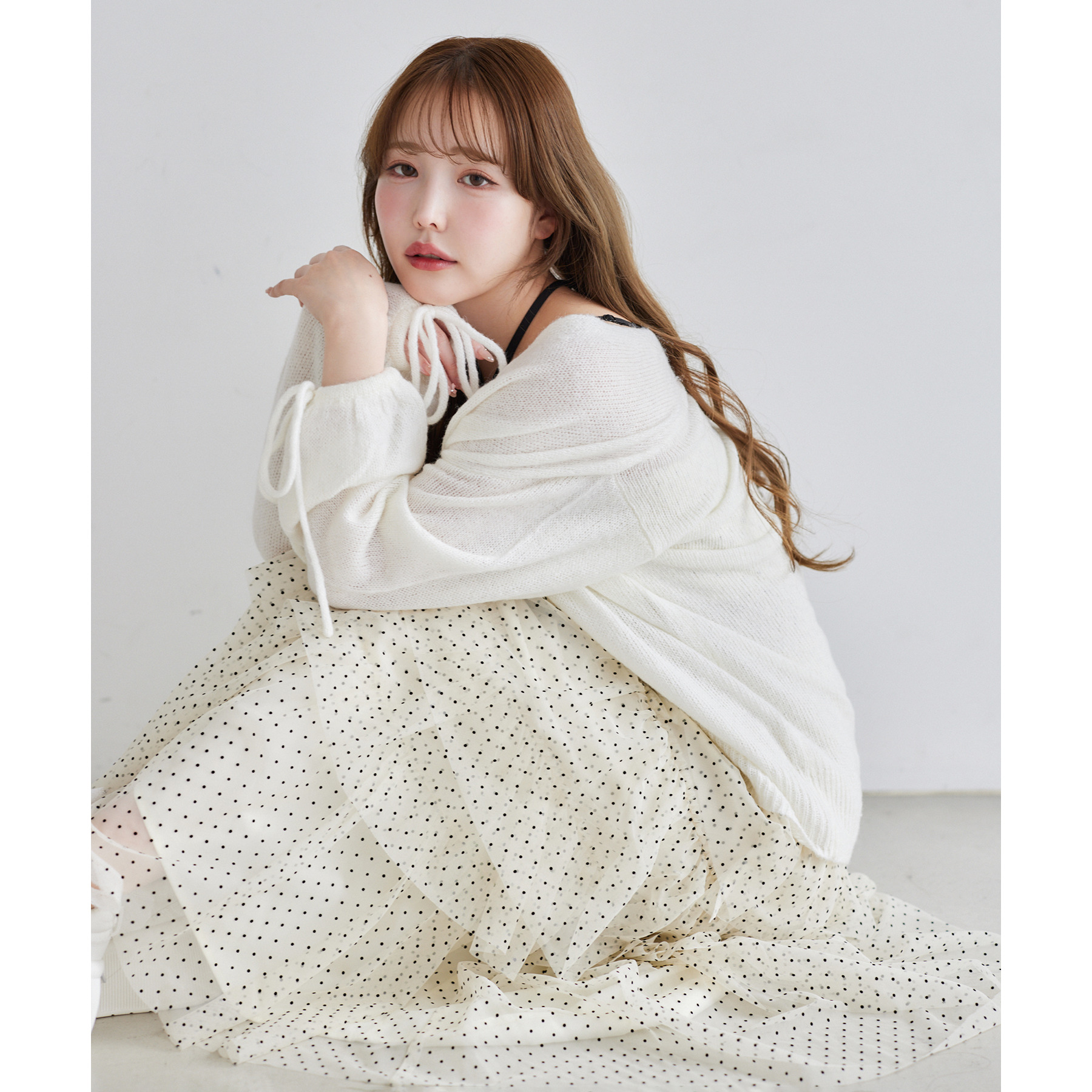 シアー感がかわいい透かし編みのニット。