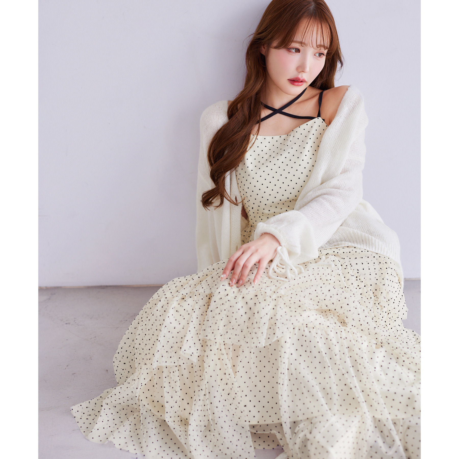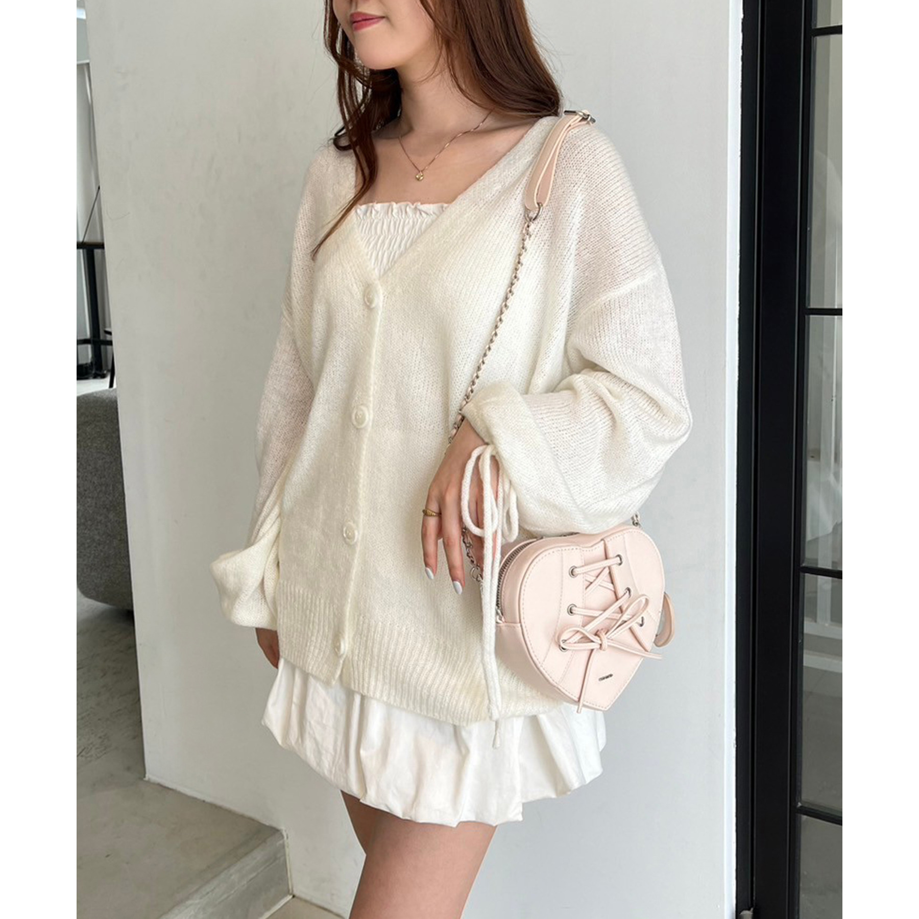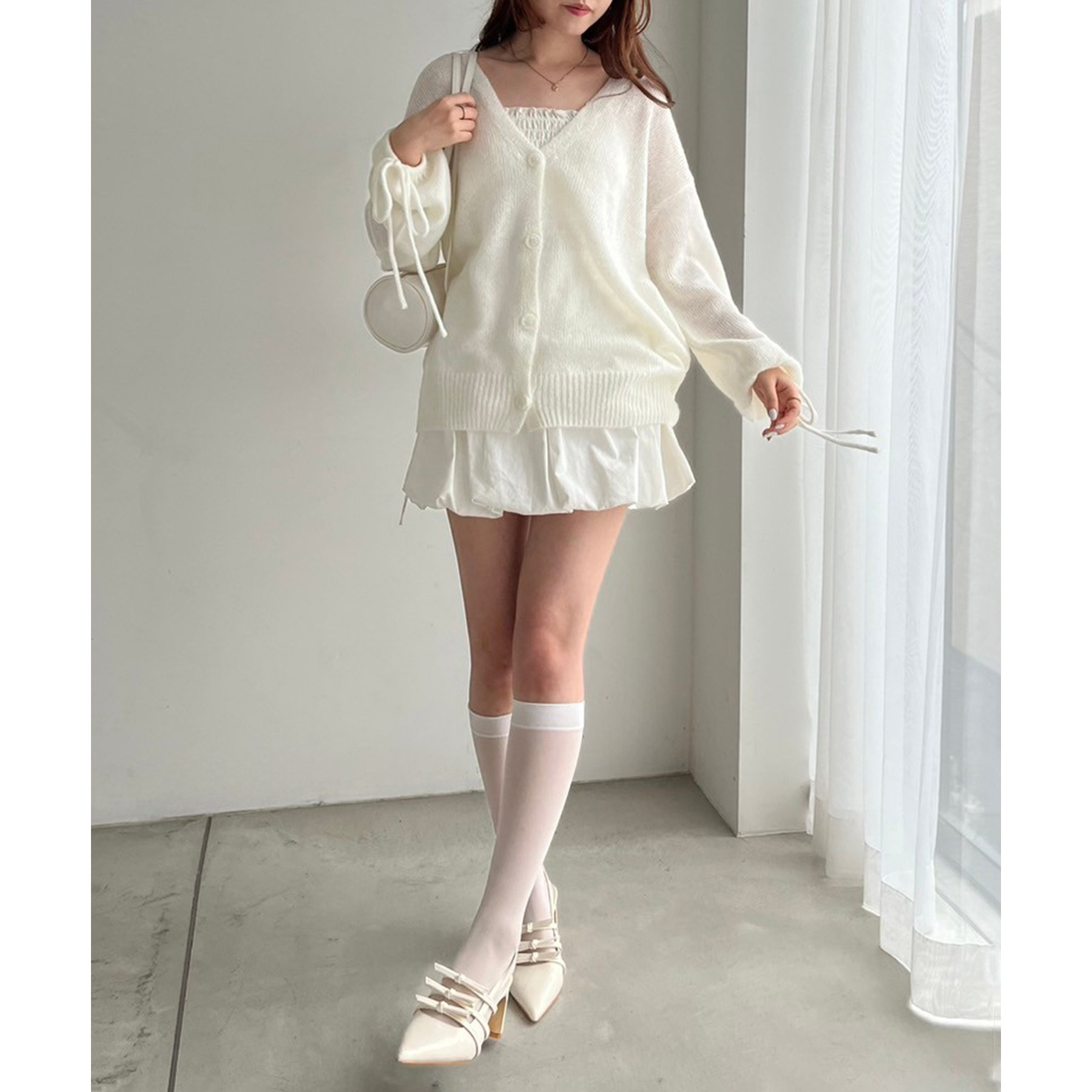 キャミソールを合わせて、ミニボトムで着こなすコーデがオススメ。