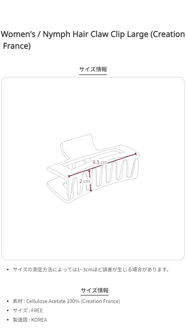 ルックにエレガンスと愛らしさをプラスしてくれるニンフ ヘアクロウクリップ ラージです。フランス製のセルロースアセテート素材で制作し、ほのかな光沢が上質で、軽いのに耐久性に優れています。全体のシェイプは曲線ラインを生かしたスムードなシルエットで、クラシックでありながらモダンな魅力が感じられます。Smoothmoodクラシックロゴを刻印し、所蔵価値を高めました。ハーフアップやフルツイストを簡単にスタイリングできるよう、スモール/ラージの2サイズで作りました。スモールは小さすぎず大きすぎないサイズで、髪の片側に着用したり、ハーフアップにできる大きさです。ラージは毛量が多い方でも十分にフルツイストが可能です。エッグクリームは柔らかく淡いクリームトーン、カラメロは落ち着いたフェミニンなキャラメルカラー、マホガニーは濃いウイスキーのような深く濃いダークブラウンで、ほのかな木目が感じられ上質です。ウィンターブルーはサクッとしてフレッシュなスカイブルーです。4つの感覚的なニューカラーをお楽しみください。ㆍセルロースアセテート (Creation France)ㆍLarge SizeㆍEgg Cream / Caramelo / Mahogany / Winter BlueㆍSmoothdmood Logo*制作工程上、接着部分の接着剤が見える場合がありますが、この部分は正常です*Mahoganyカラーは素材固有の特性上、パターンは一定ではなく、カラートーンと濃度は各製品により差があります