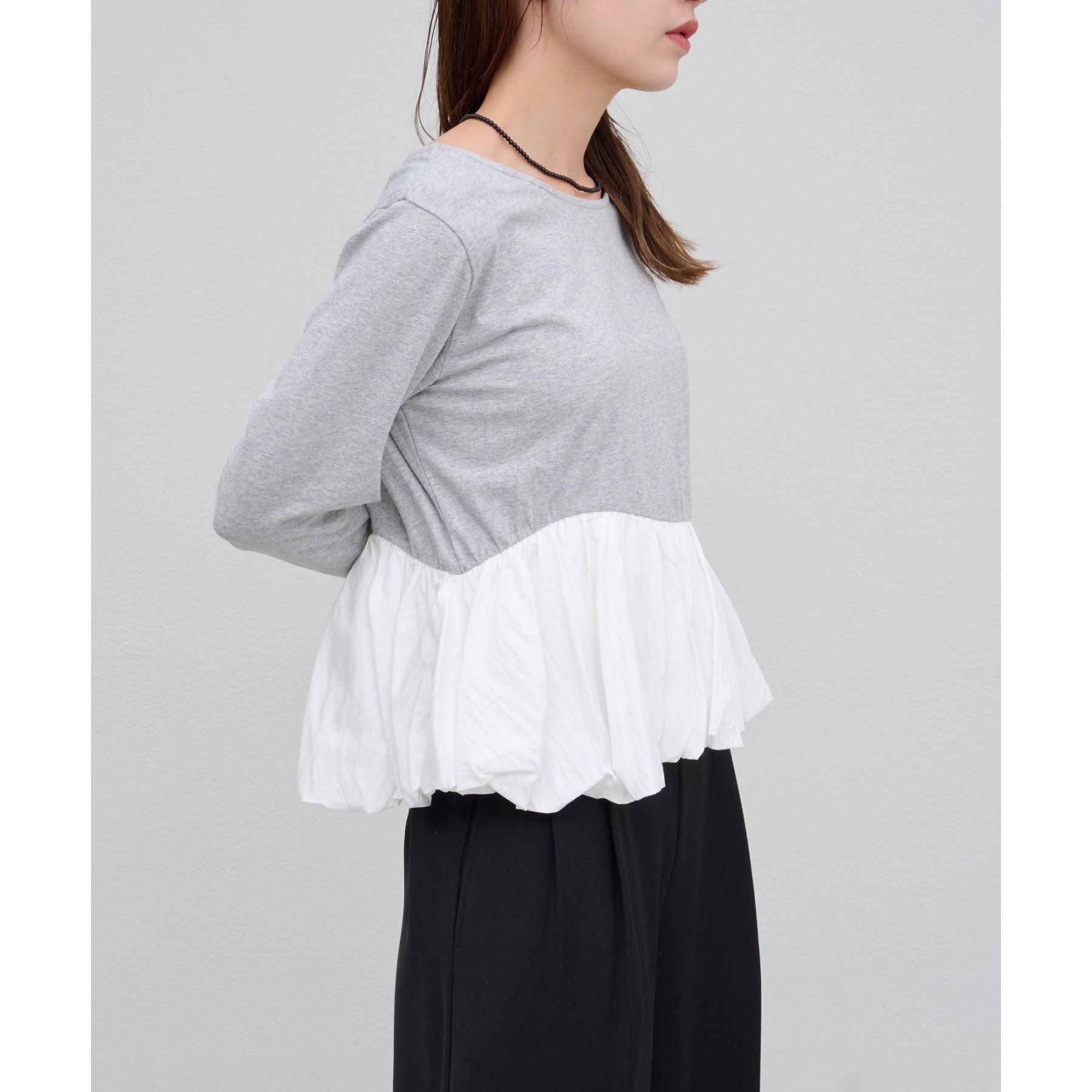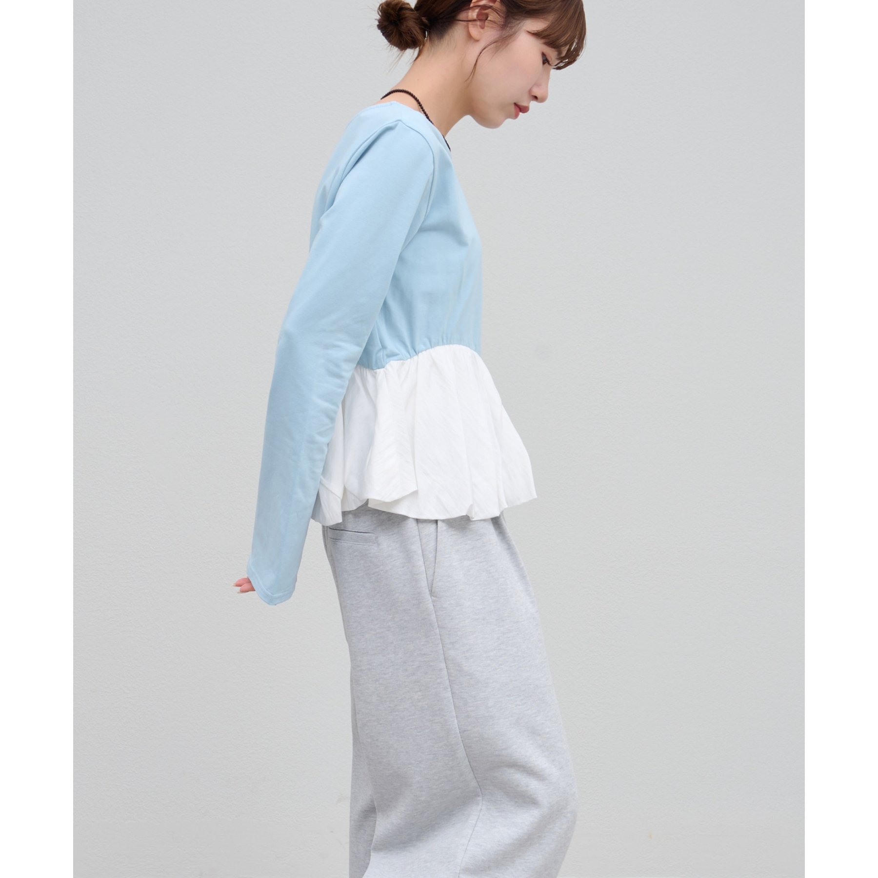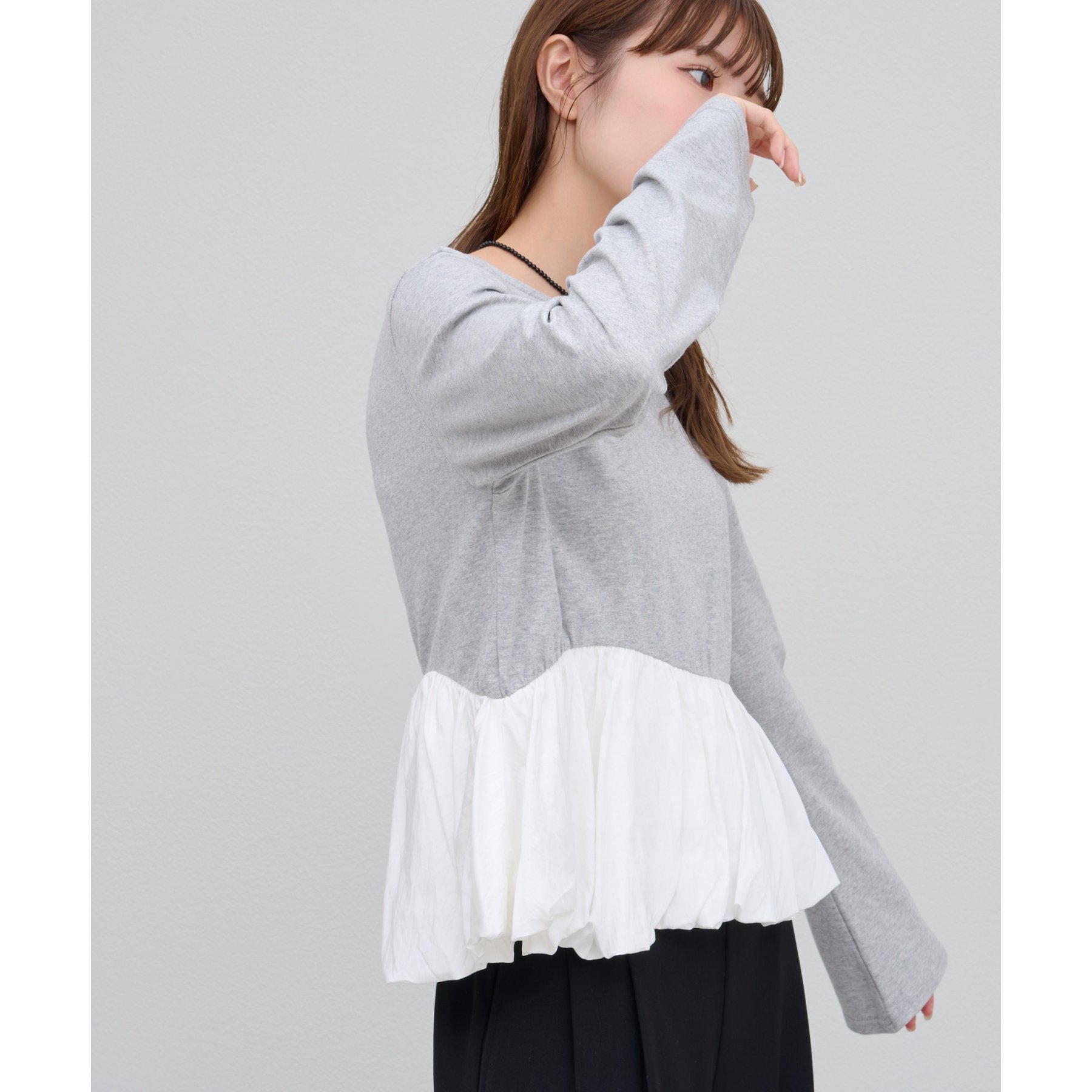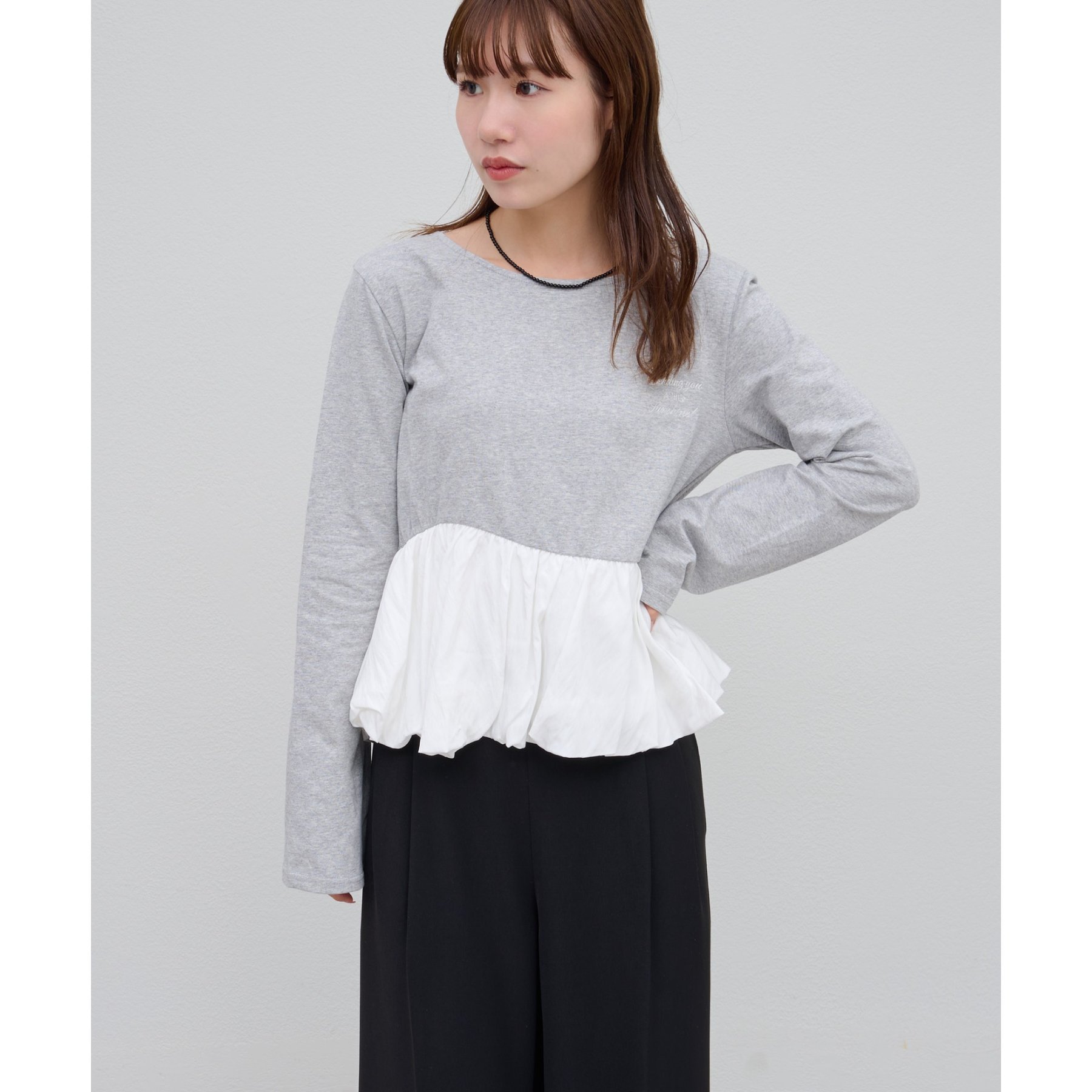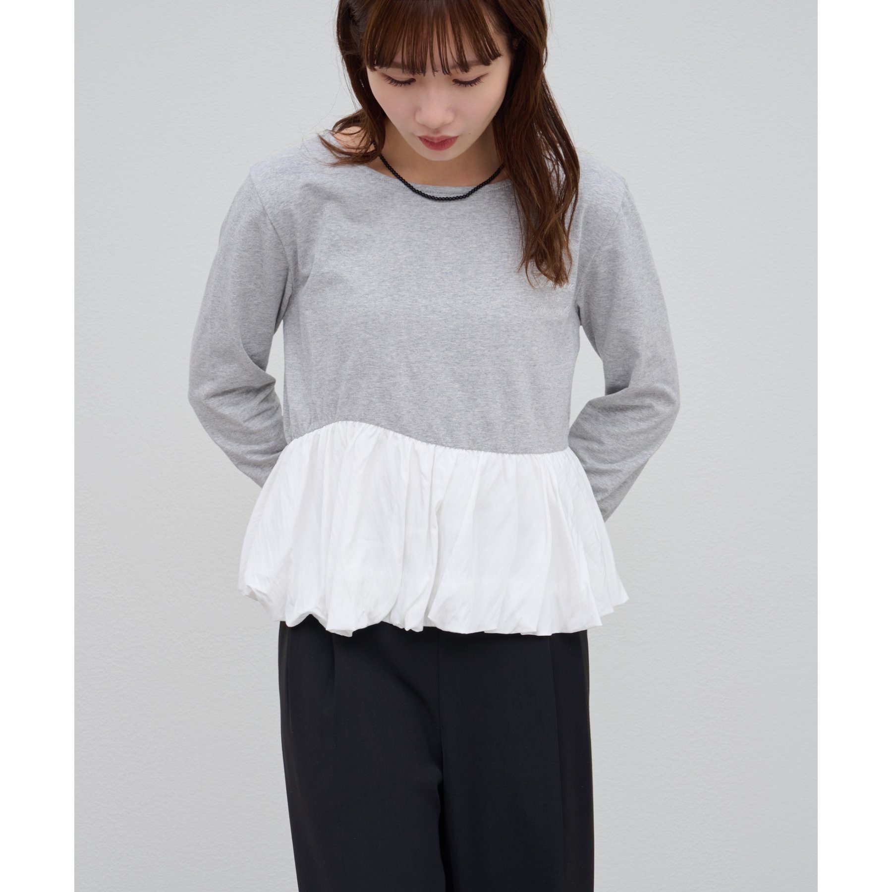上身頃はスウェットライクなカットソー素材、裾部分はふんわり広がる布帛のバルーンデザインで、異素材の組み合わせがフェミニンな印象をプラスします♪