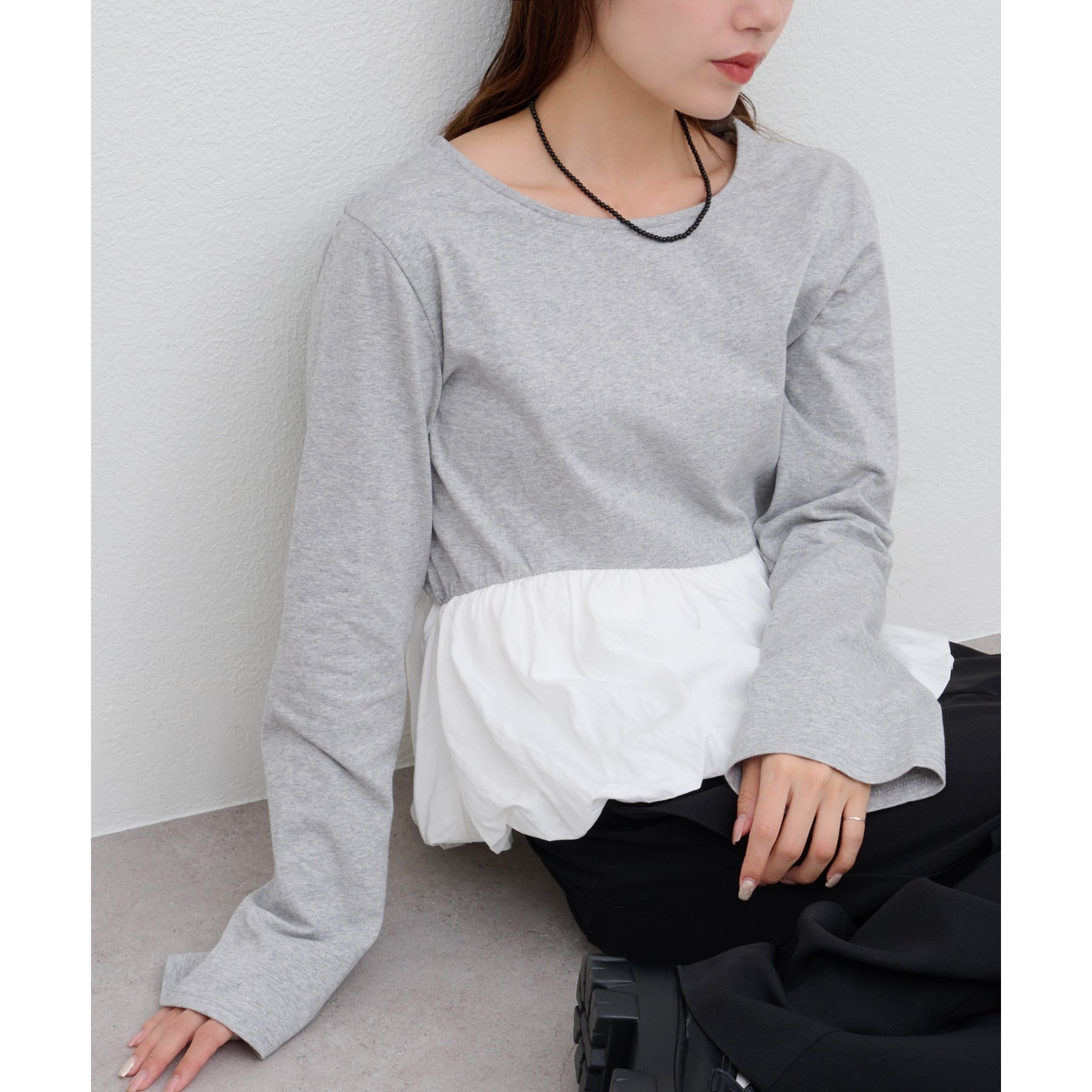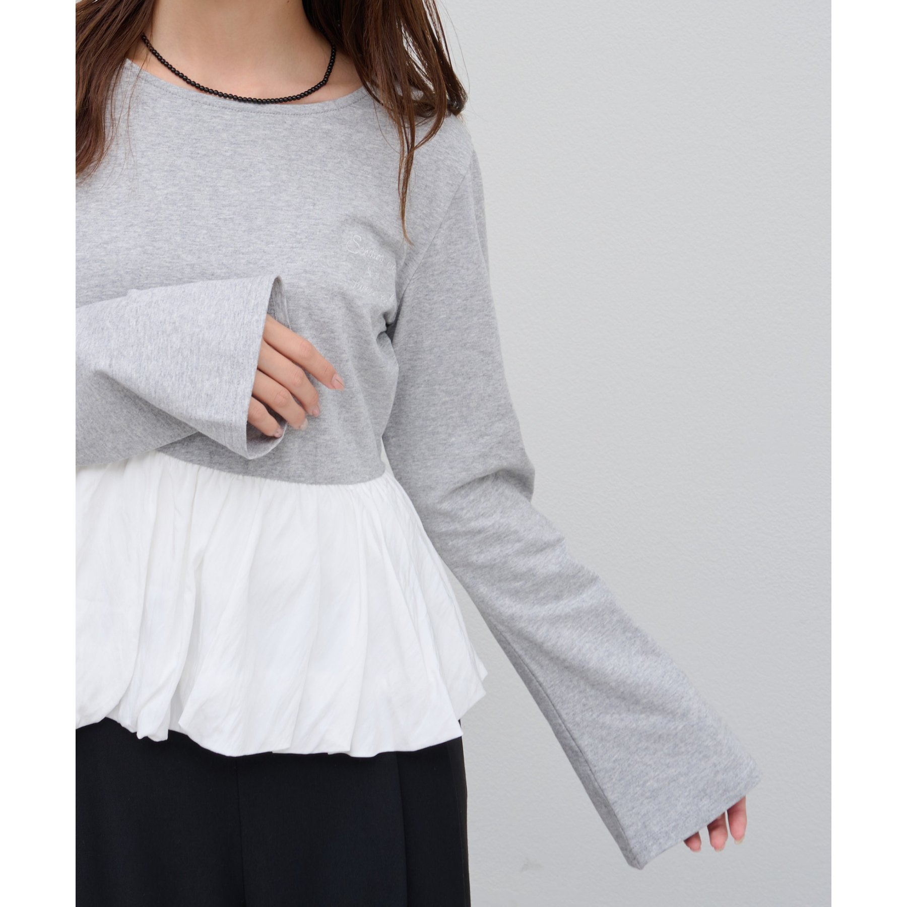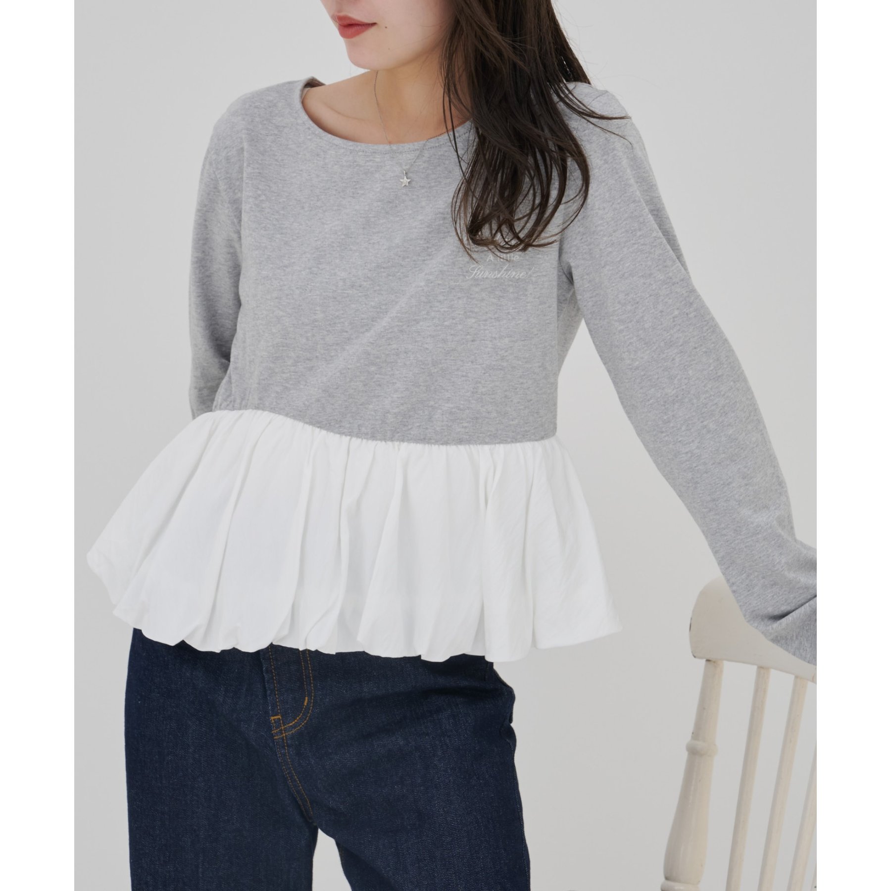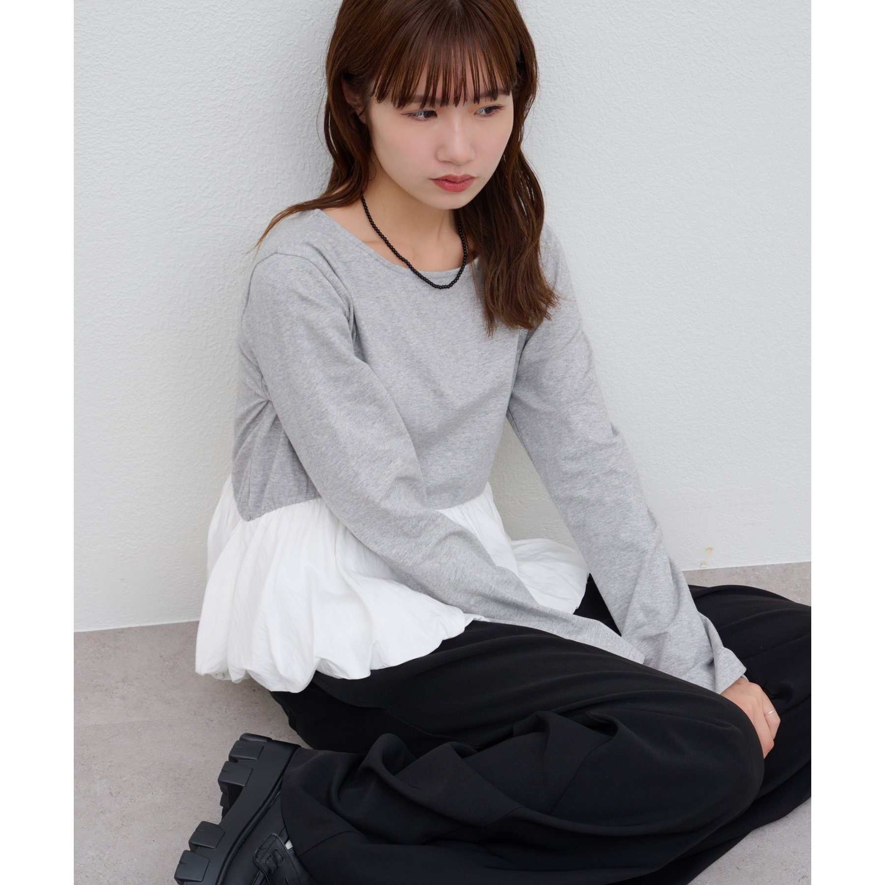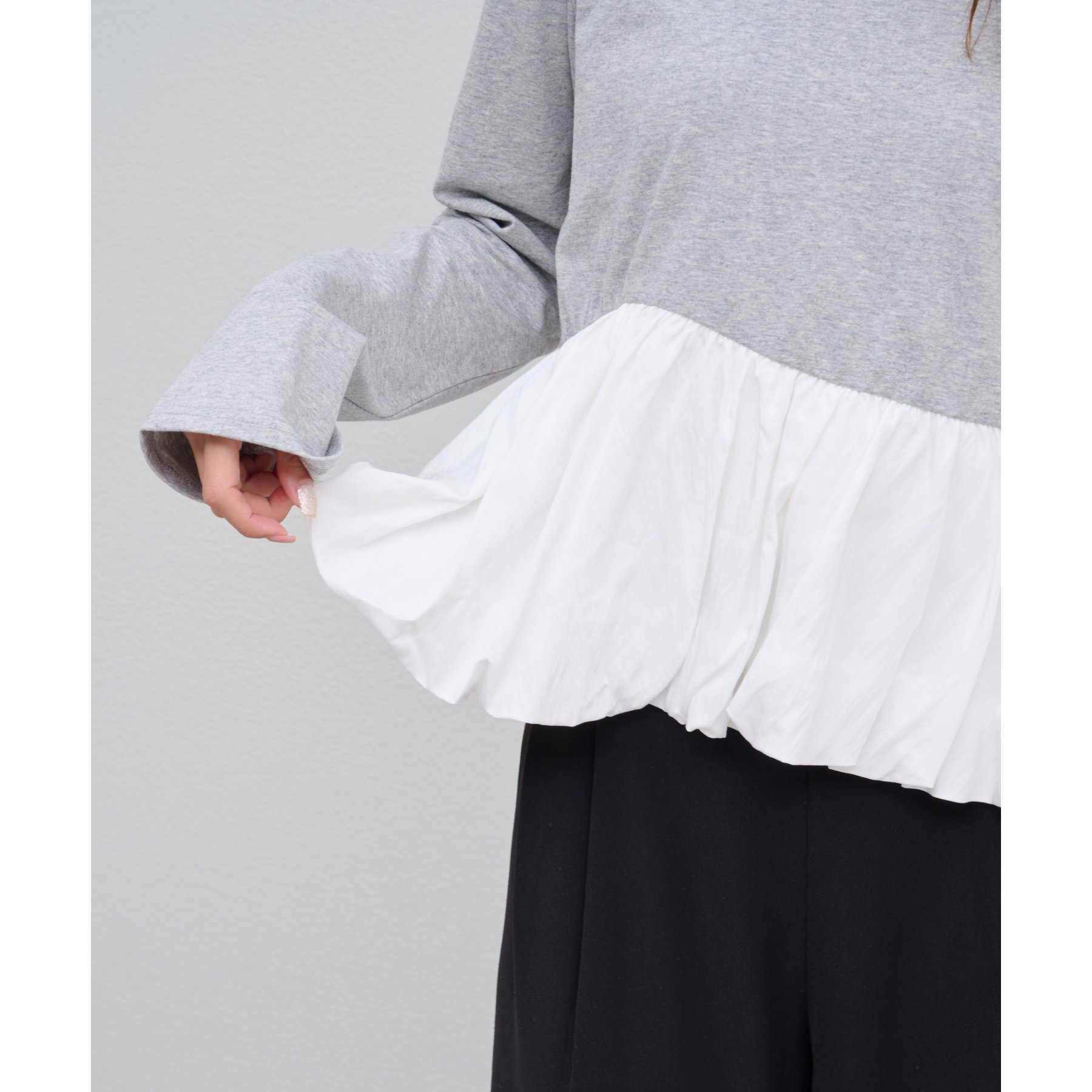 上身頃はスウェットライクなカットソー素材、裾部分はふんわり広がる布帛のバルーンデザインで、異素材の組み合わせがフェミニンな印象をプラスします♪