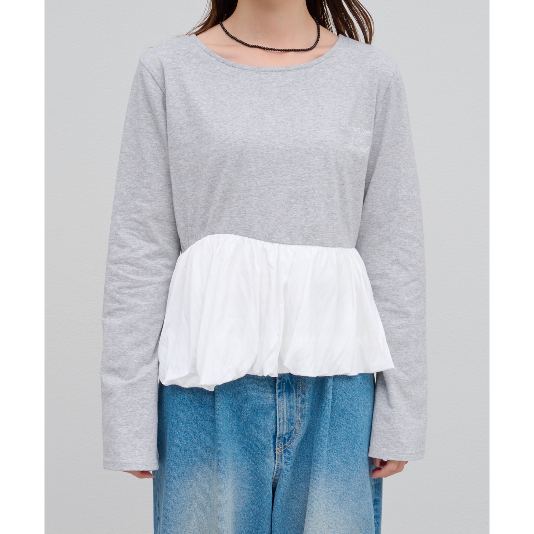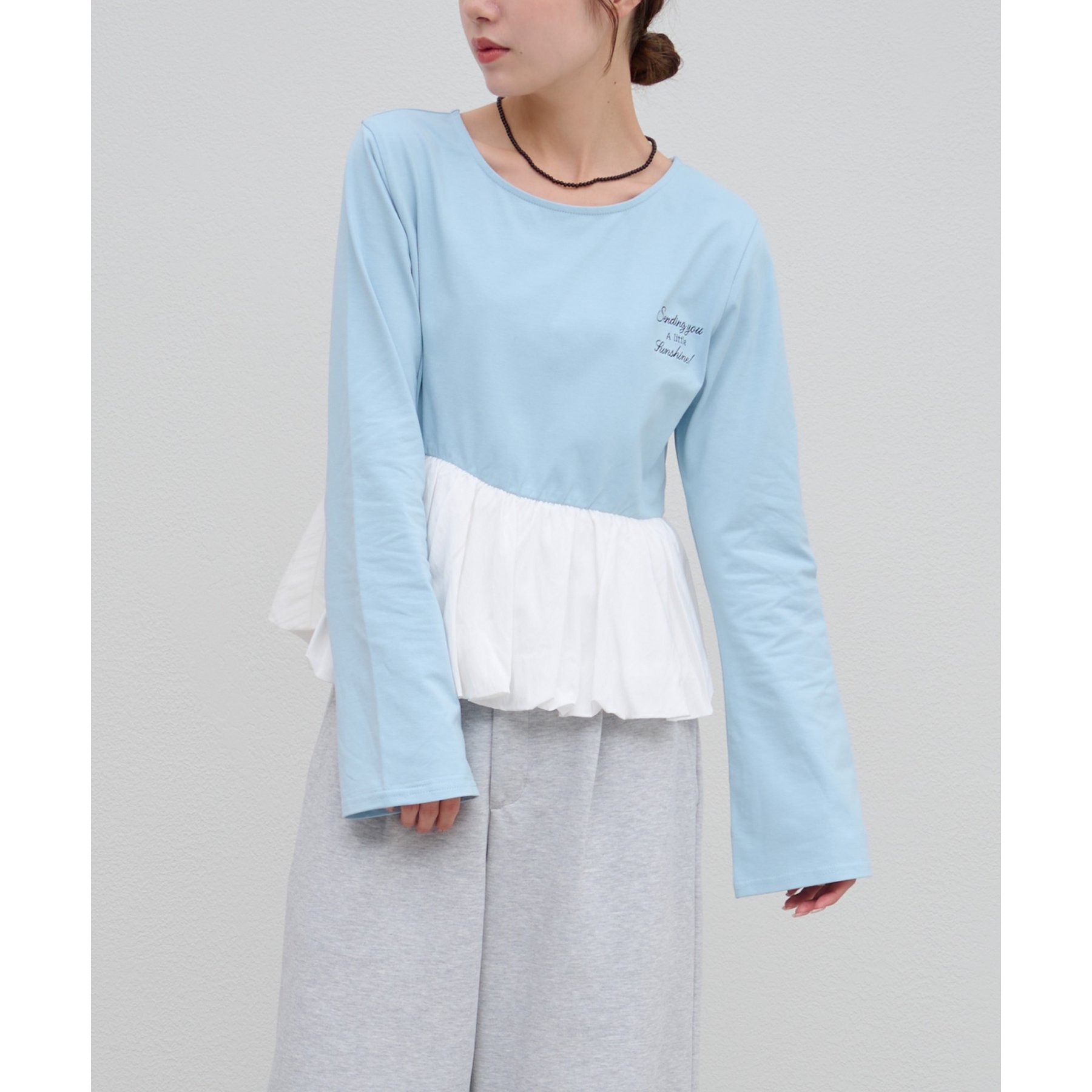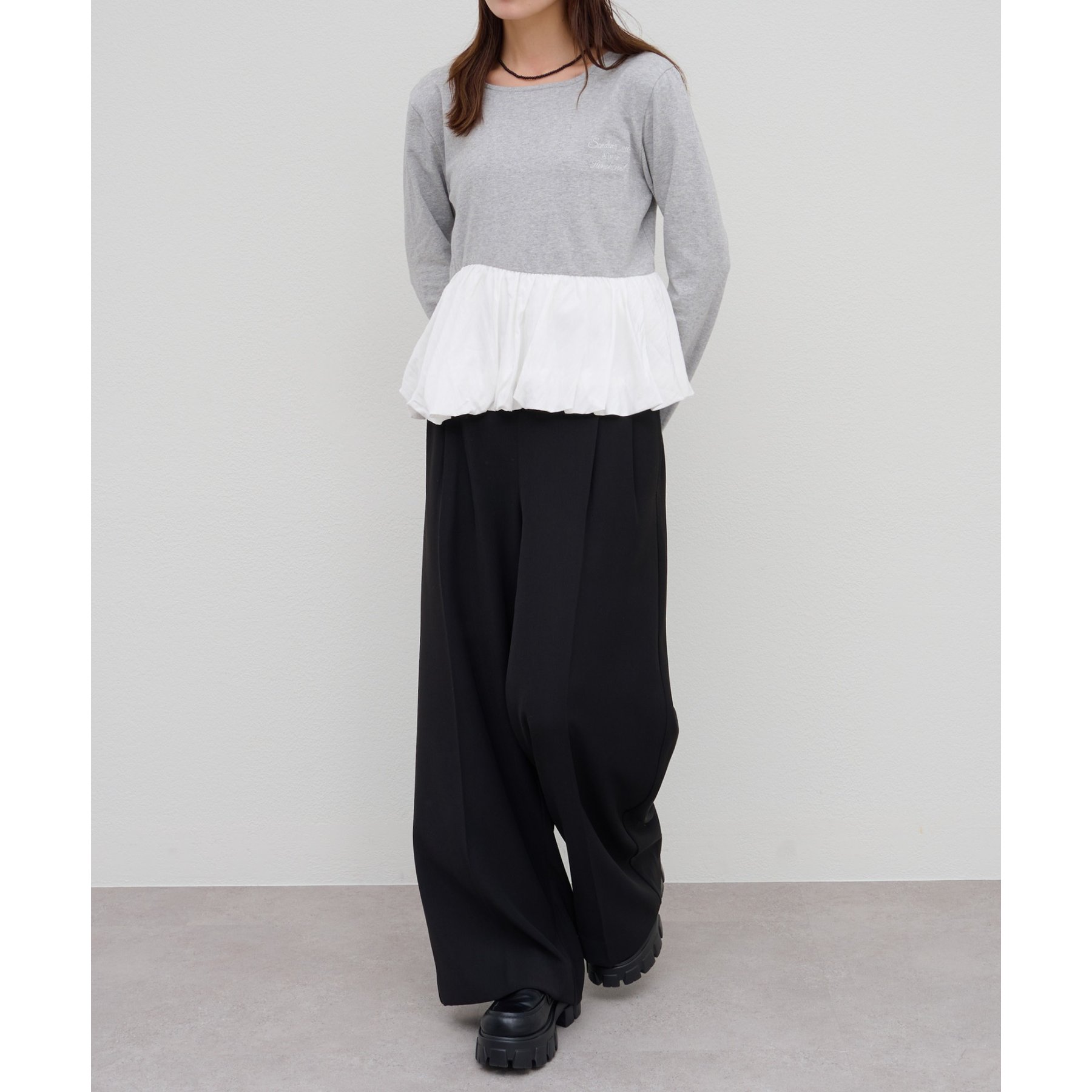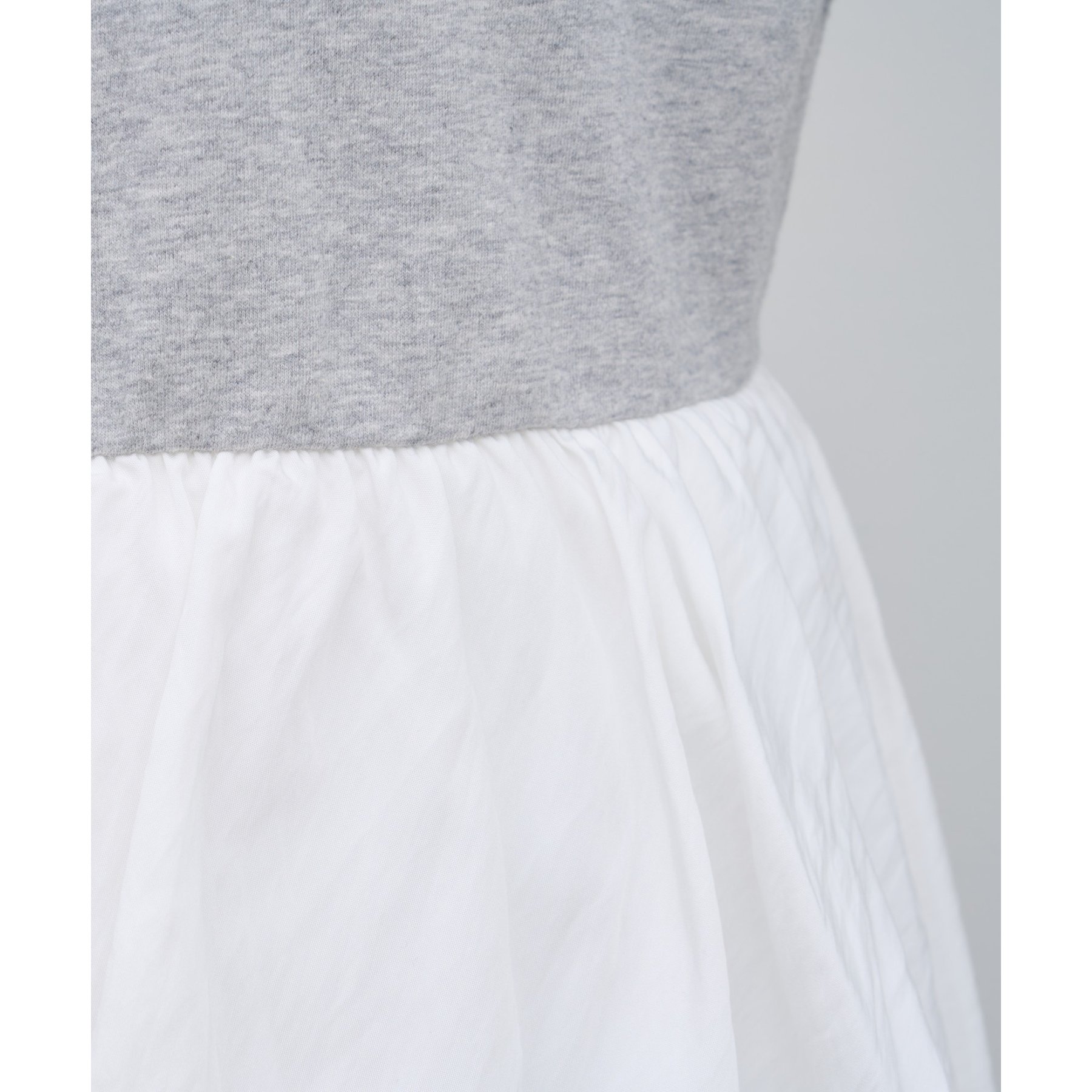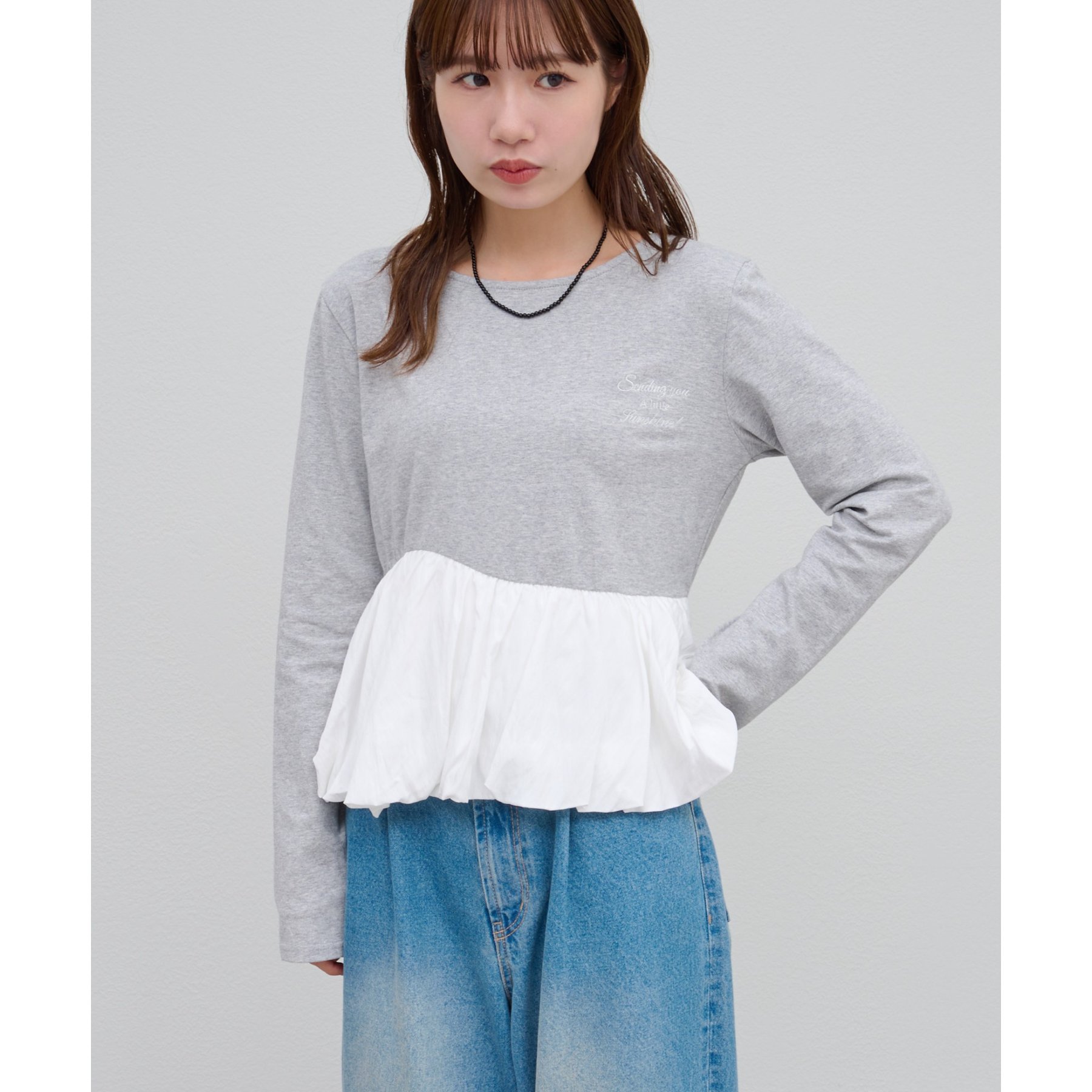 上身頃はスウェットライクなカットソー素材、裾部分はふんわり広がる布帛のバルーンデザインで、異素材の組み合わせがフェミニンな印象をプラスします♪