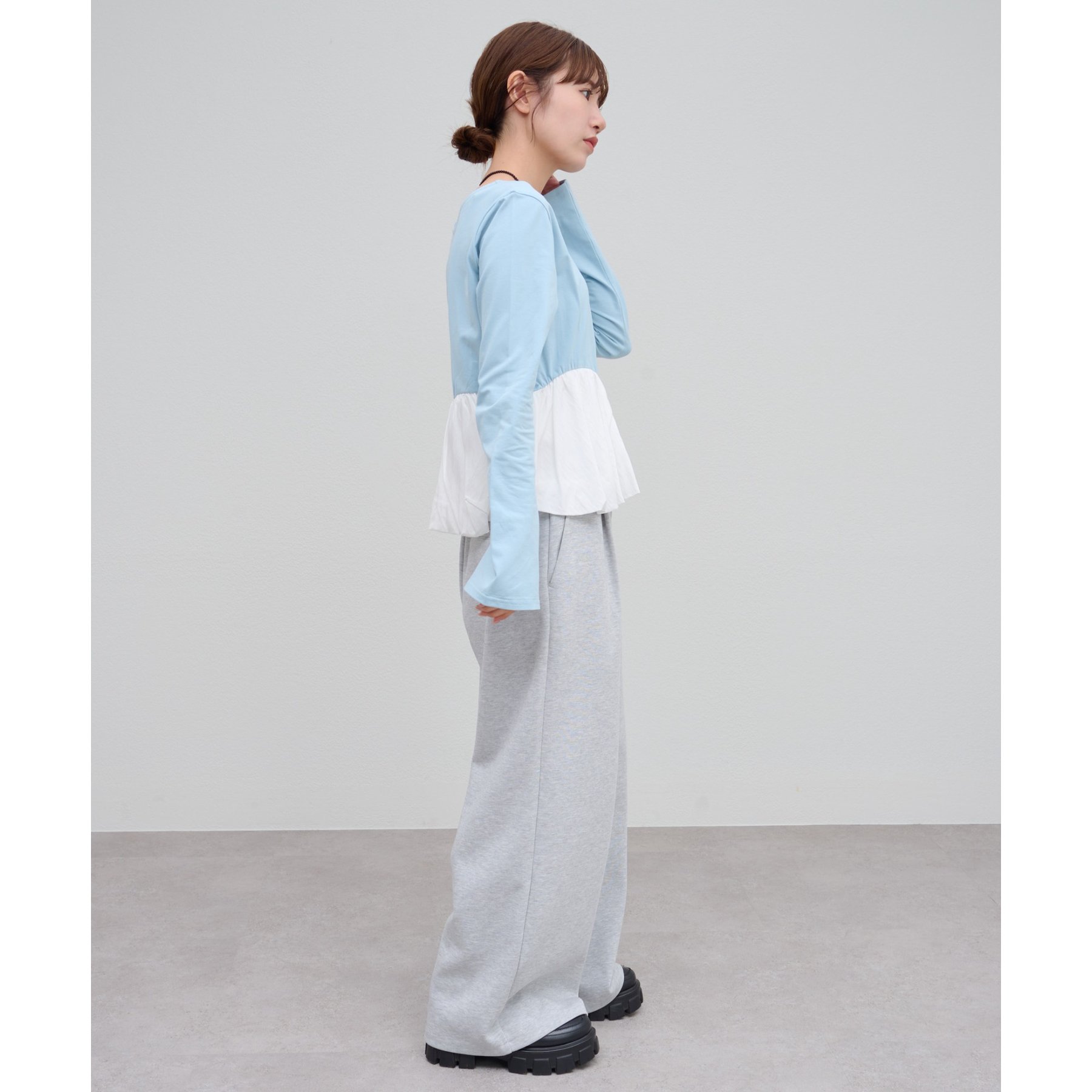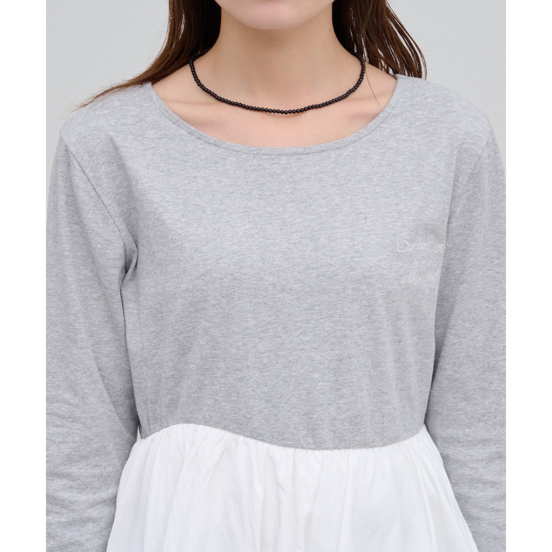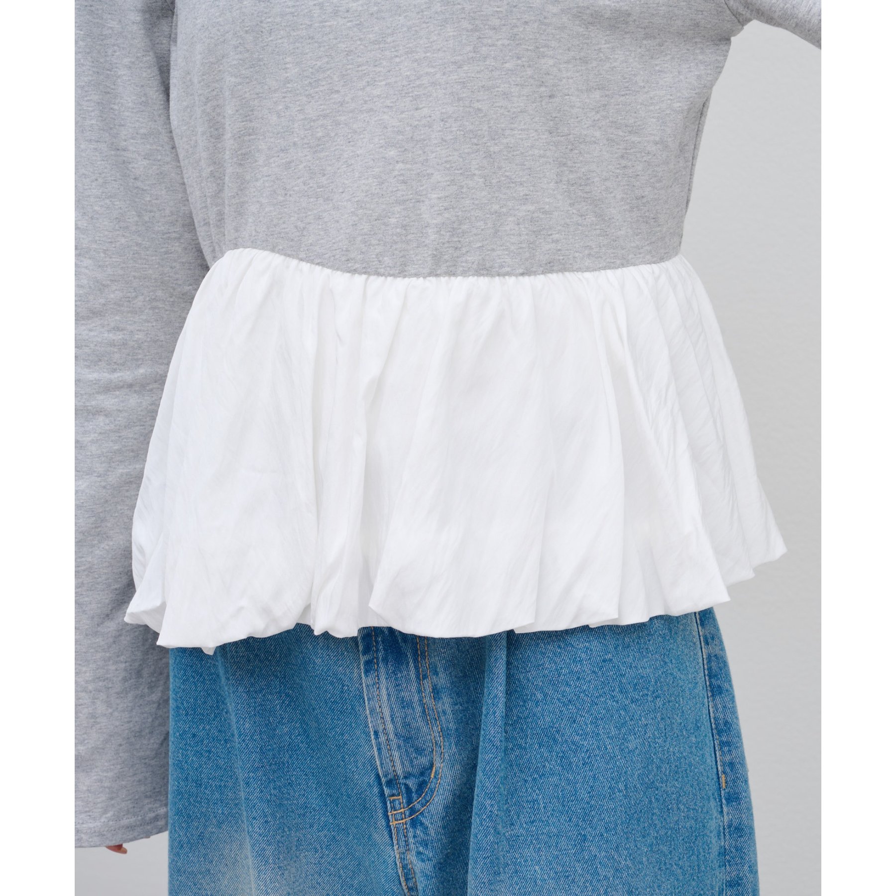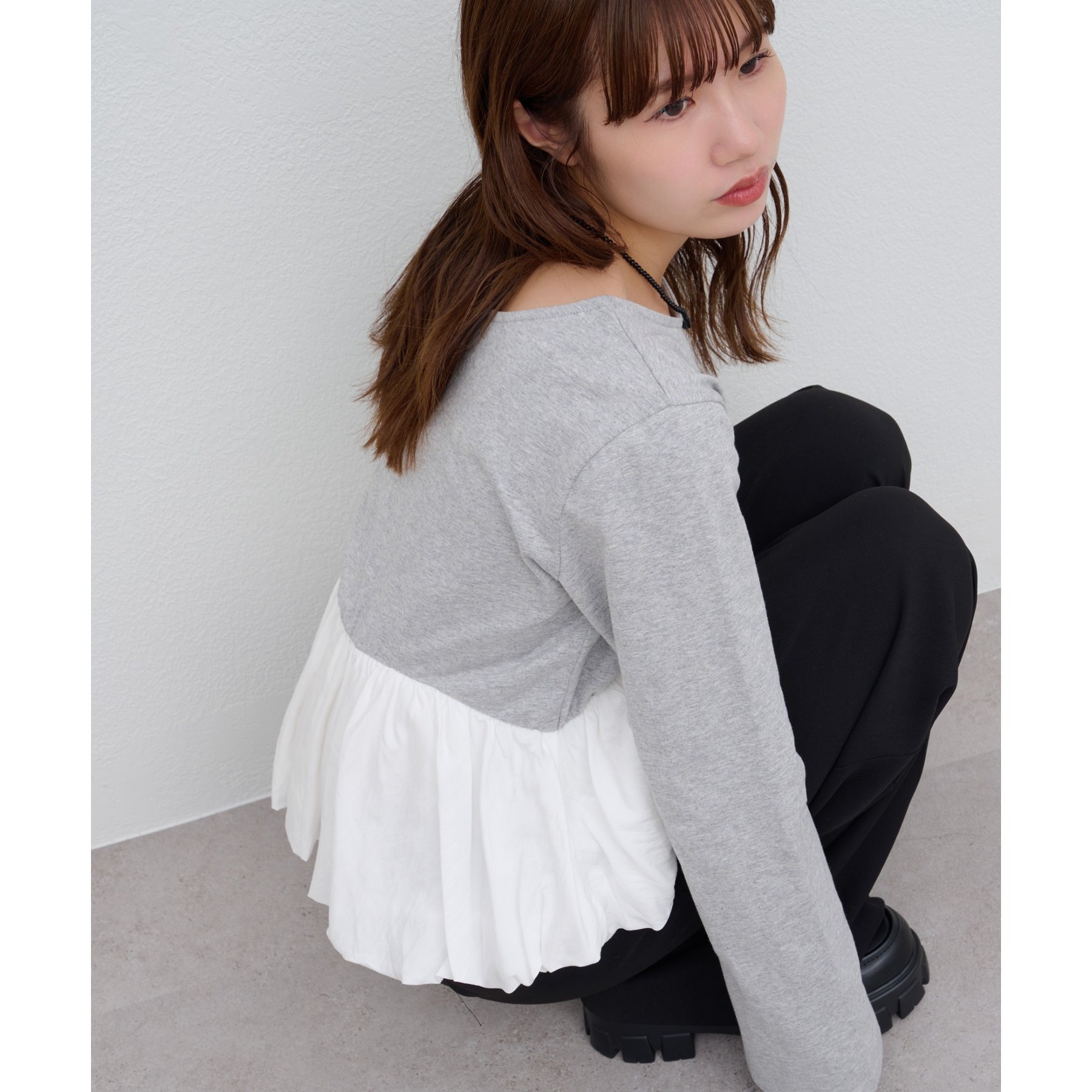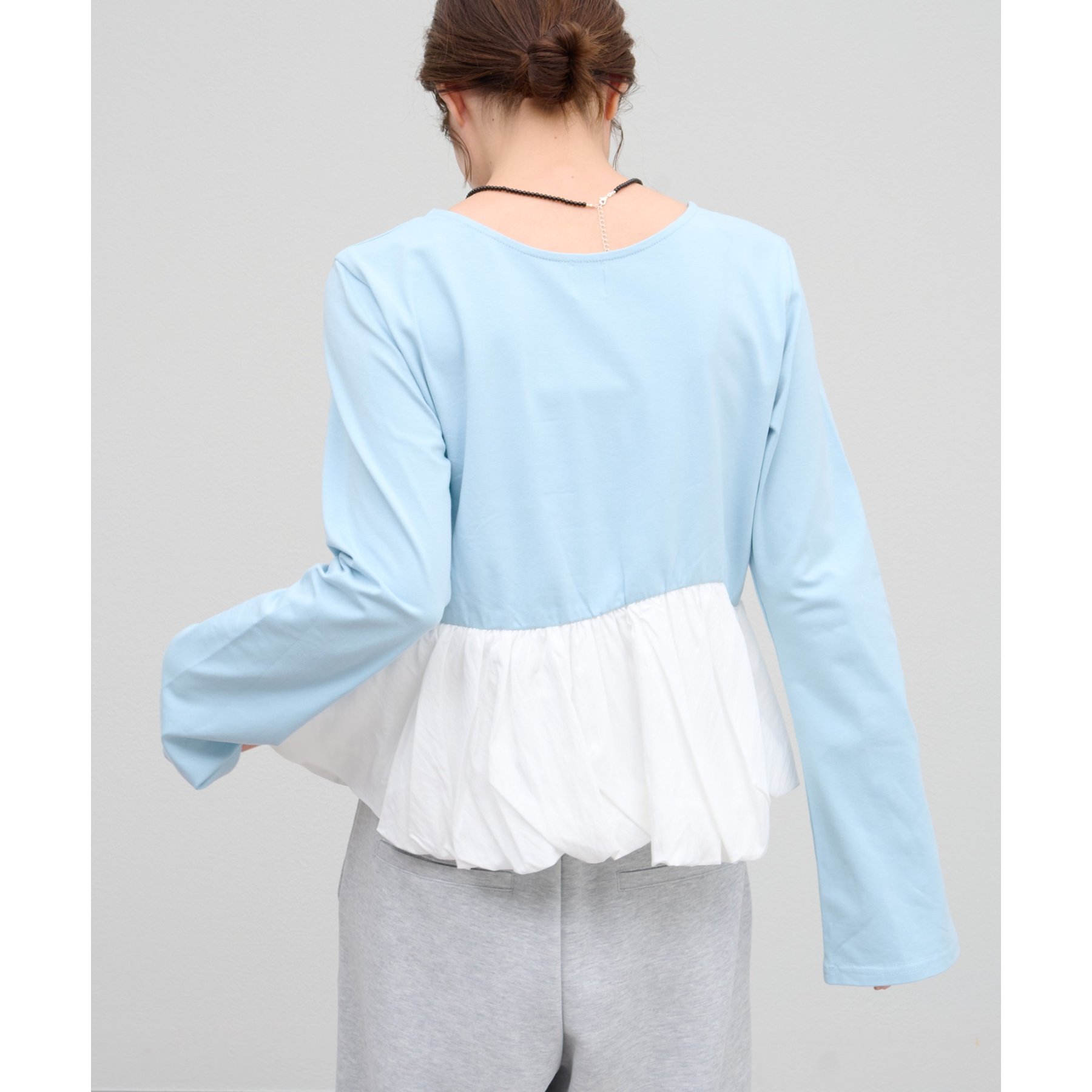 上身頃はスウェットライクなカットソー素材、裾部分はふんわり広がる布帛のバルーンデザインで、異素材の組み合わせがフェミニンな印象をプラスします♪