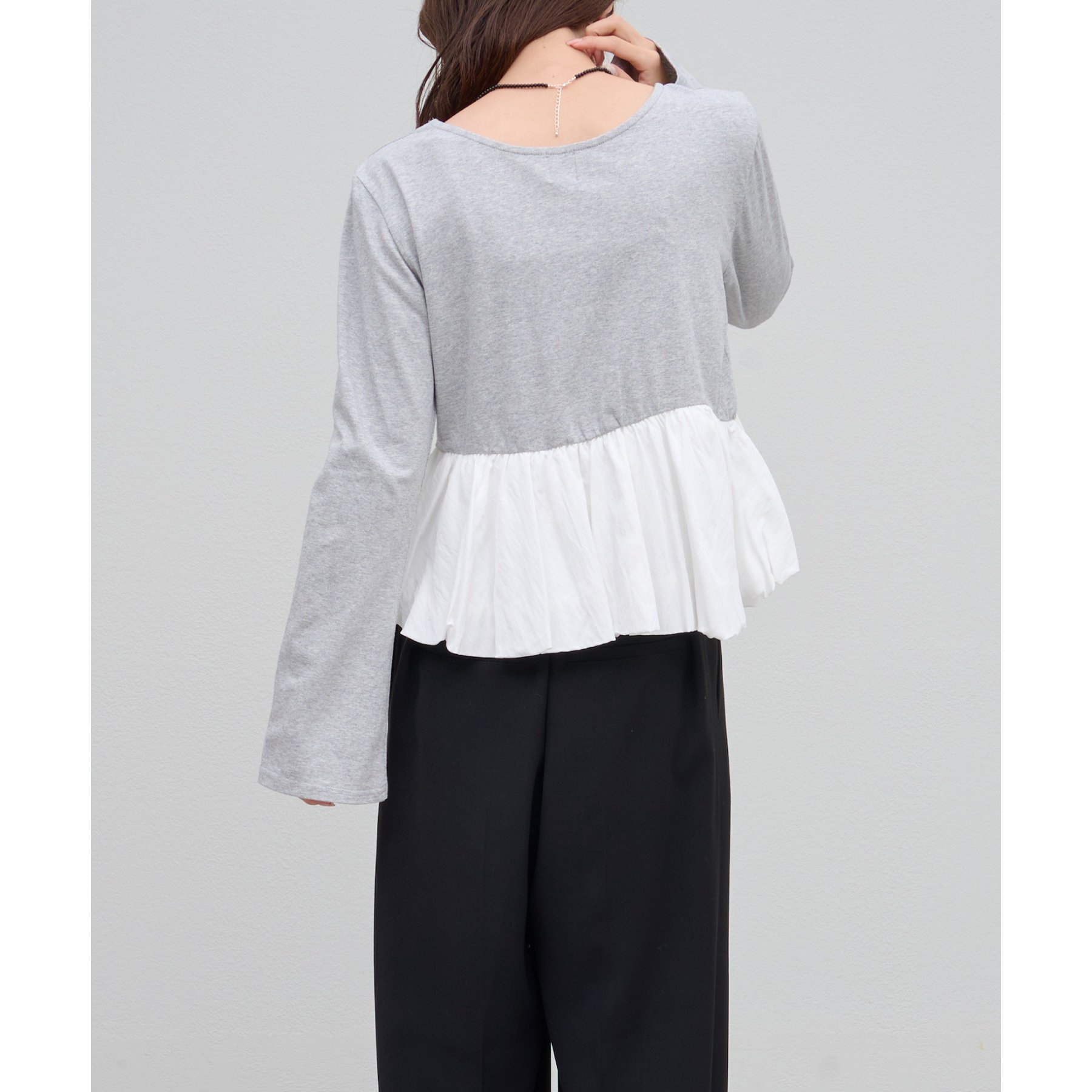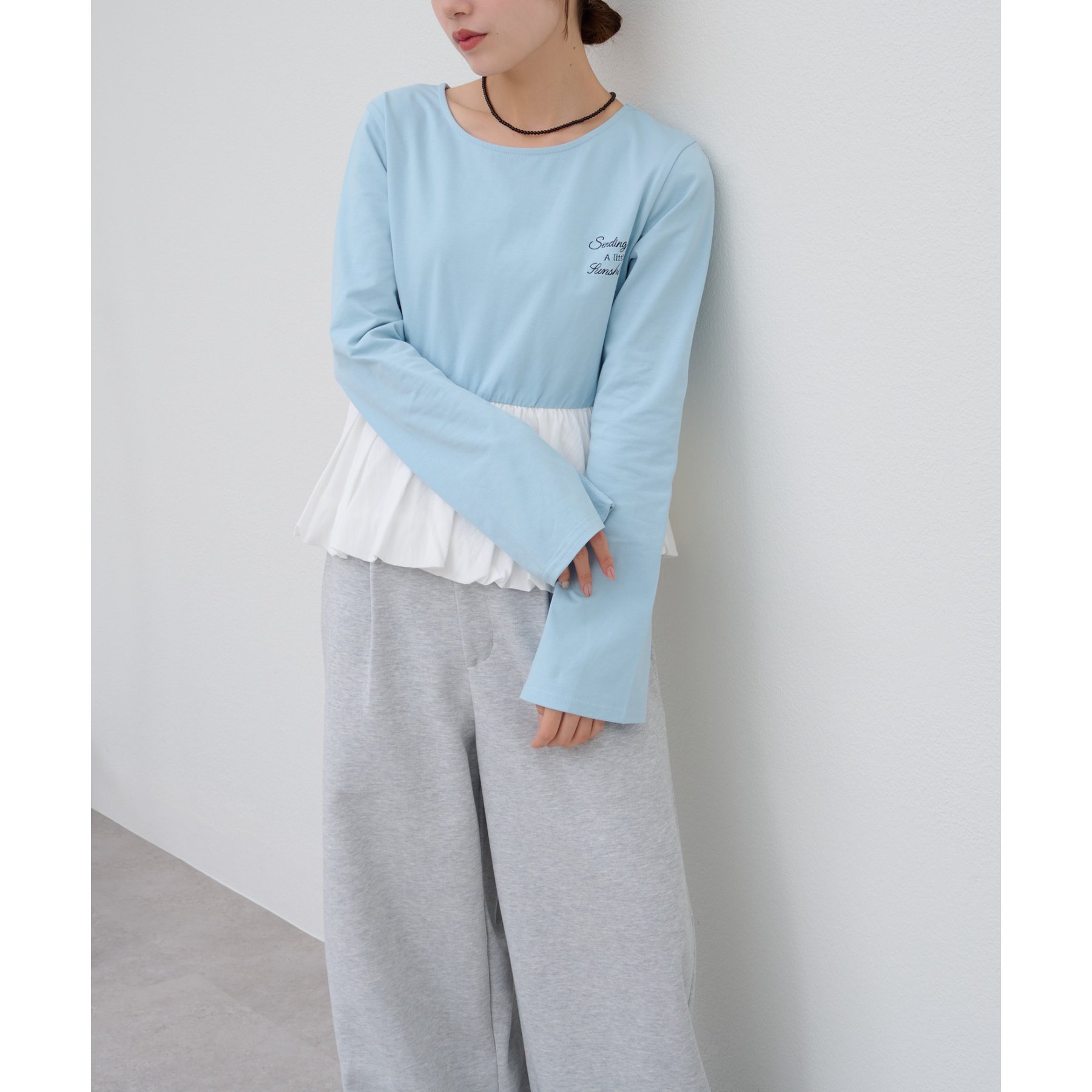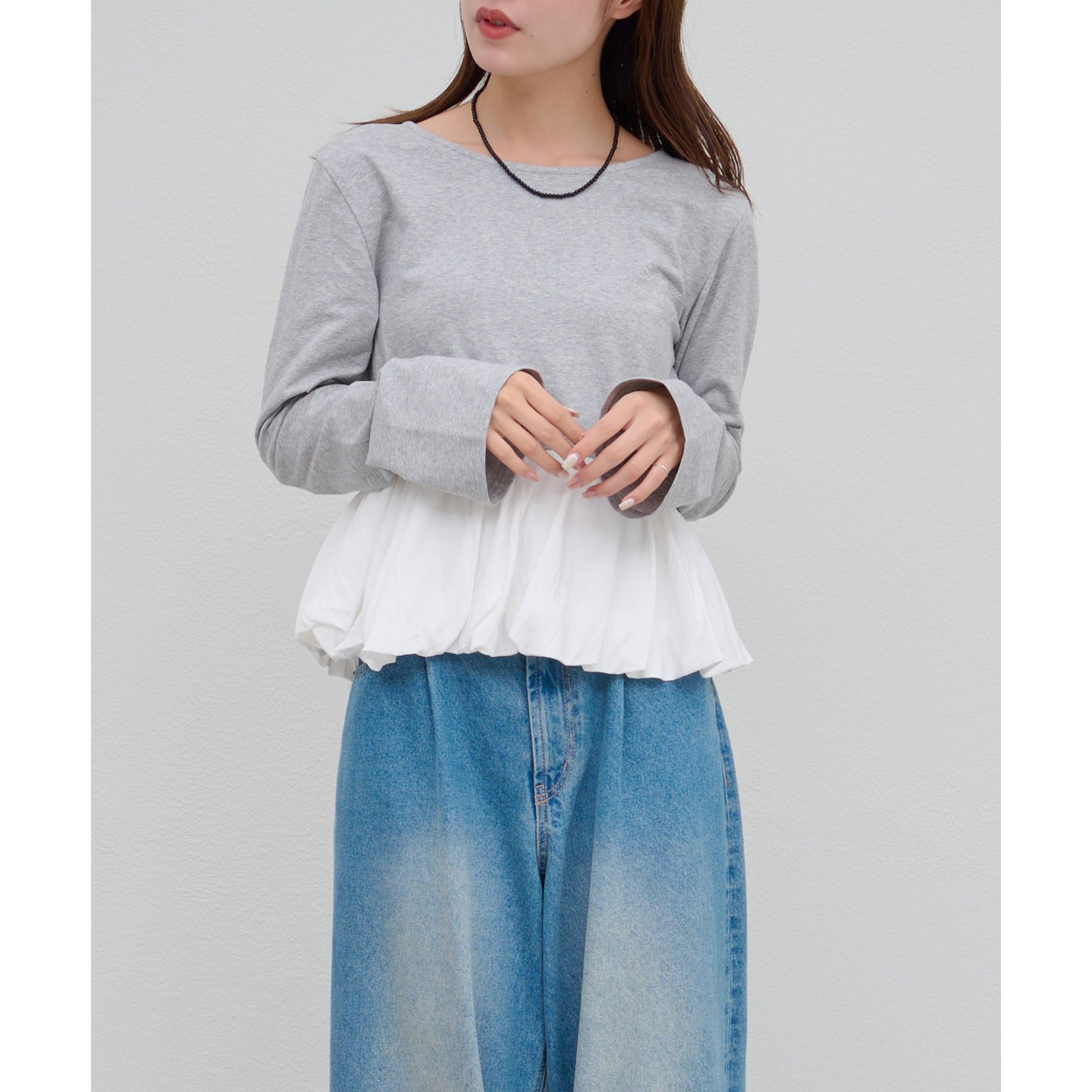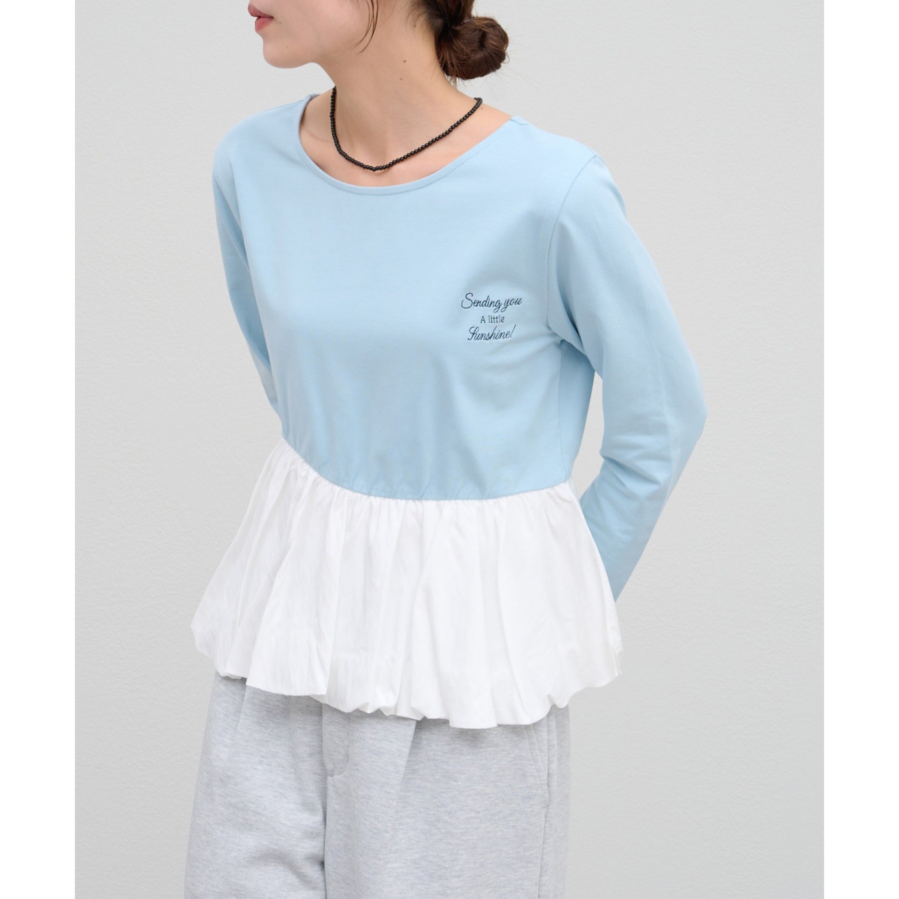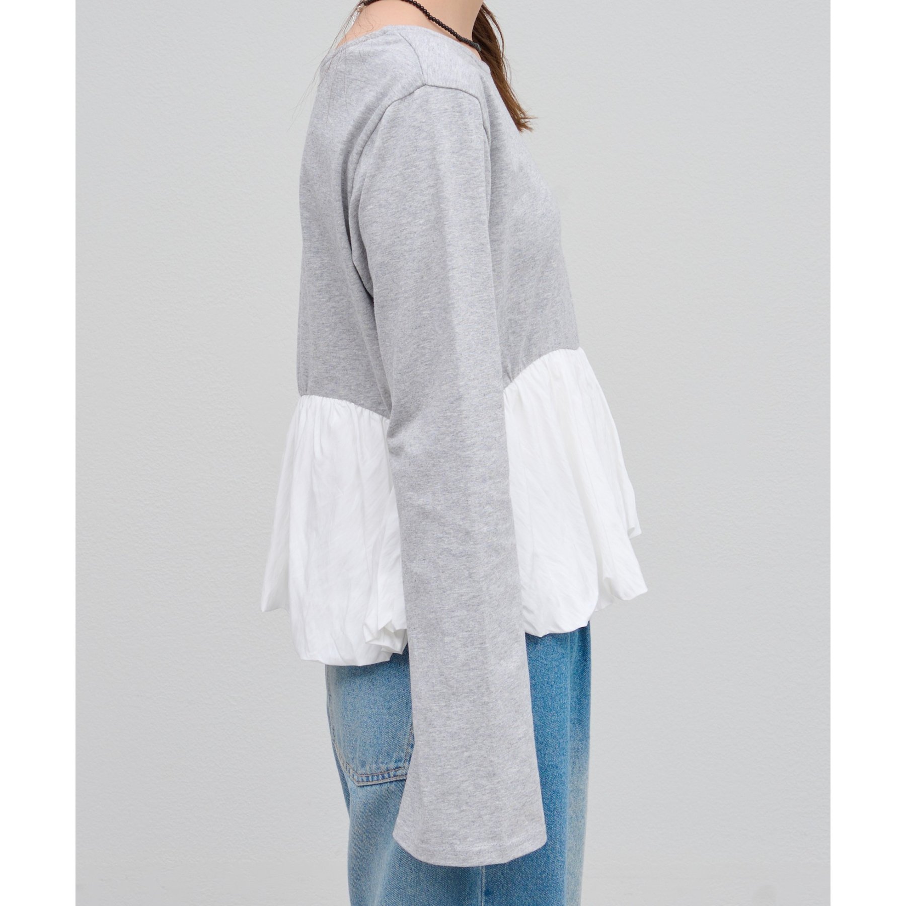 上身頃はスウェットライクなカットソー素材、裾部分はふんわり広がる布帛のバルーンデザインで、異素材の組み合わせがフェミニンな印象をプラスします♪