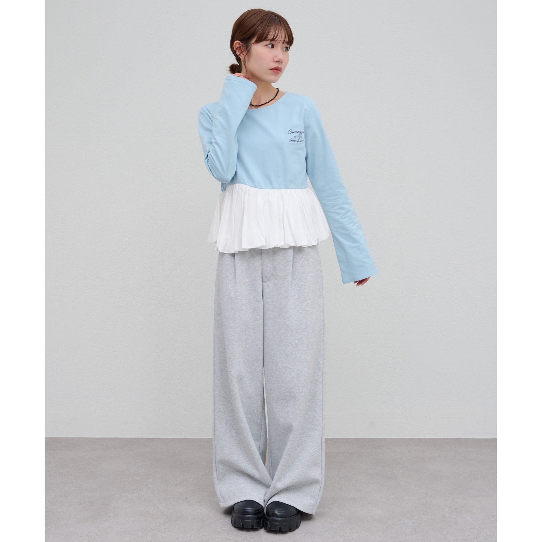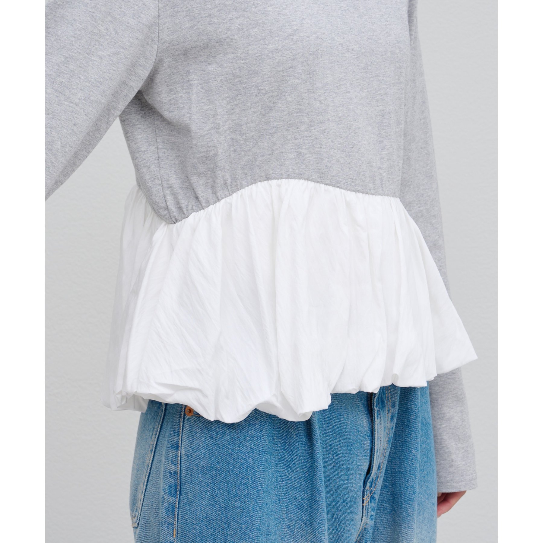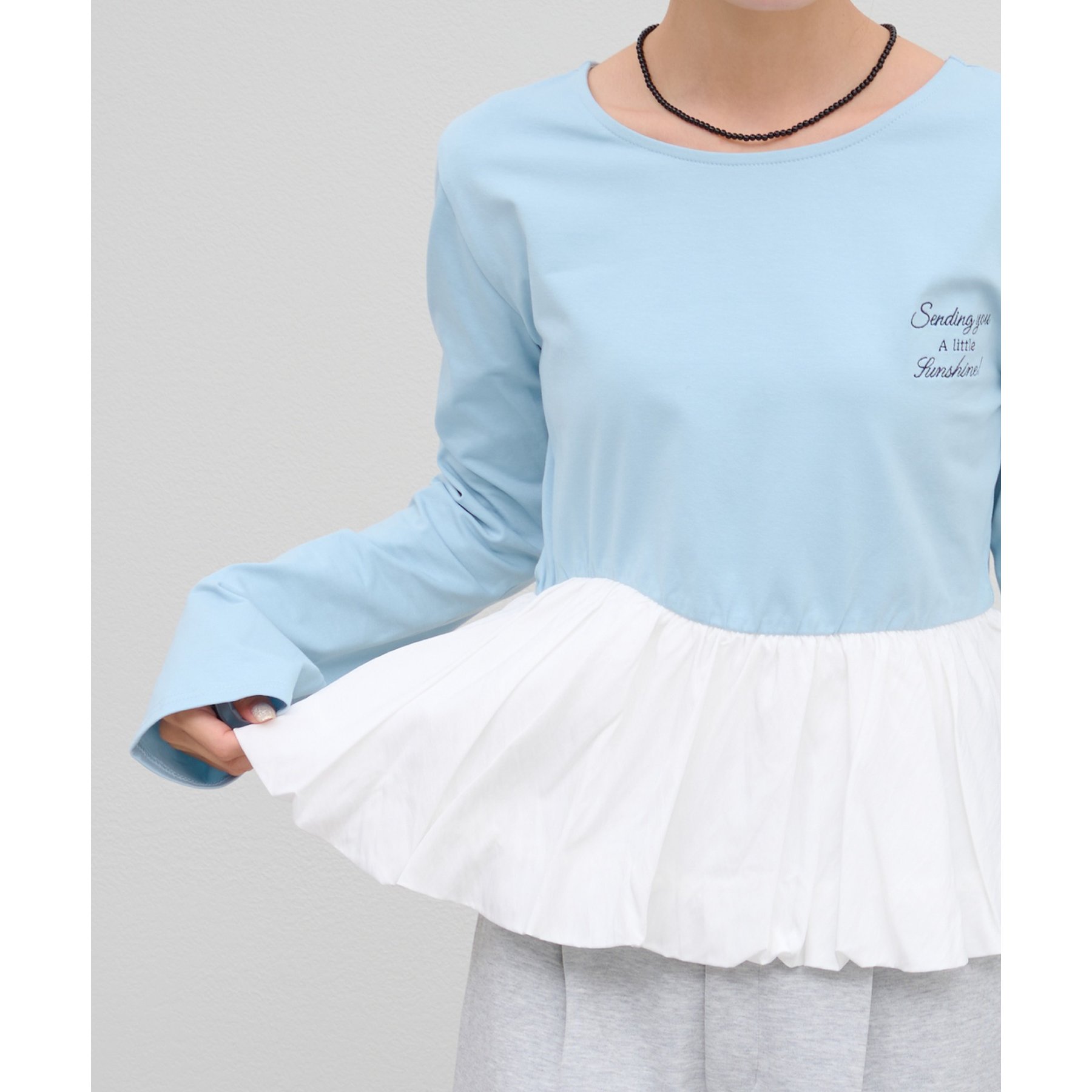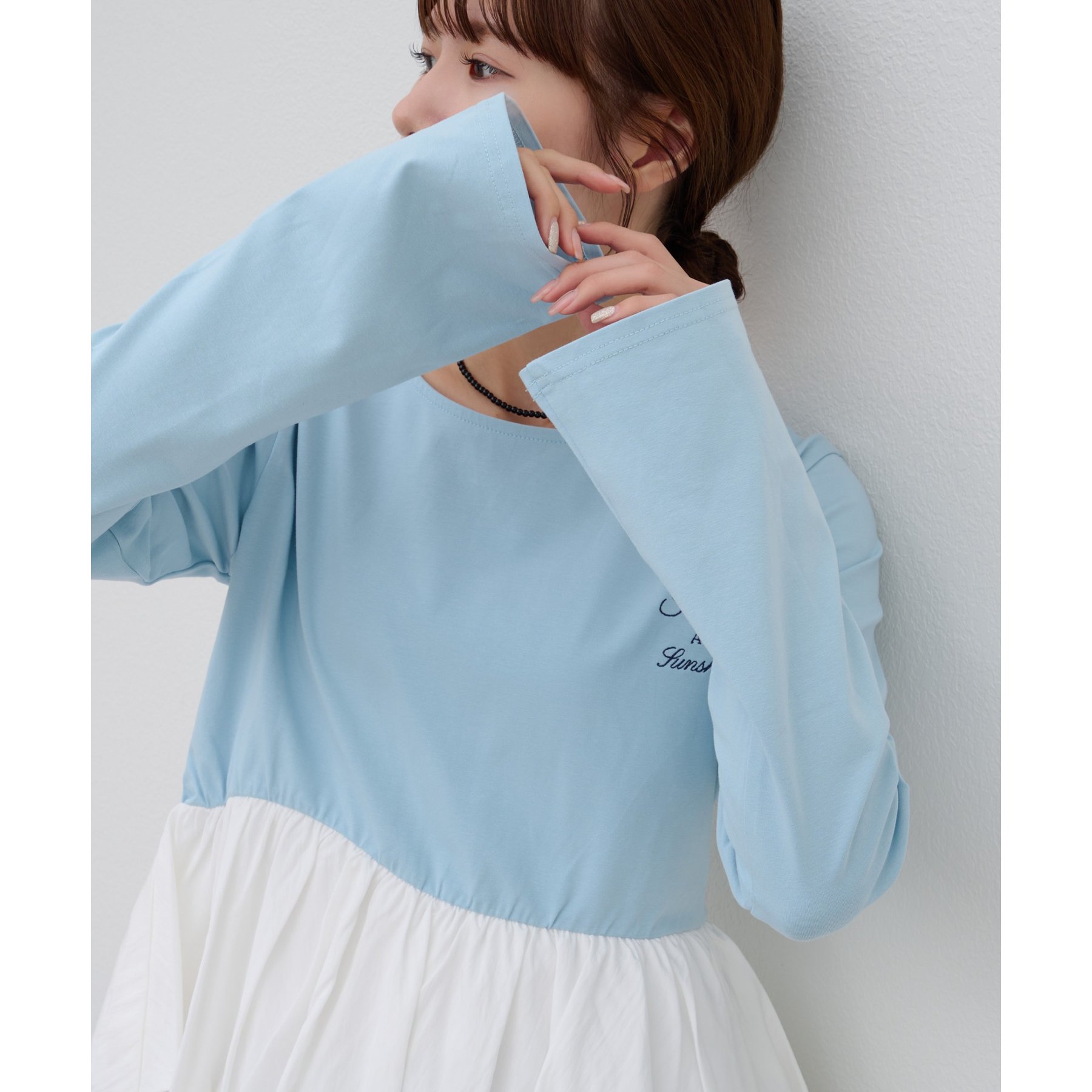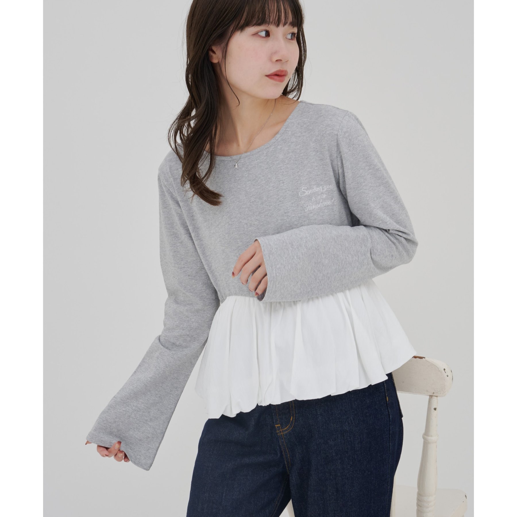 上身頃はスウェットライクなカットソー素材、裾部分はふんわり広がる布帛のバルーンデザインで、異素材の組み合わせがフェミニンな印象をプラスします♪