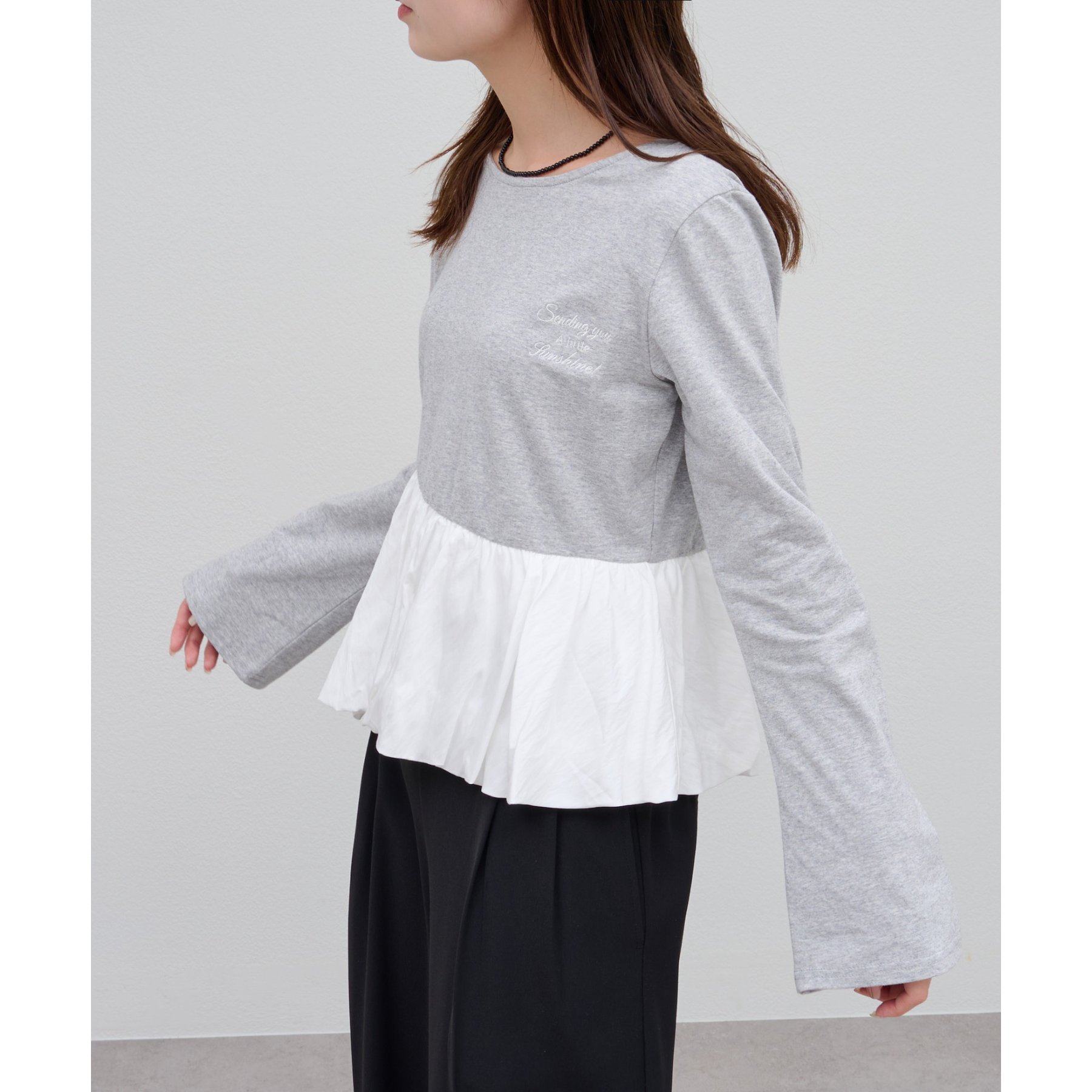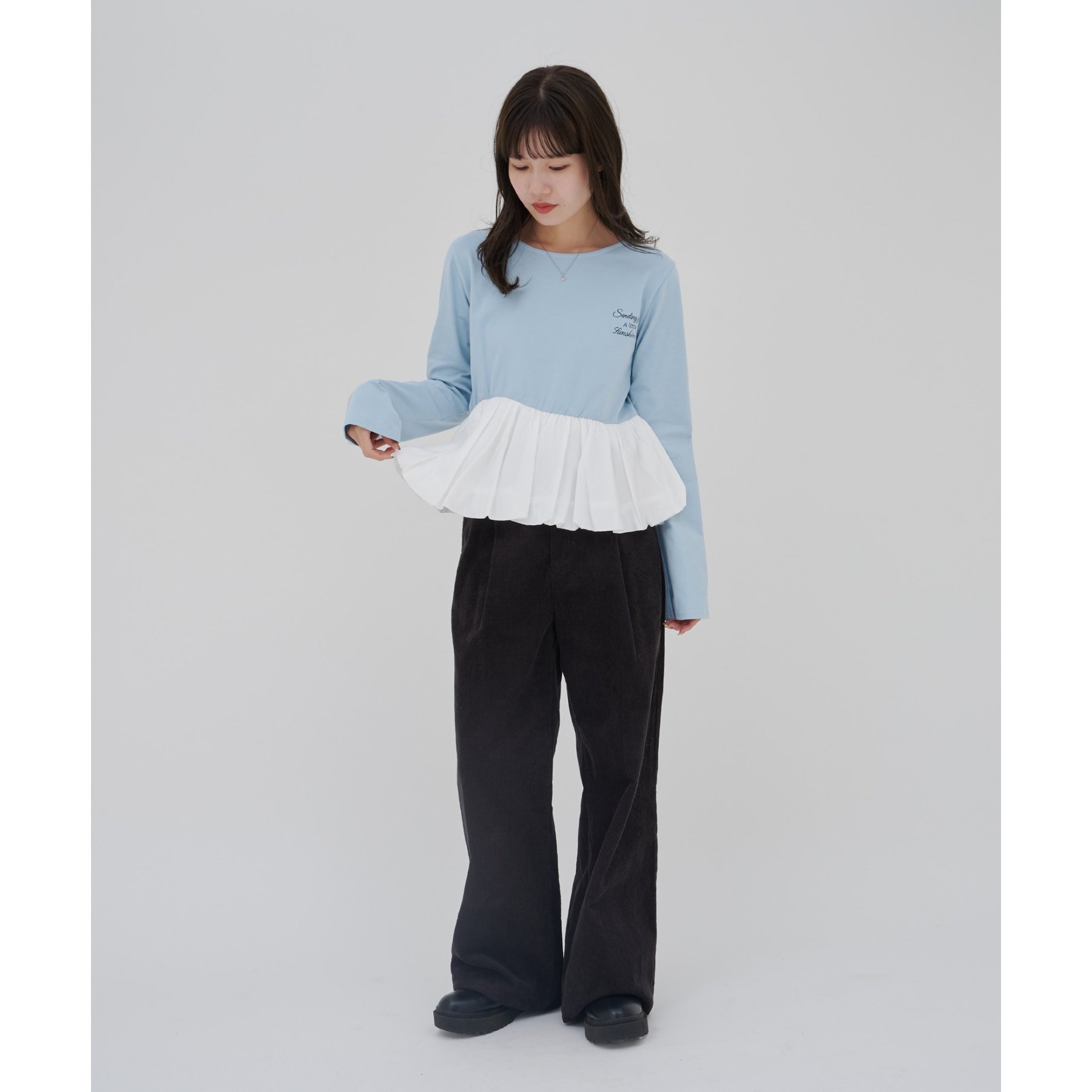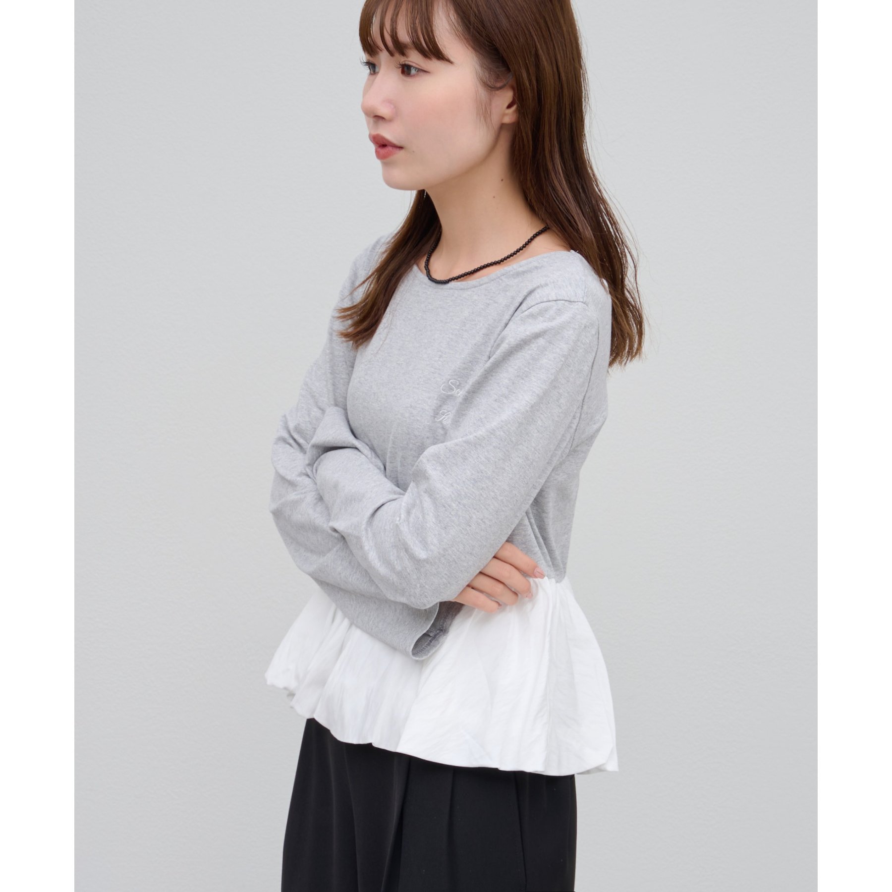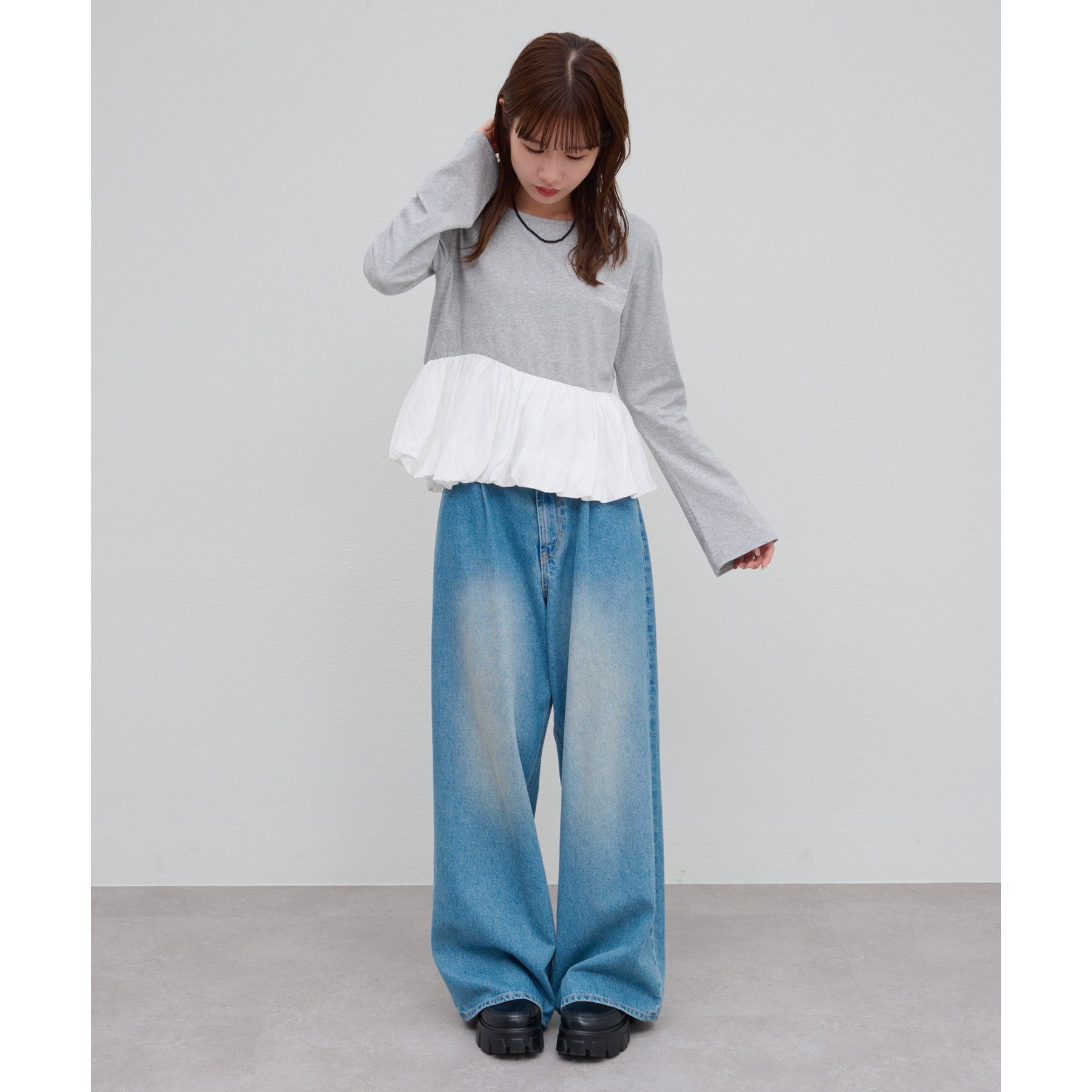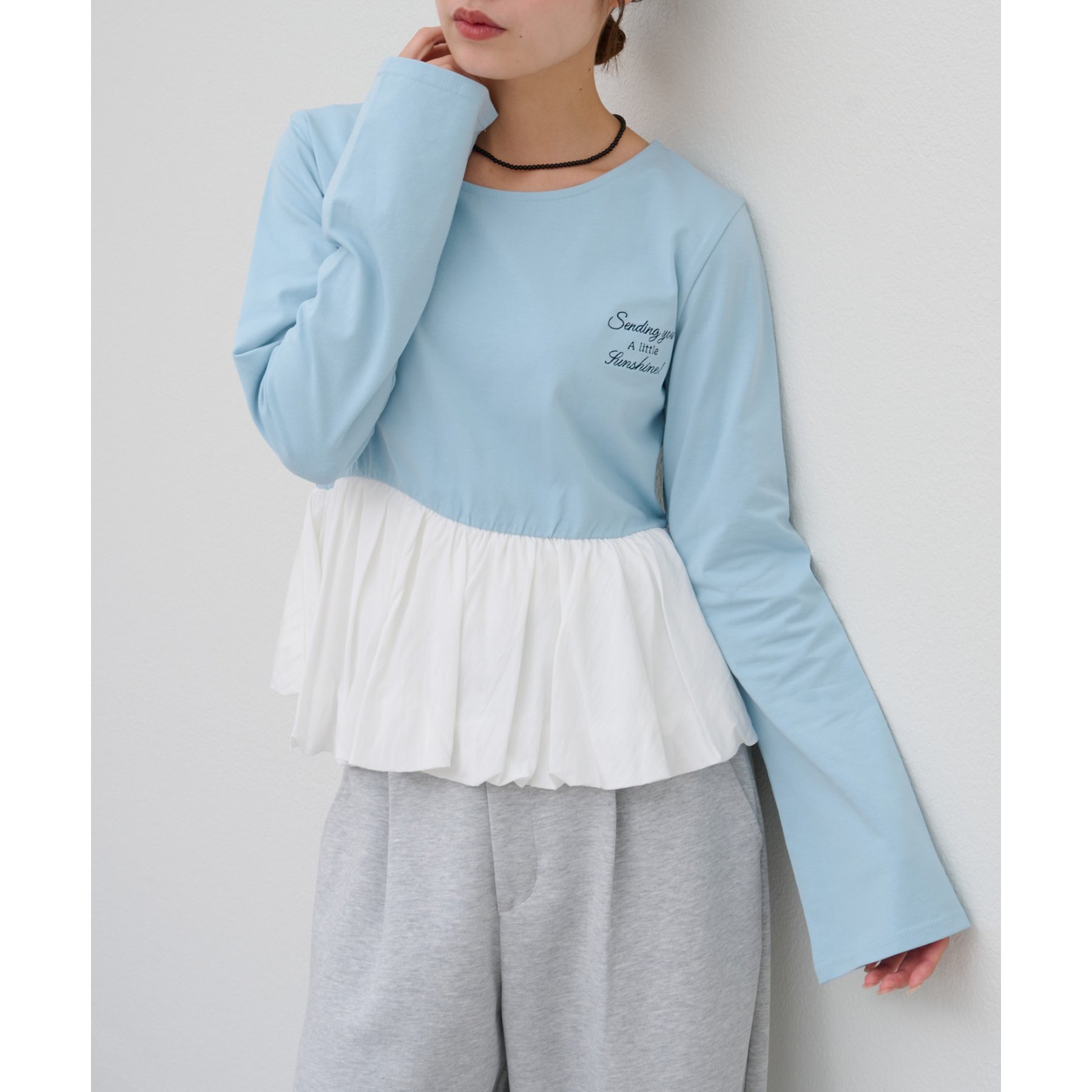 上身頃はスウェットライクなカットソー素材、裾部分はふんわり広がる布帛のバルーンデザインで、異素材の組み合わせがフェミニンな印象をプラスします♪