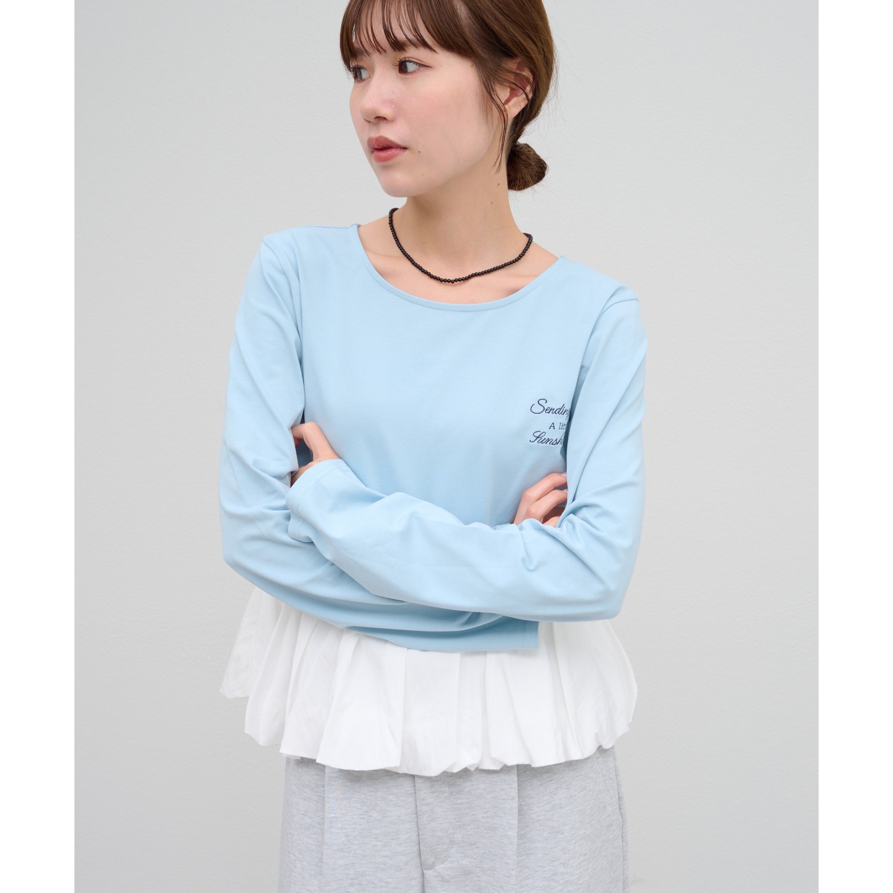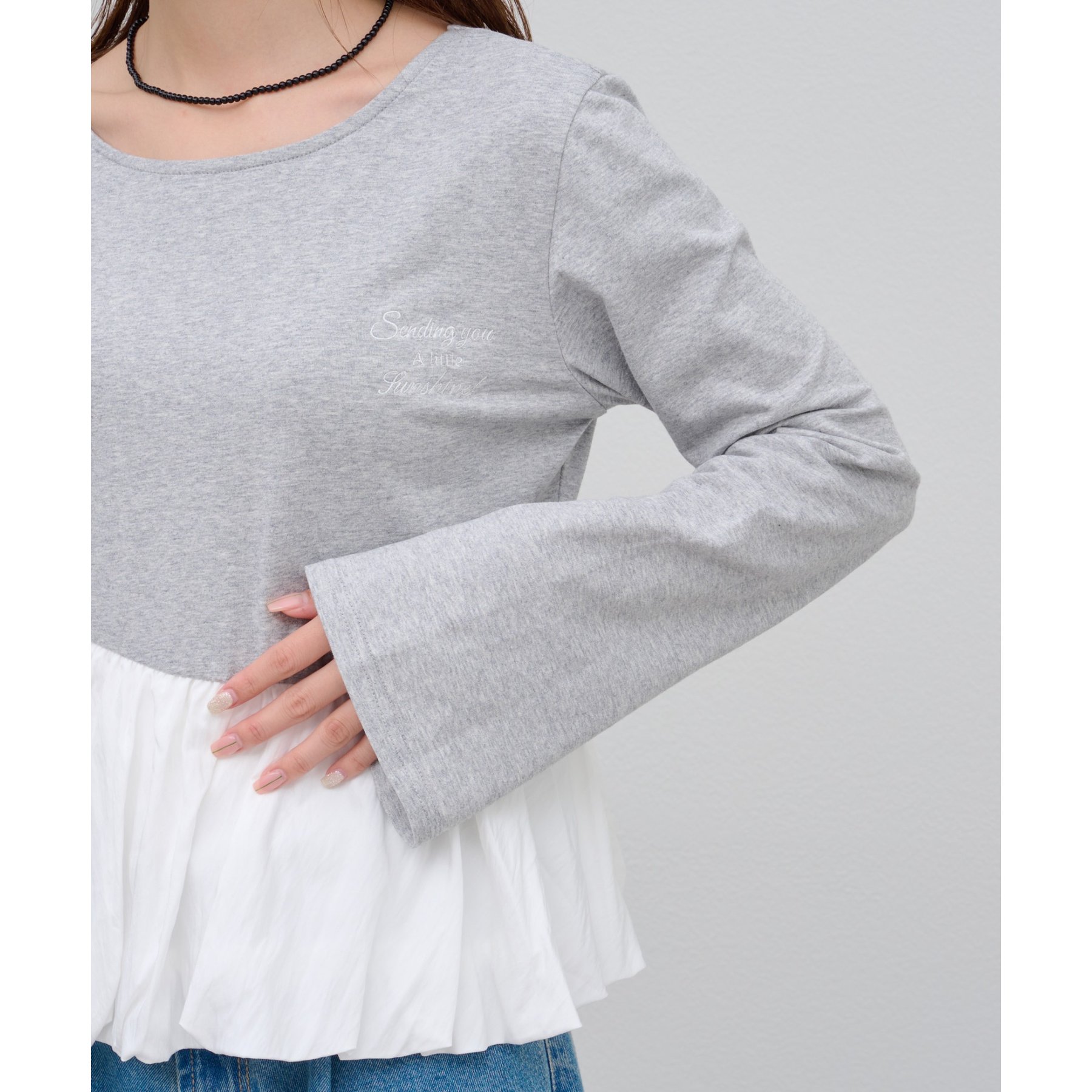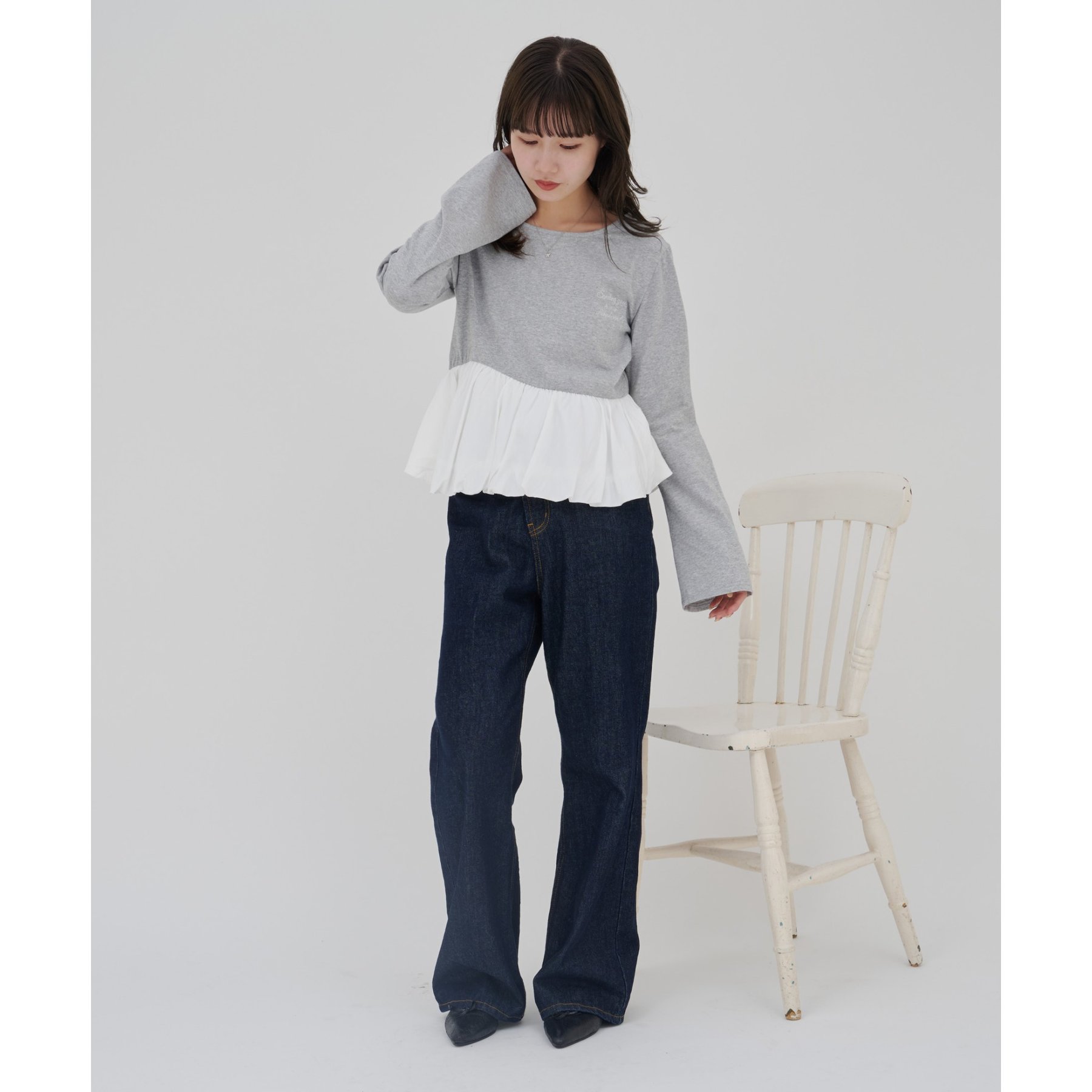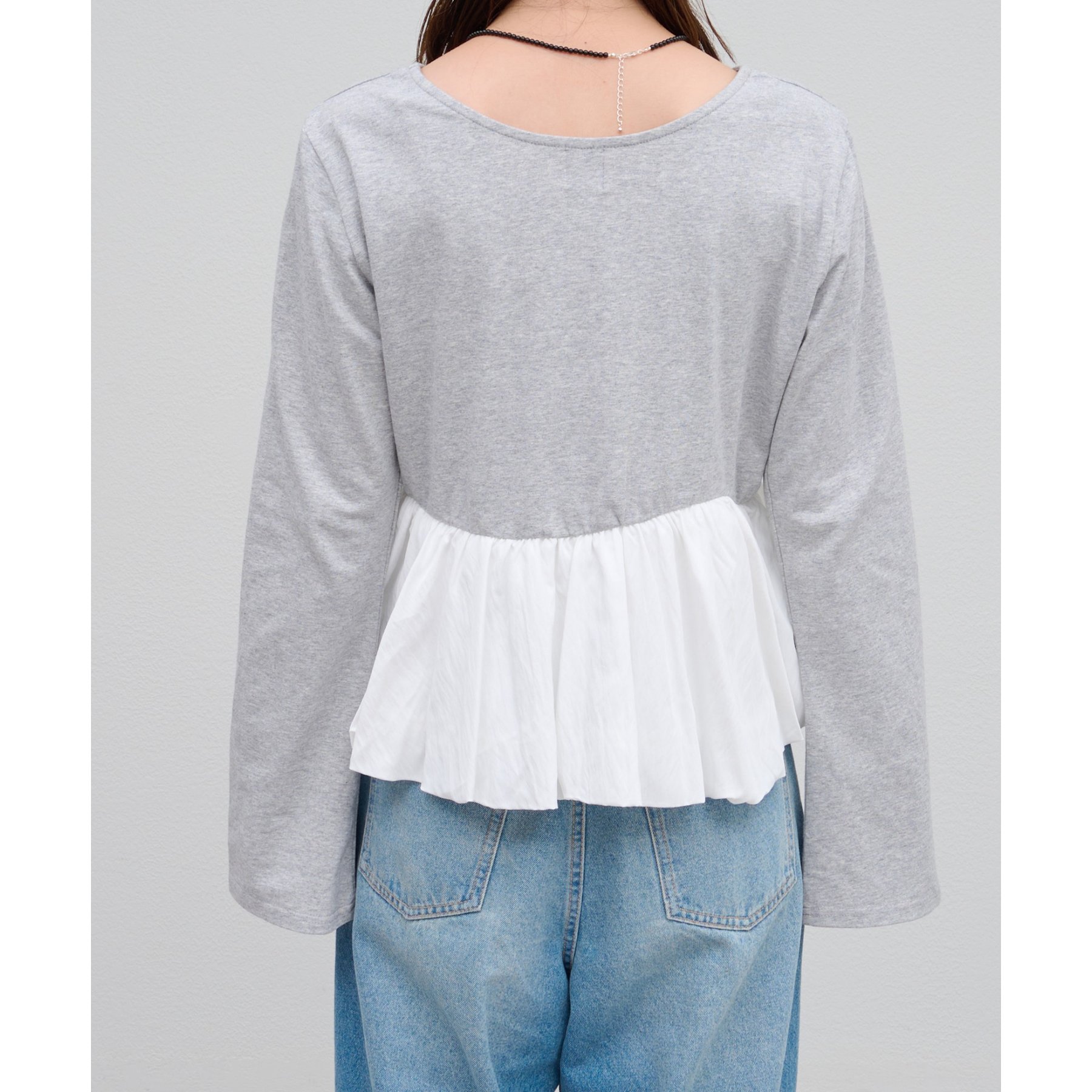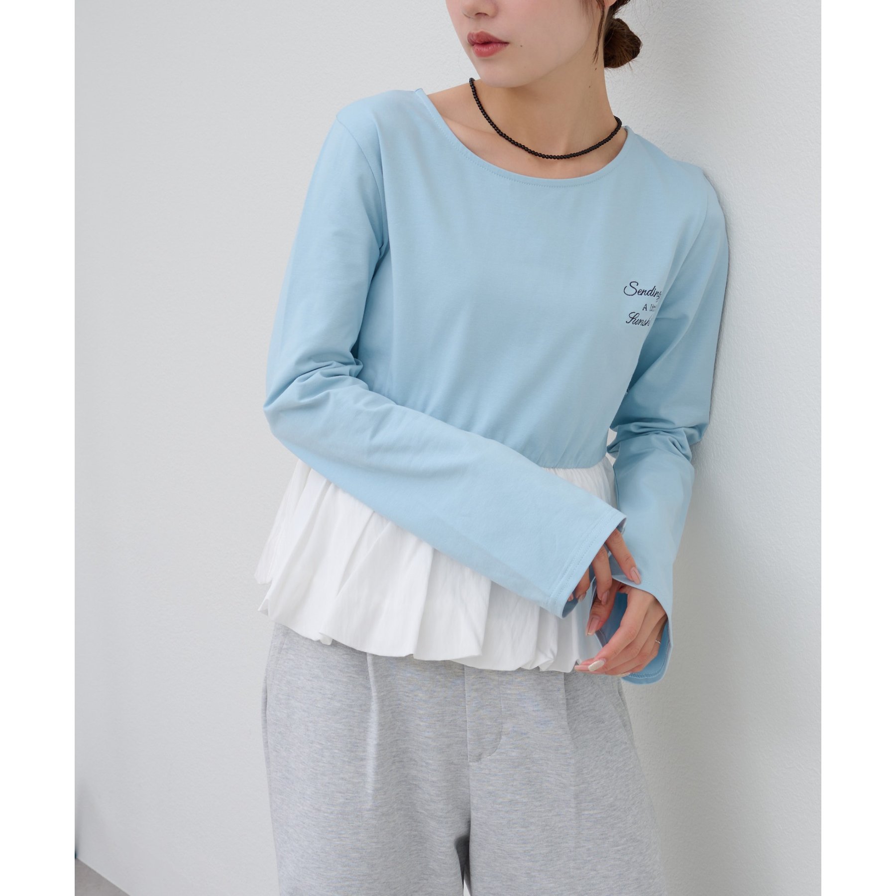 上身頃はスウェットライクなカットソー素材、裾部分はふんわり広がる布帛のバルーンデザインで、異素材の組み合わせがフェミニンな印象をプラスします♪