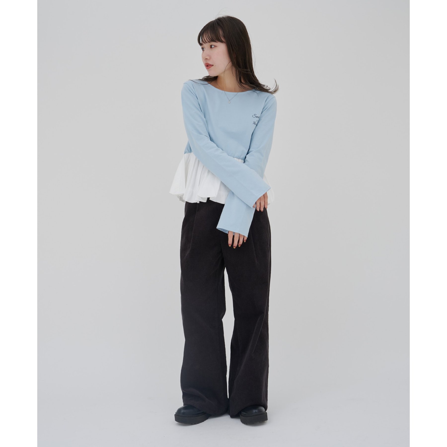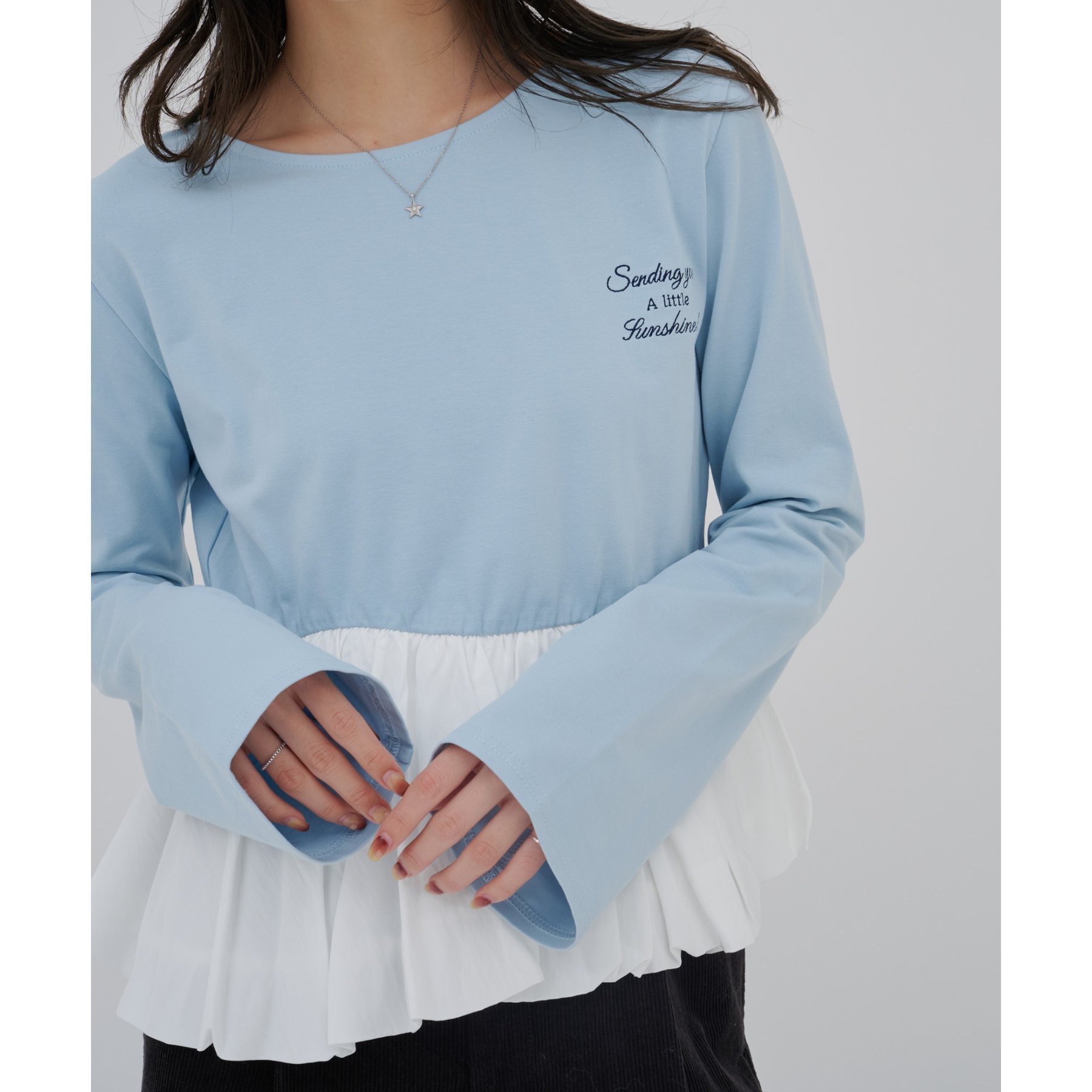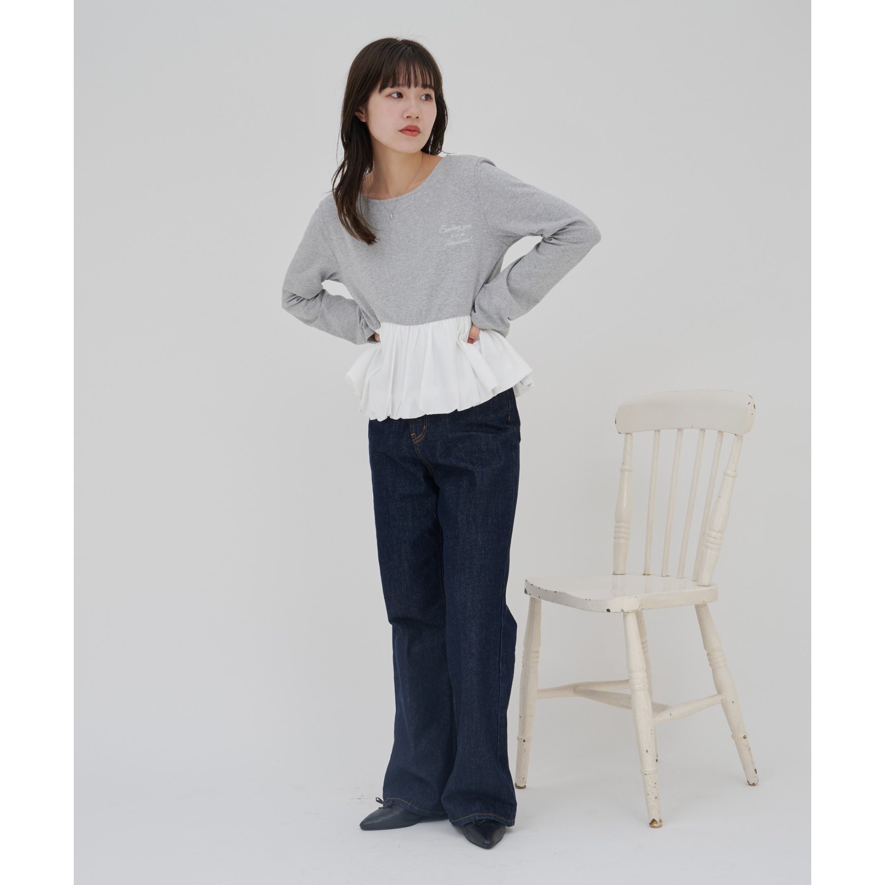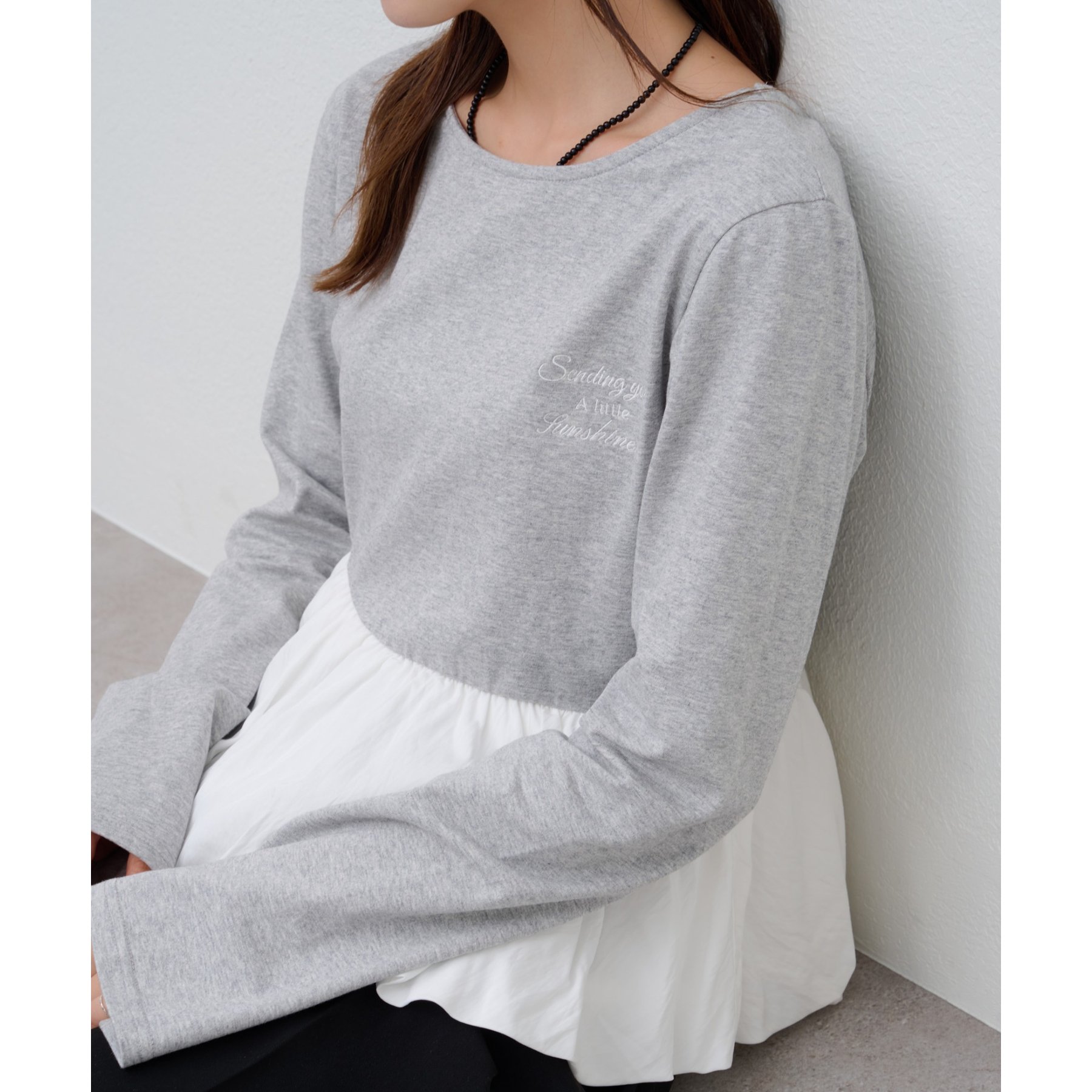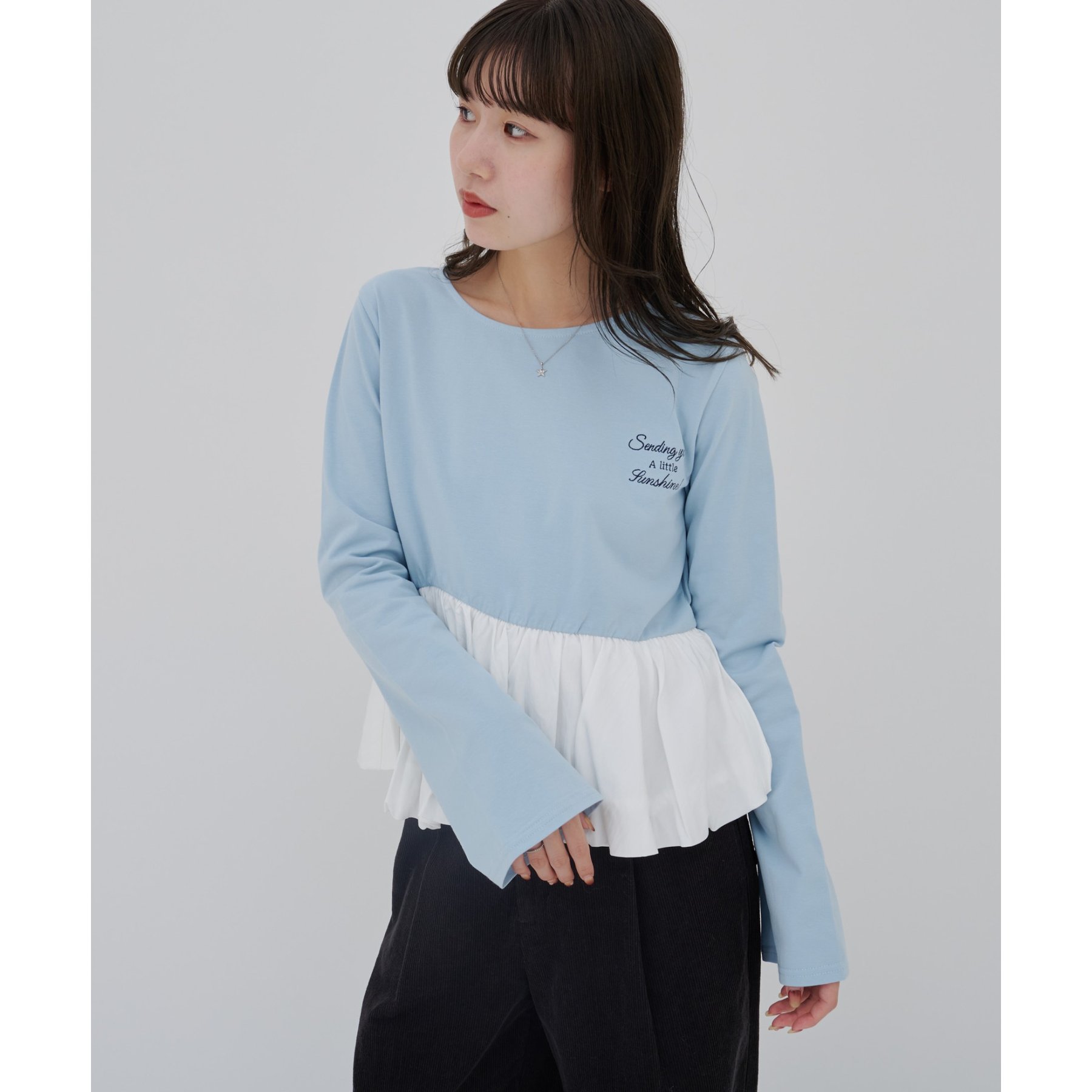 上身頃はスウェットライクなカットソー素材、裾部分はふんわり広がる布帛のバルーンデザインで、異素材の組み合わせがフェミニンな印象をプラスします♪