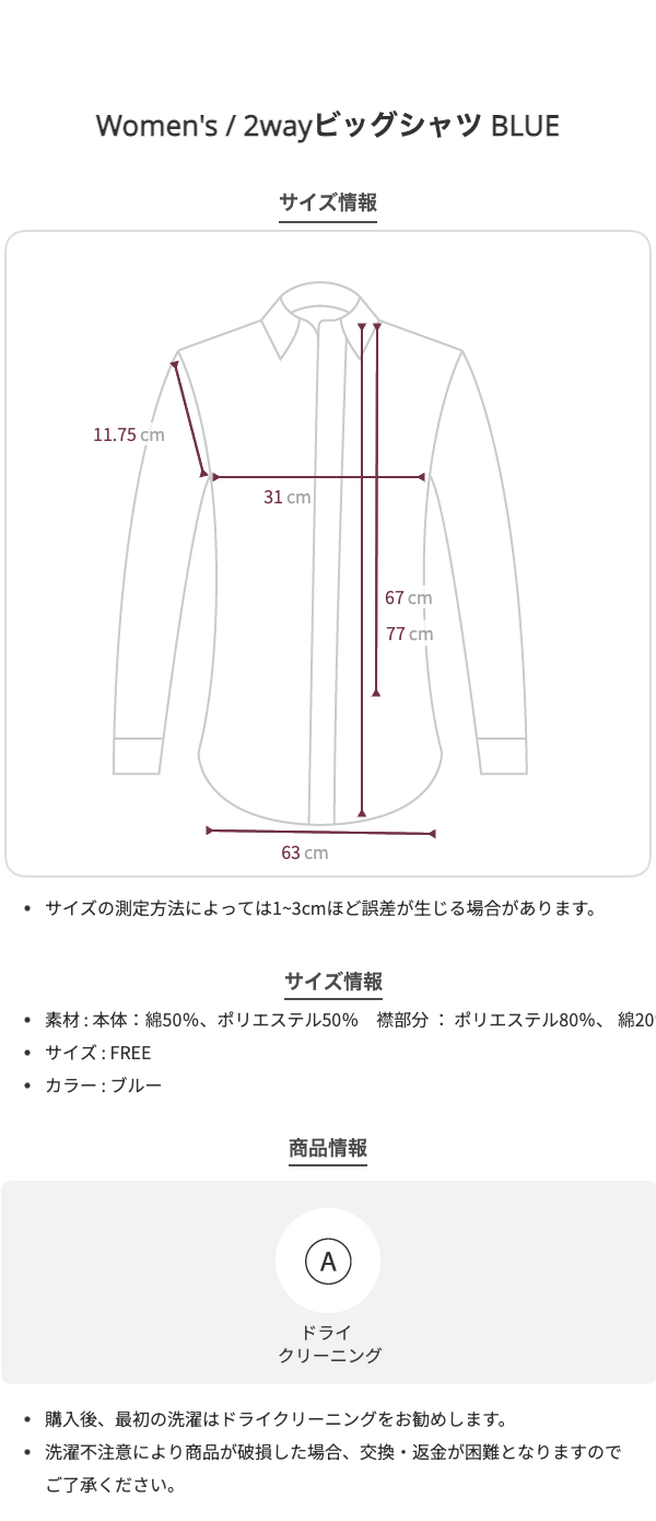 本体 綿50% ポリエステル50% 刺繍糸 ポリエステル100% 襟部分 本体 ポリエステル80% 綿20% 襟部分 レース ポリエステル100% |