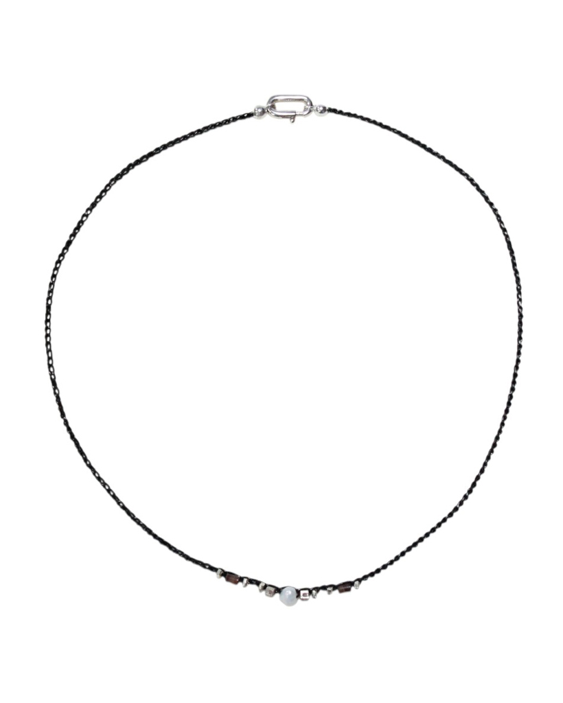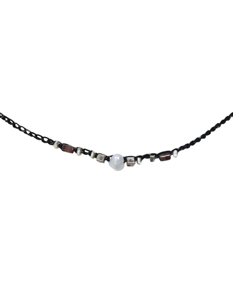 -天然パールと白蝶貝、カレンシルバーを組み合わせ、ヴィンテージ感とモダンなムードを漂わせます。