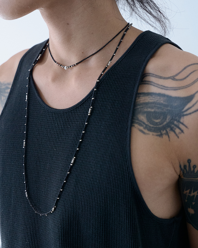 -金属ではなく、高品質のメタル糸を使用して仕立てた、クロシェのネックレス兼ボディチェーンです。