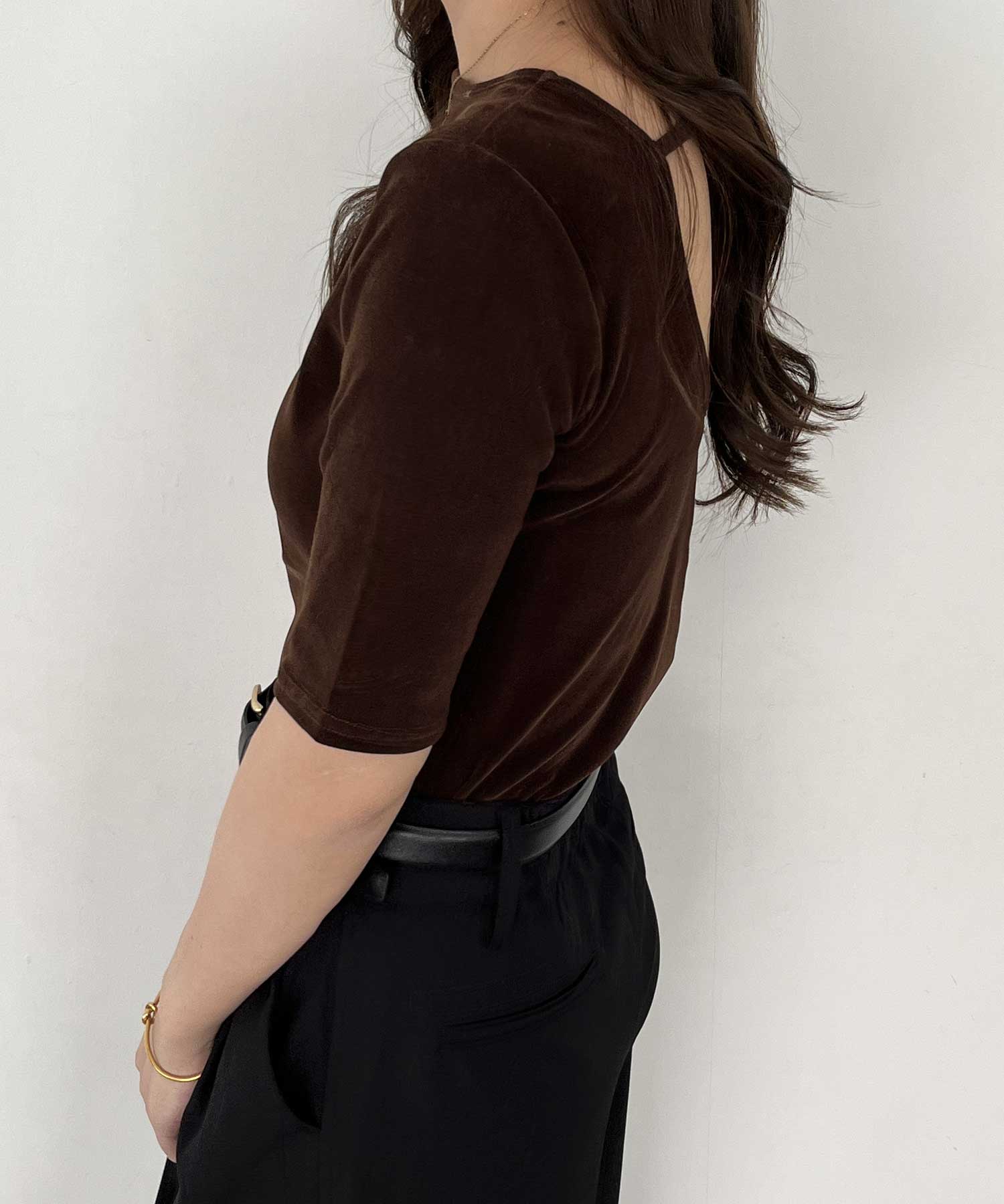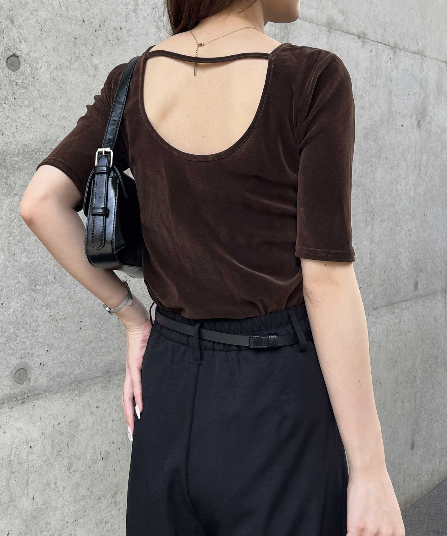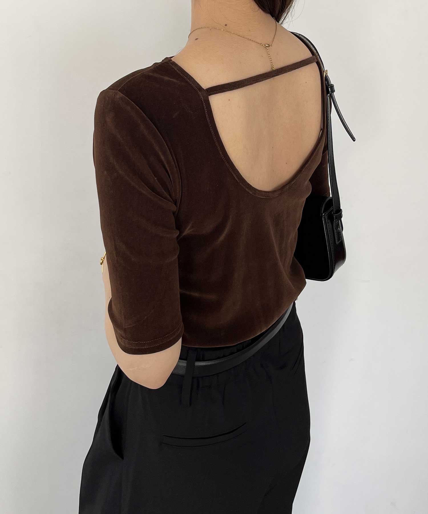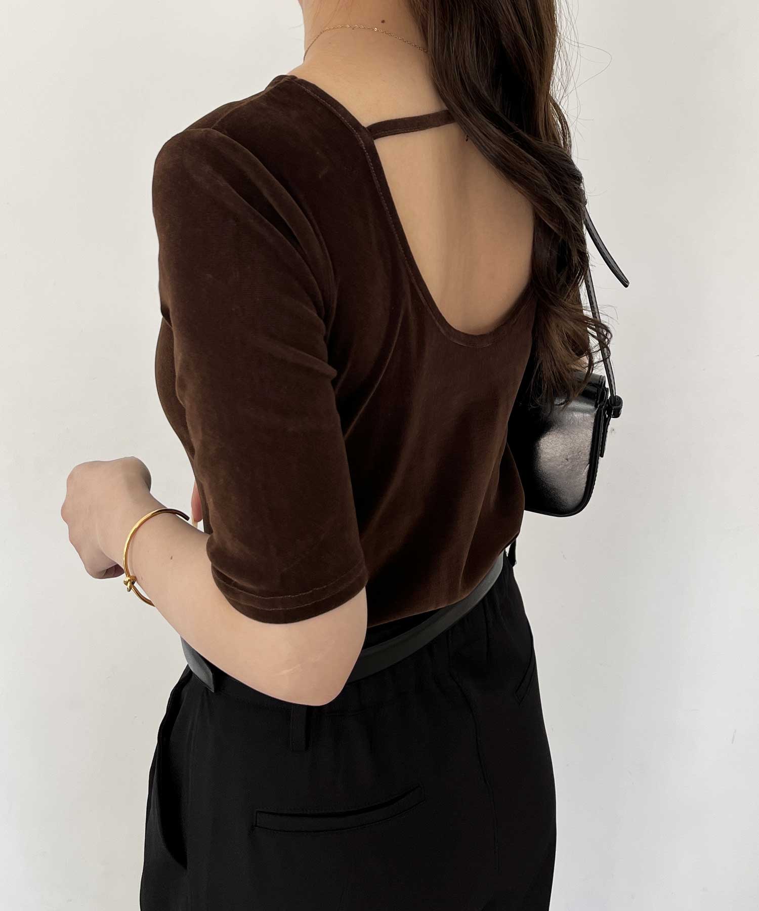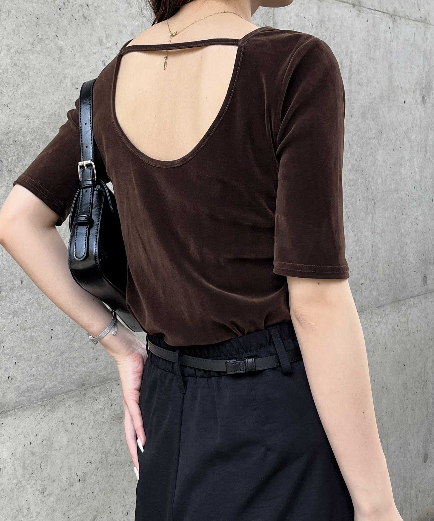 深めのバックオープンデザインが大人可愛い、ヘルシーな華奢見せが叶うベロアアイテムです。