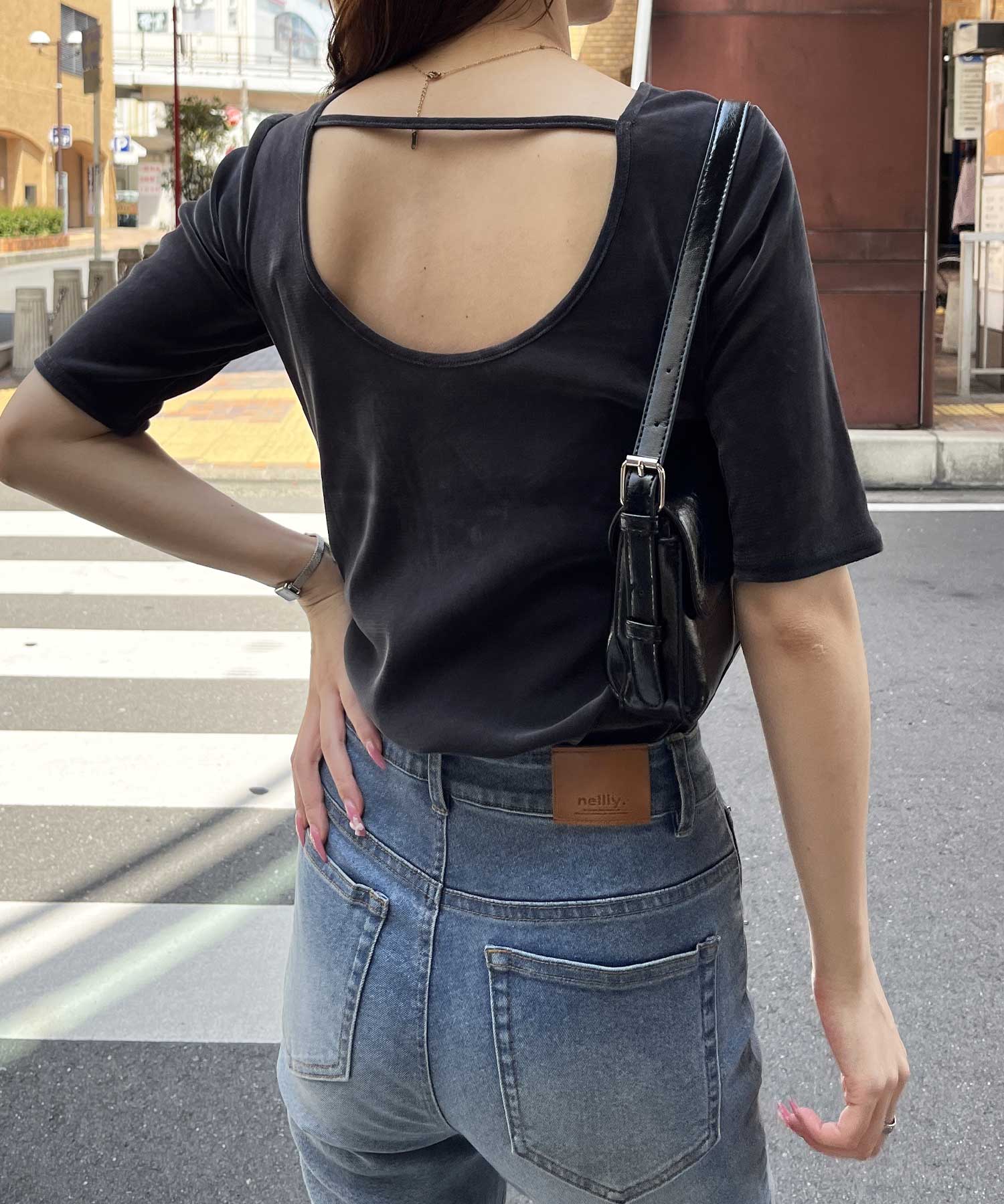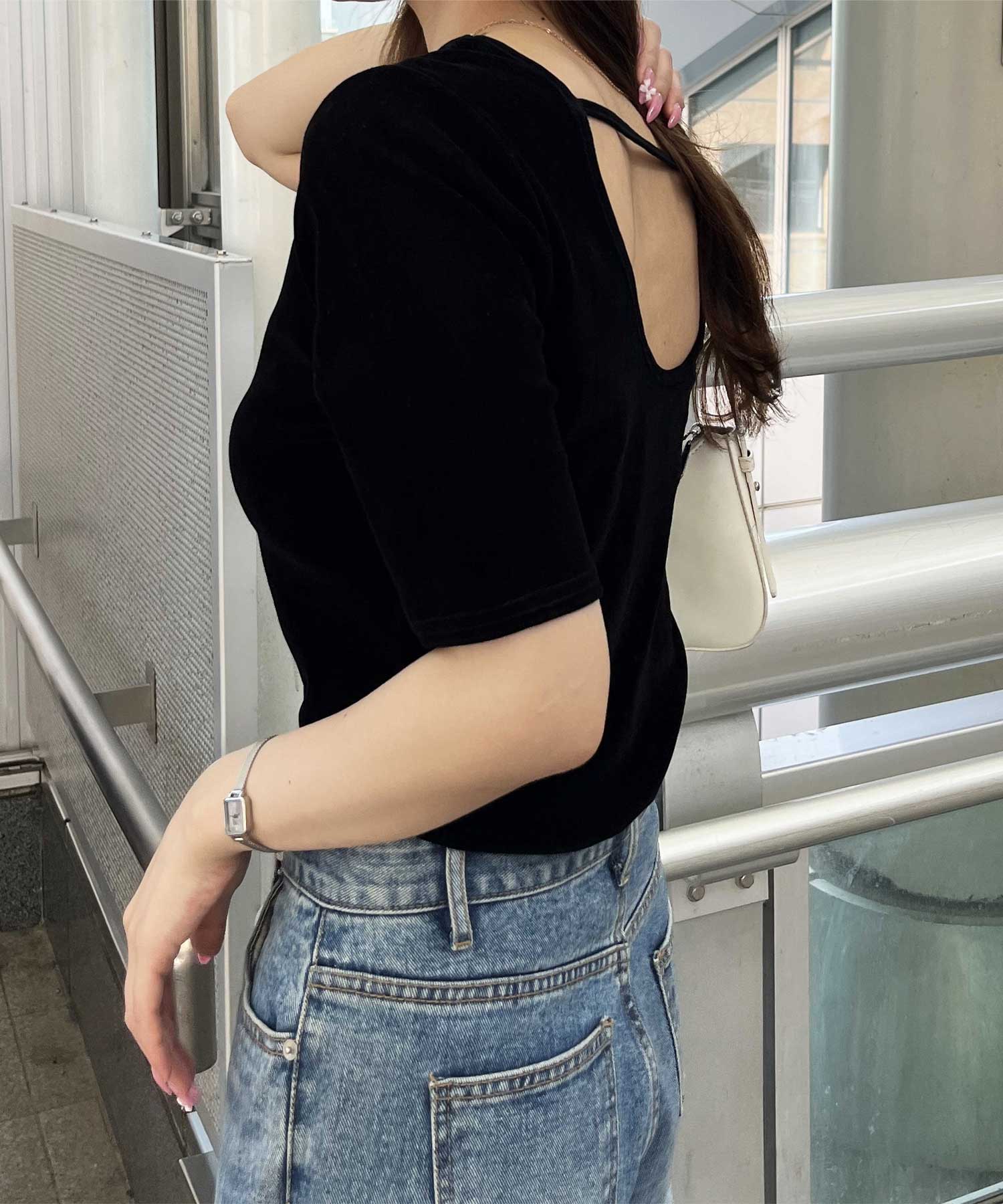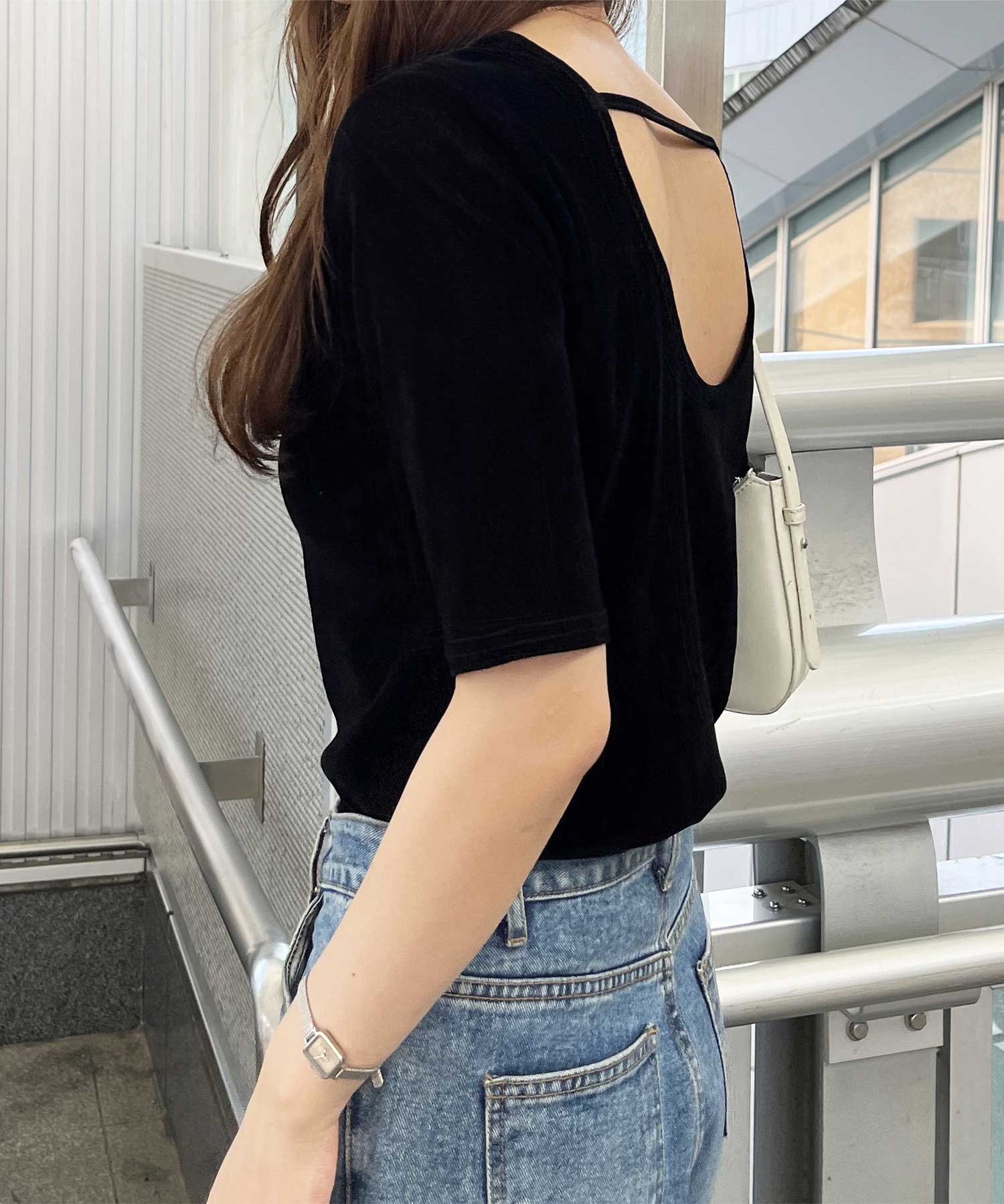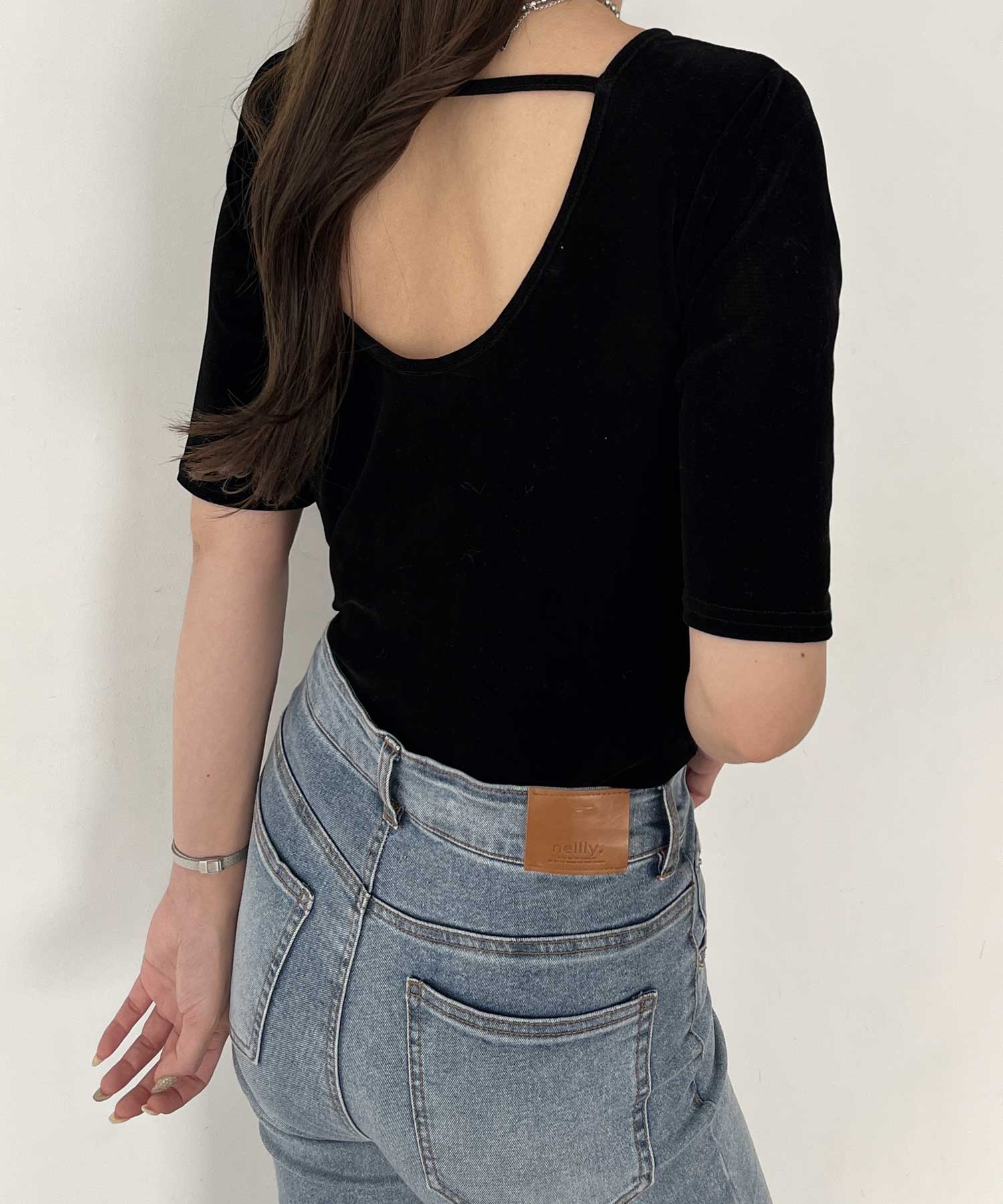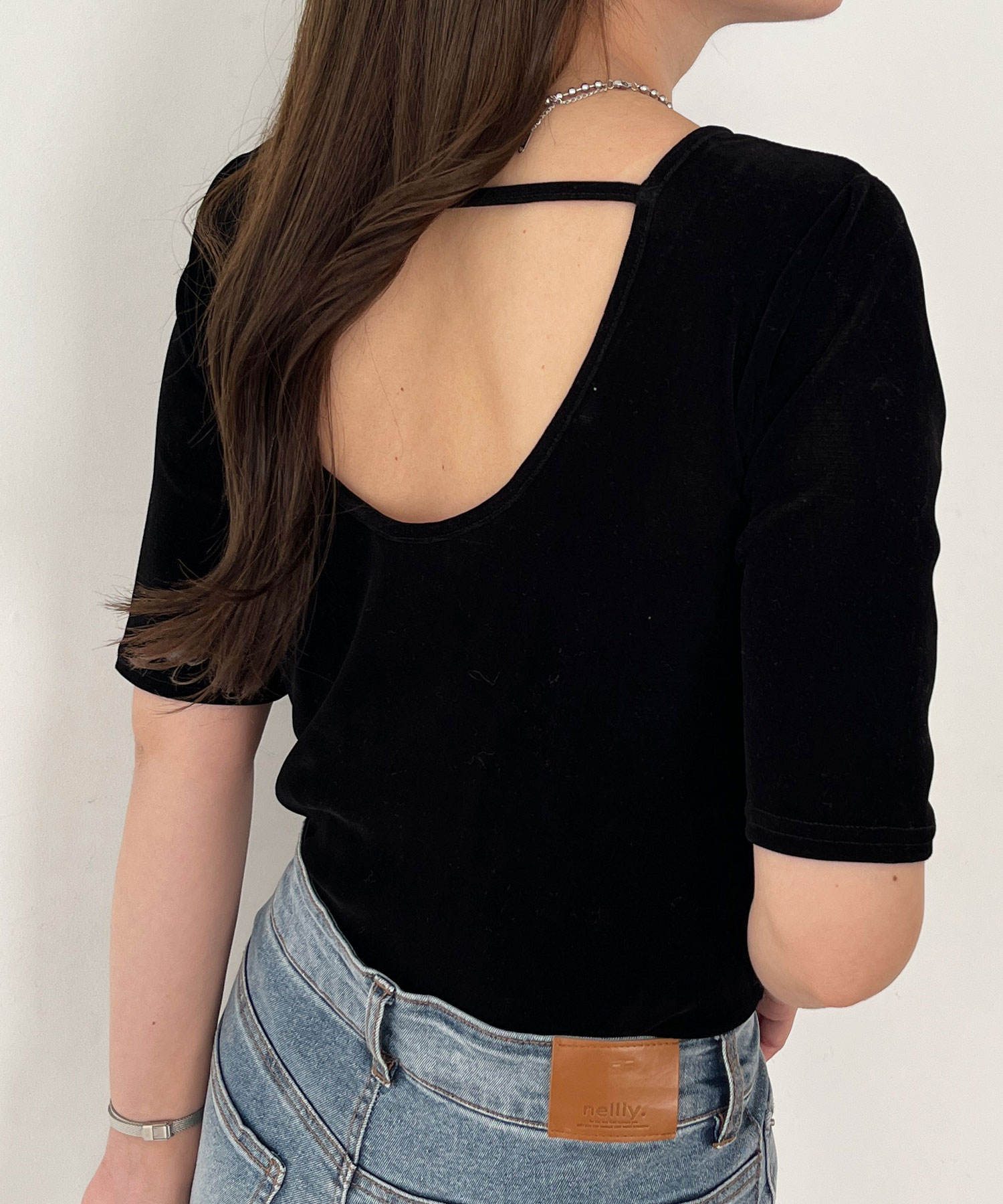 深めのバックオープンデザインが大人可愛い、ヘルシーな華奢見せが叶うベロアアイテムです。