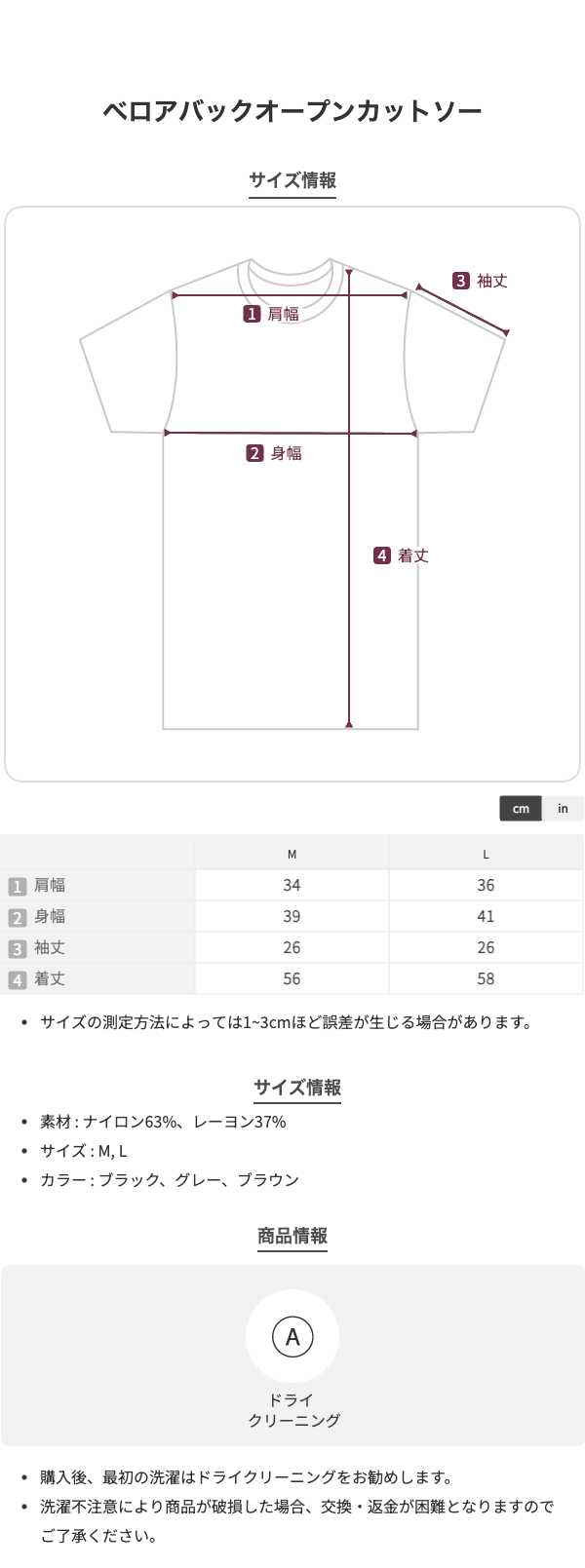 M:バスト78、肩幅34、前身丈56、袖丈26