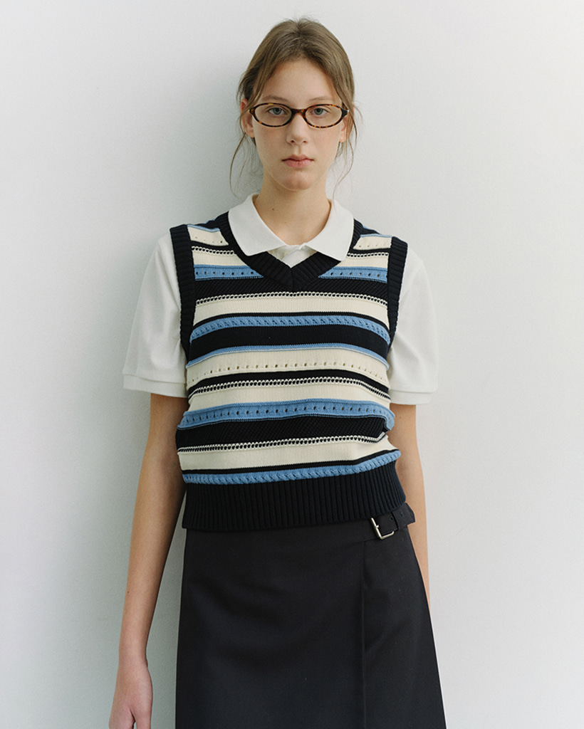 UNISEX CRAFTED STRIPED KNIT VEST NAVY CREAM_UDSW6B123N2