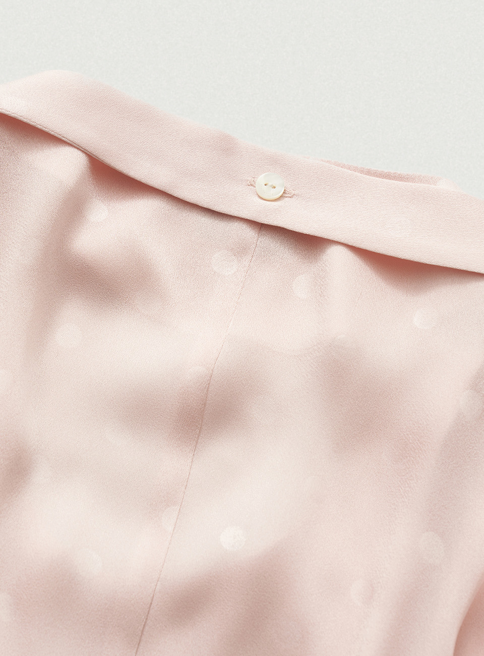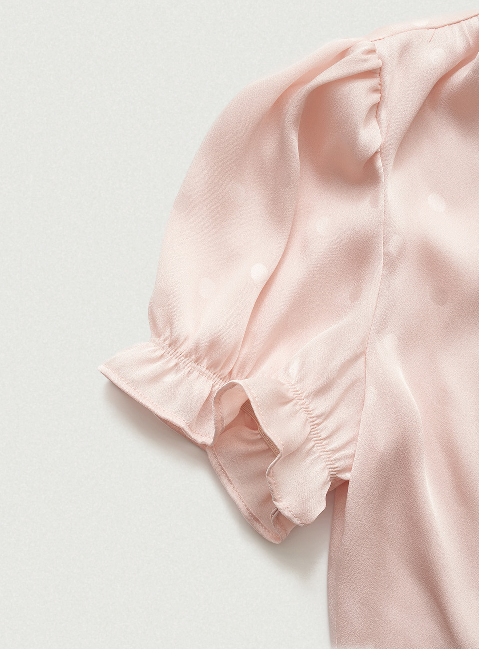 "ピンクカラーで、生地特有の上品な光沢感とドットパターンが際立つファブリック。