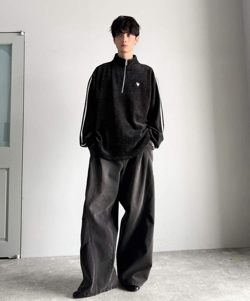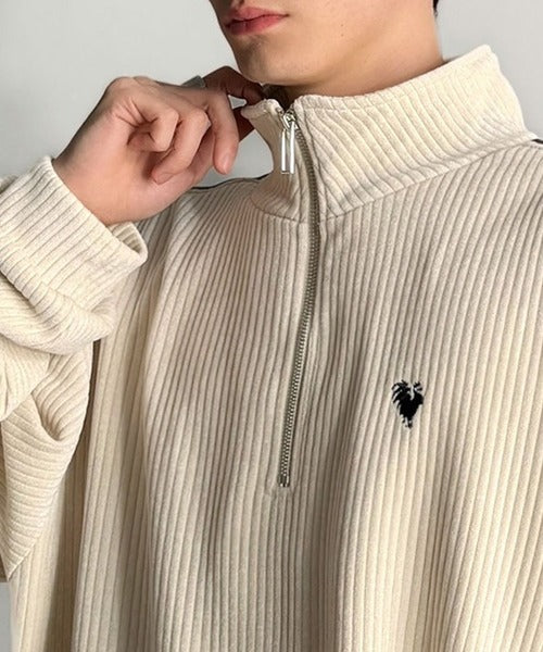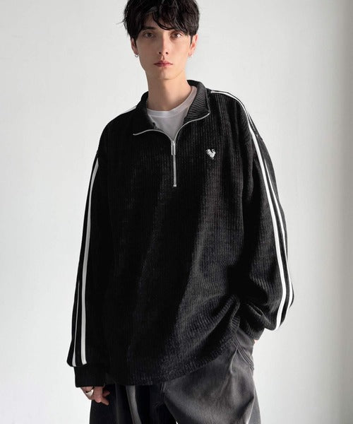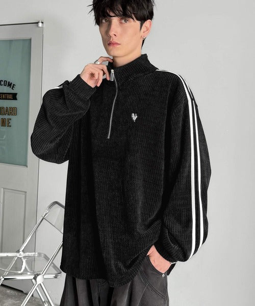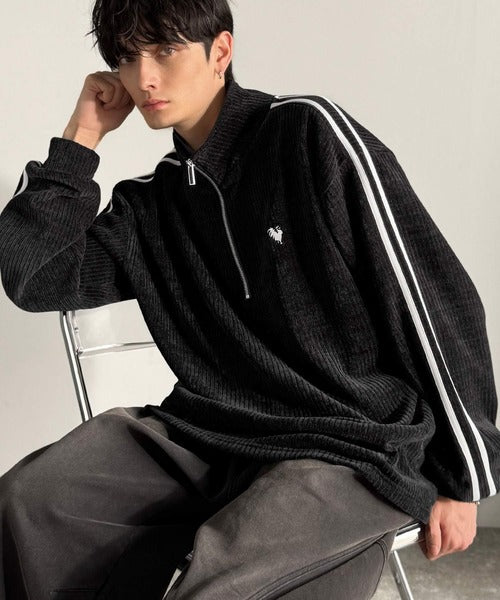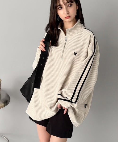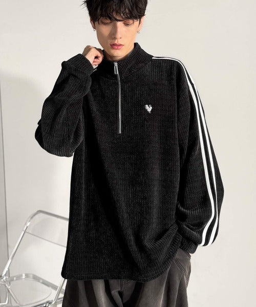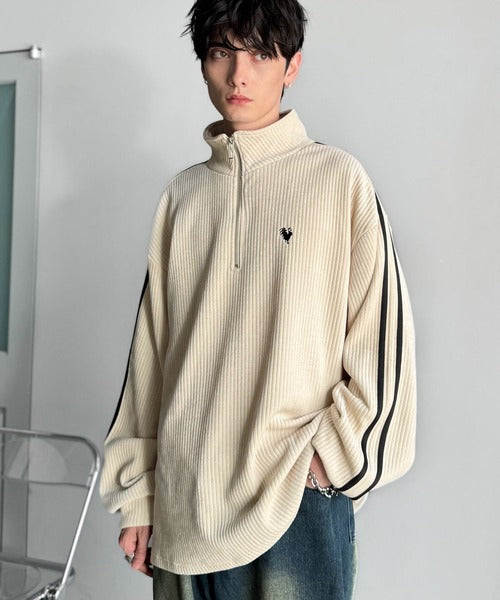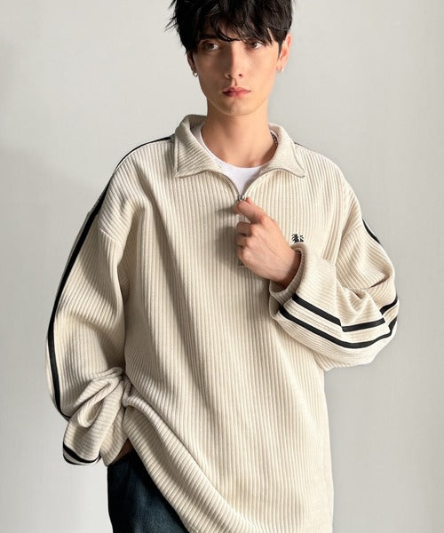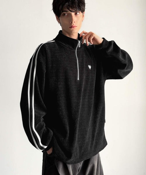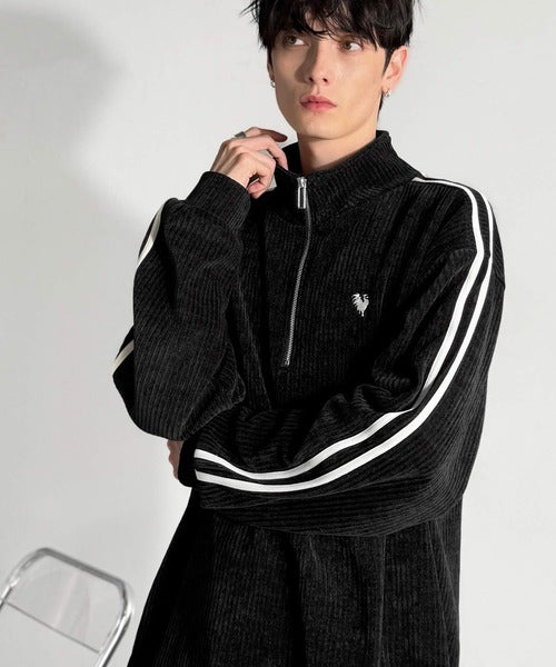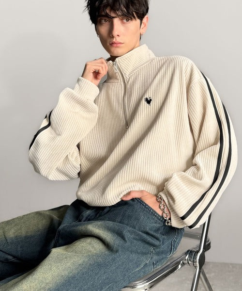 コーデュロイ素材Wラインハーフジップトレーナー」
