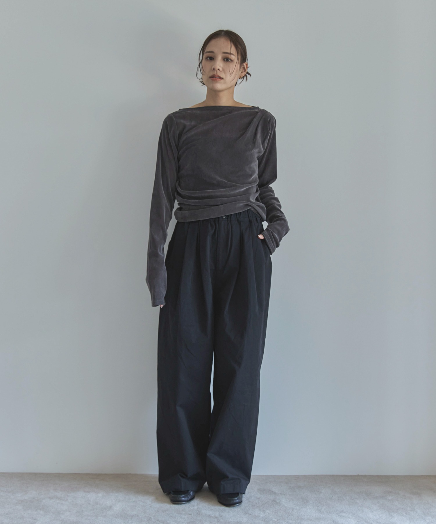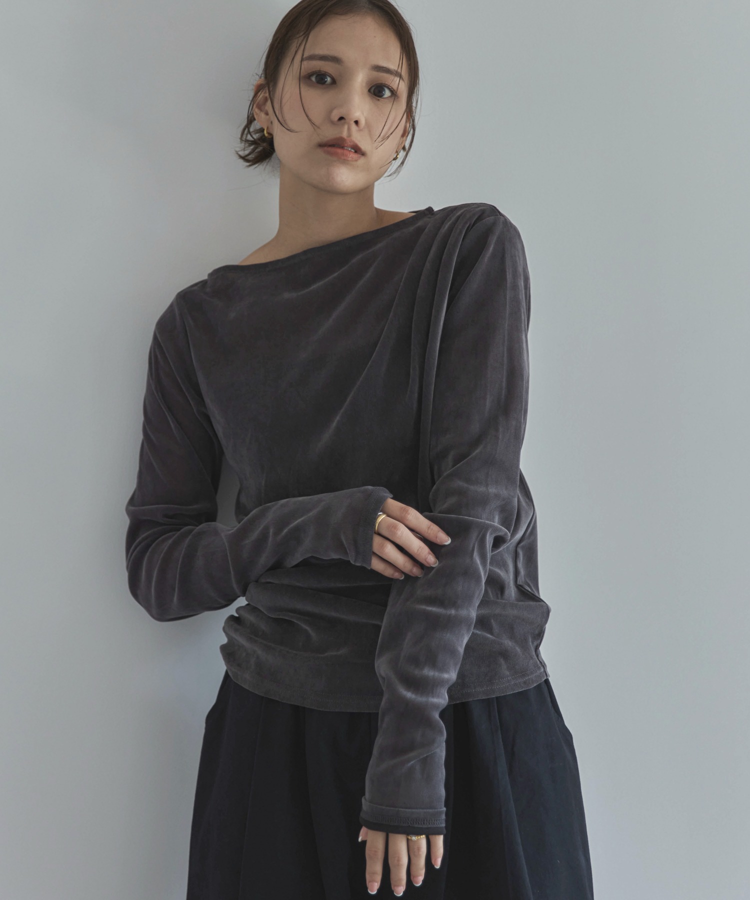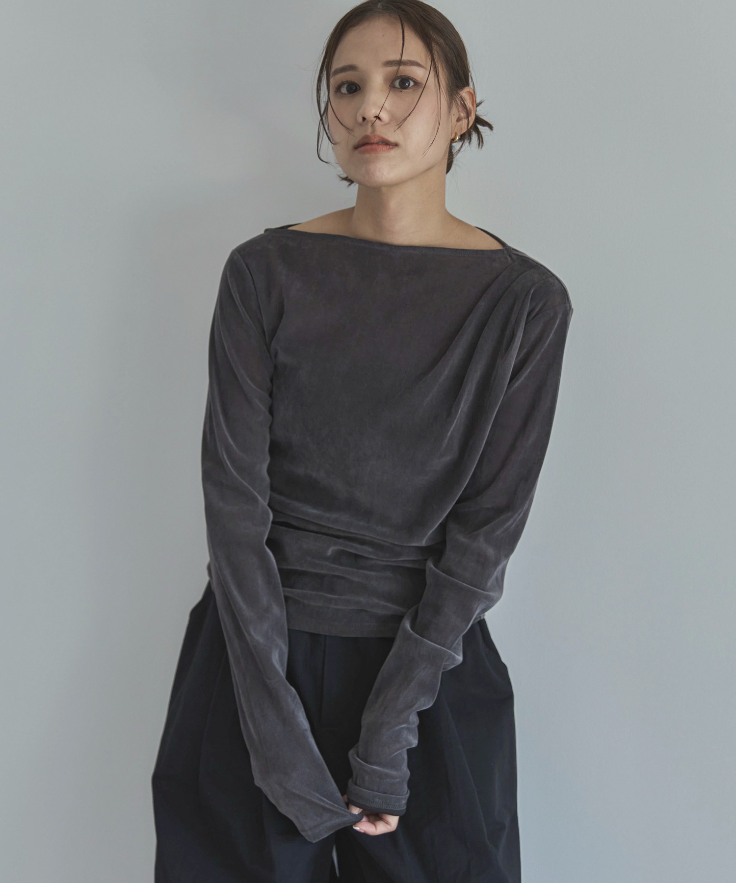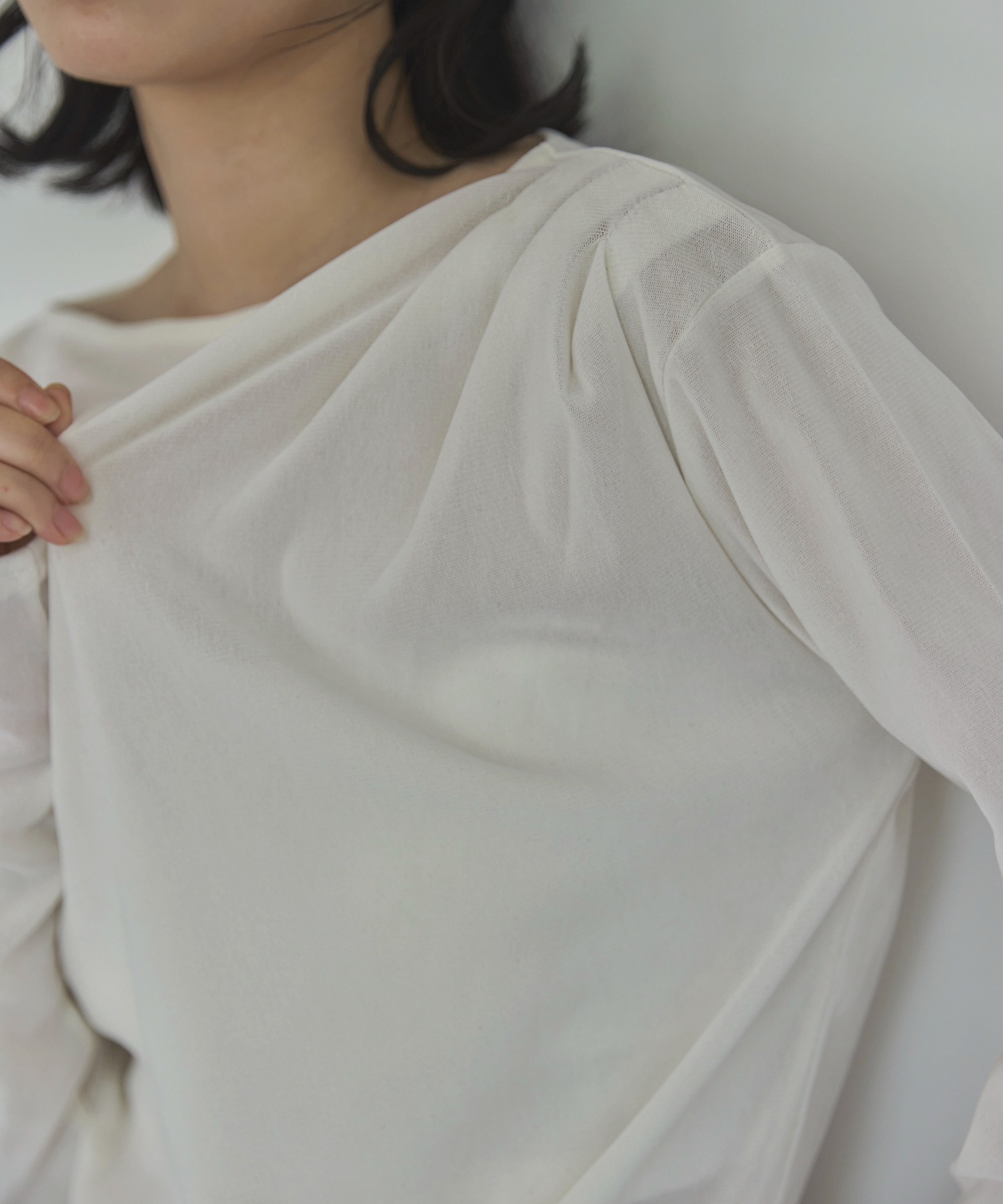 左肩にタックと右脇下にギャザーを寄せたニュアンス感のあるデザインが特徴で、一枚でもサマになるほど雰囲気のあるアイテムです。