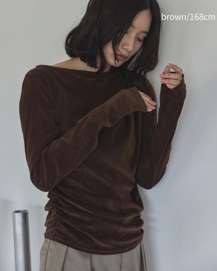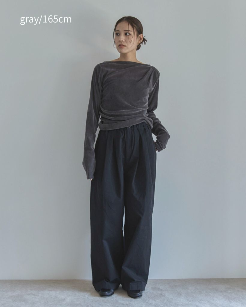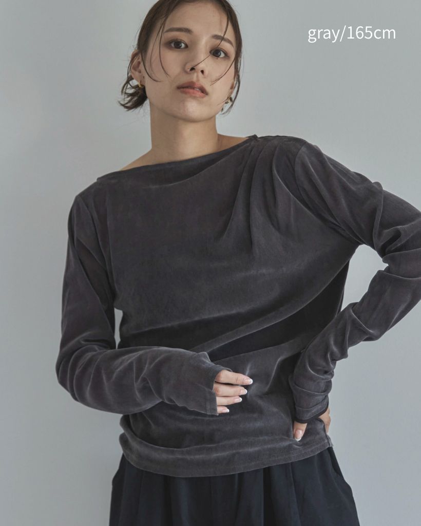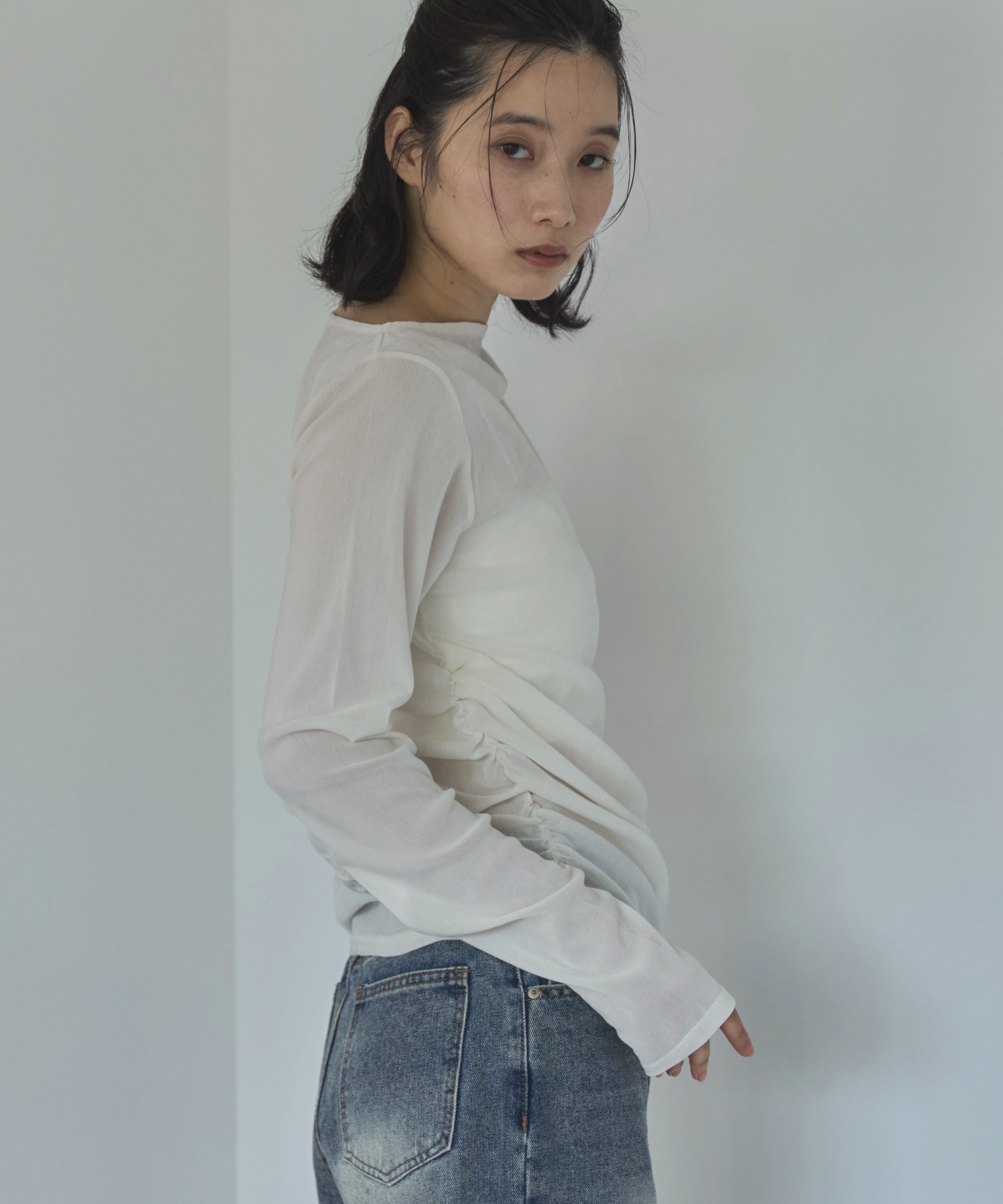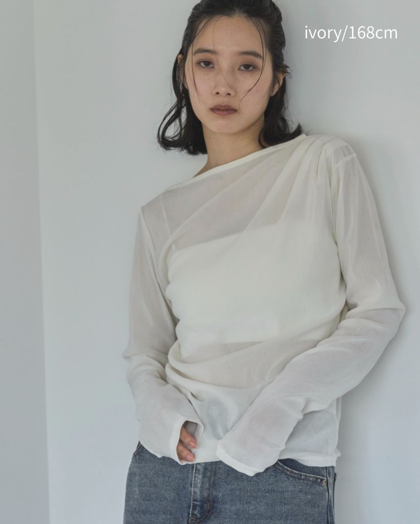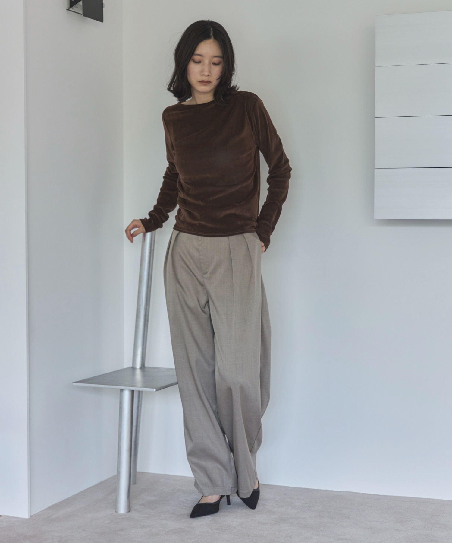 左肩にタックと右脇下にギャザーを寄せたニュアンス感のあるデザインが特徴で、一枚でもサマになるほど雰囲気のあるアイテムです。