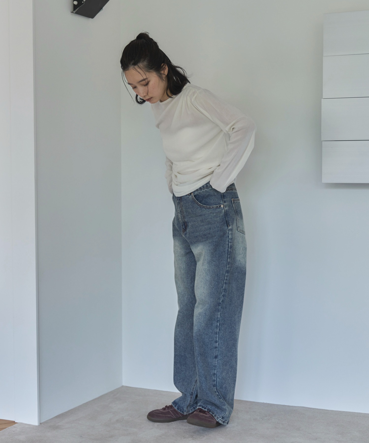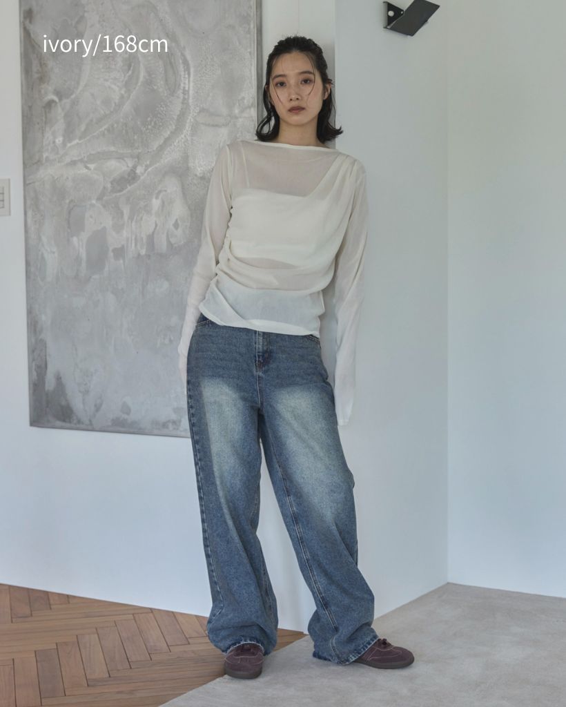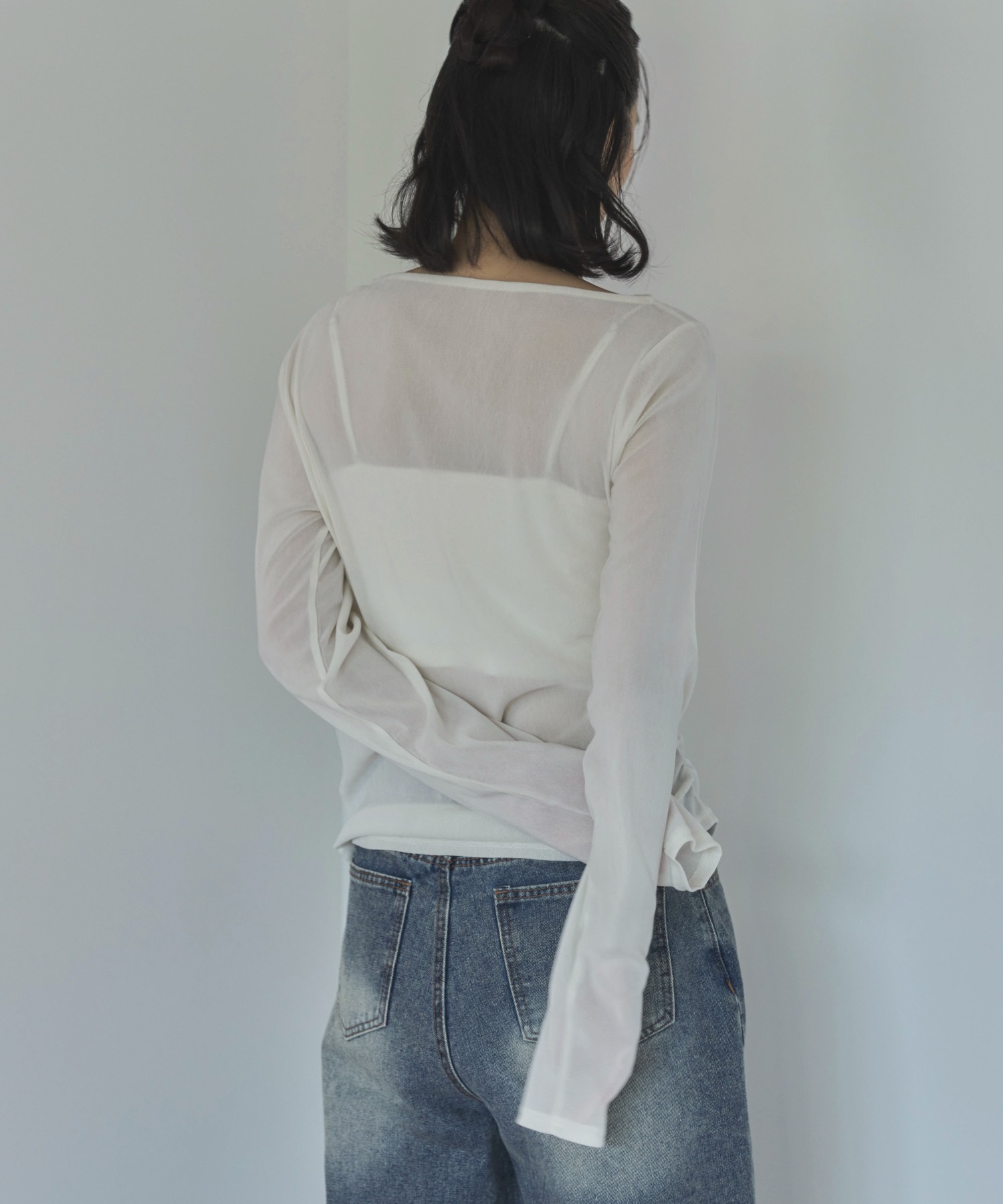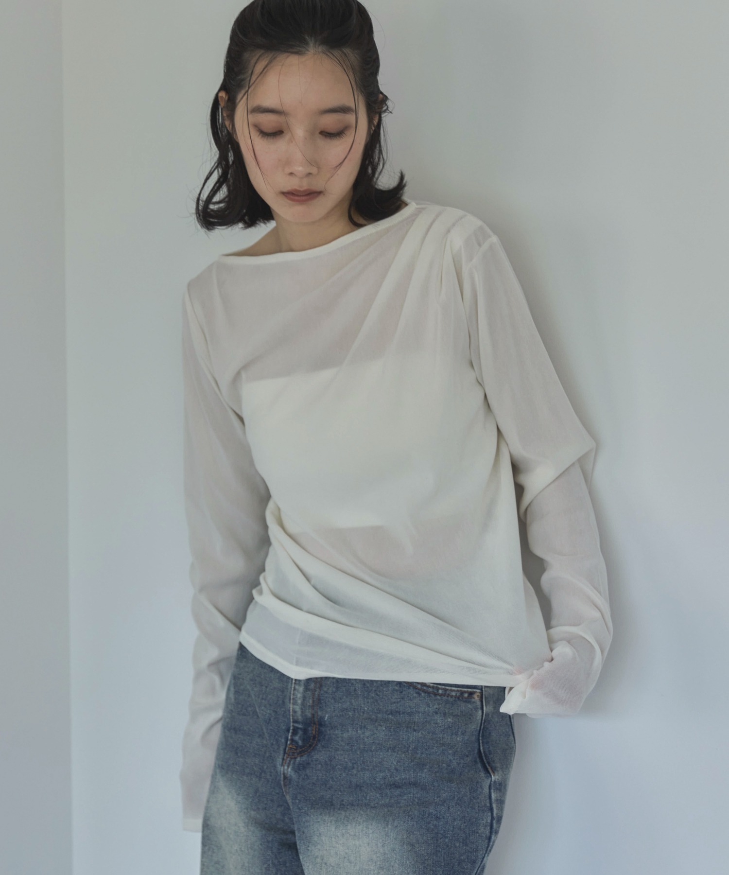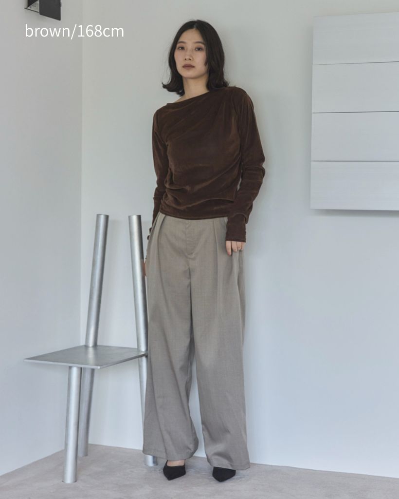 左肩にタックと右脇下にギャザーを寄せたニュアンス感のあるデザインが特徴で、一枚でもサマになるほど雰囲気のあるアイテムです。